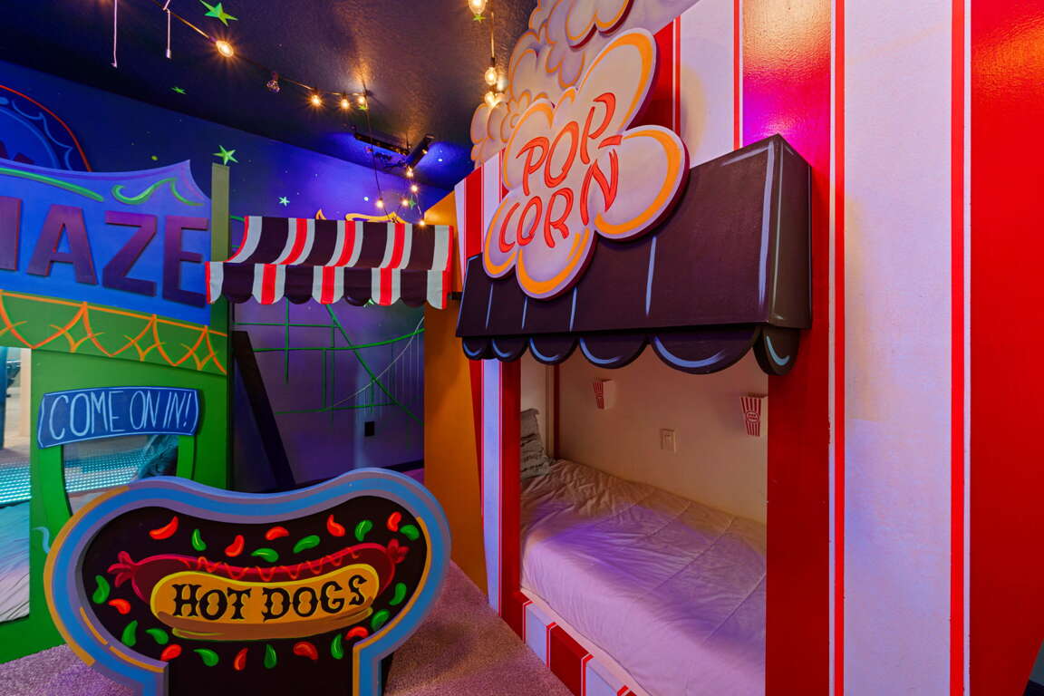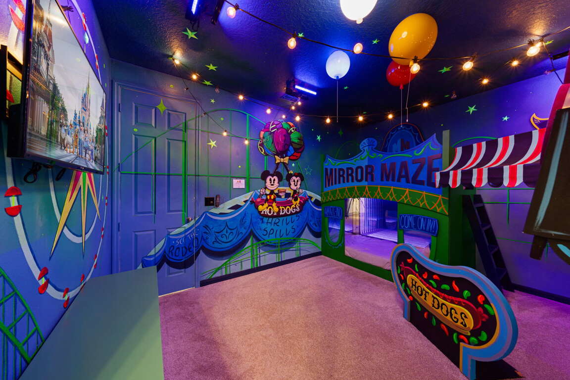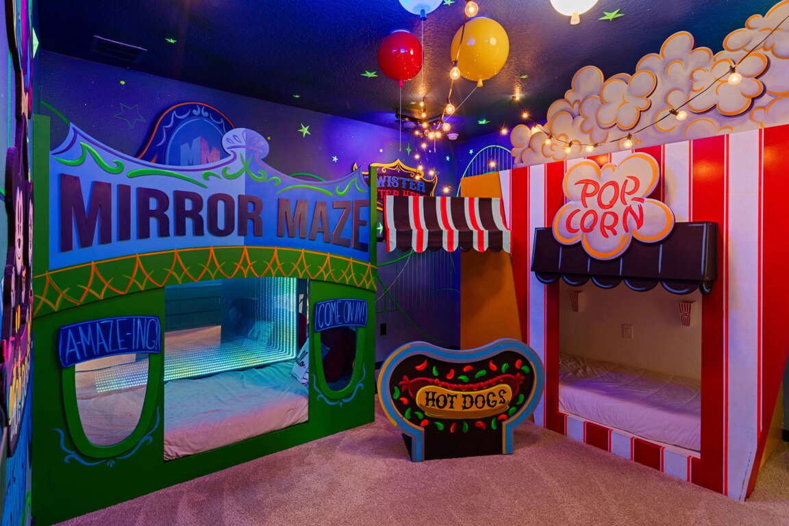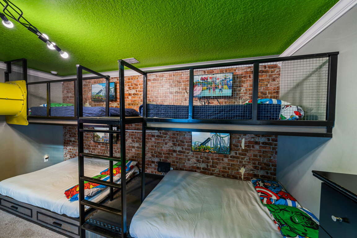 What truly sets Epic Solara Playhouse apart are its custom-designed kids’ bunk rooms, each created as an experience of its own. One bunk room features a mirror maze concept with black lighting, glowing details, and interactive elements that turn bedtime into an adventure. The second bunk room is a superhero-inspired escape, complete with a swirling slide that leads directly into a foam pit, giving kids a space that feels more like a play attraction than a bedroom. These rooms are not just places to sleep — they are unforgettable highlights of the home and often the most talked-about part of the stay.