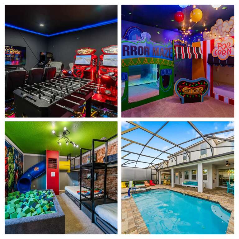 The New Epic Solara Playhouse offers a unique place to stay in Kissimmee, FL, equipped with an Arcade, Custom Bunks, and a Theater.