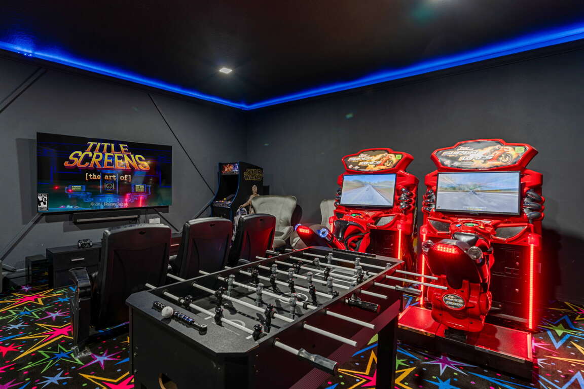 Entertainment continues well beyond the bedrooms in the home’s private movie room and arcade. Designed for all ages, this space is perfect for movie nights, gaming marathons, and friendly competition, offering hours of fun without ever leaving the house. It’s the ideal setup for evenings in or downtime between adventures.