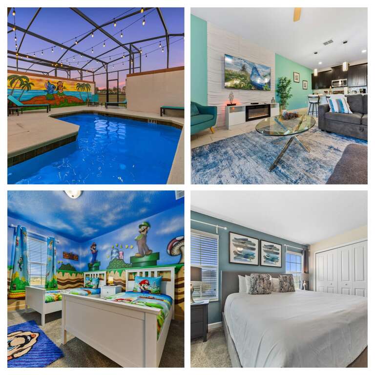 Level up your Orlando stay at Epic Level-Up Villa near Oasis Club—a family-friendly Champions Gate retreat just a short walk from the resort’s Oasis Club. Enjoy a custom Mario-inspired kids room, vibrant hand-painted pool murals, flexible sleeping with a downstairs queen, and a private pool with optional heat. Designed for fun, comfort, and unforgettable vacation memories. Stay just steps from the action at Epic Level-Up Villa near Oasis Club, a family-friendly Champions Gate retreat located toward the front of the resort and only a short walk to the Oasis Club. With a private pool, no rear neighbors, themed kids’ room, and open living layout, this home is designed for comfort, fun, and easy vacation living.
