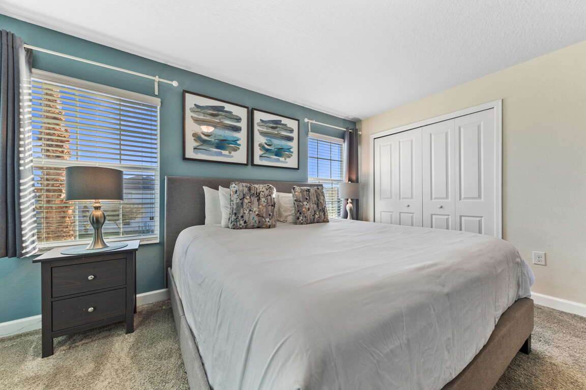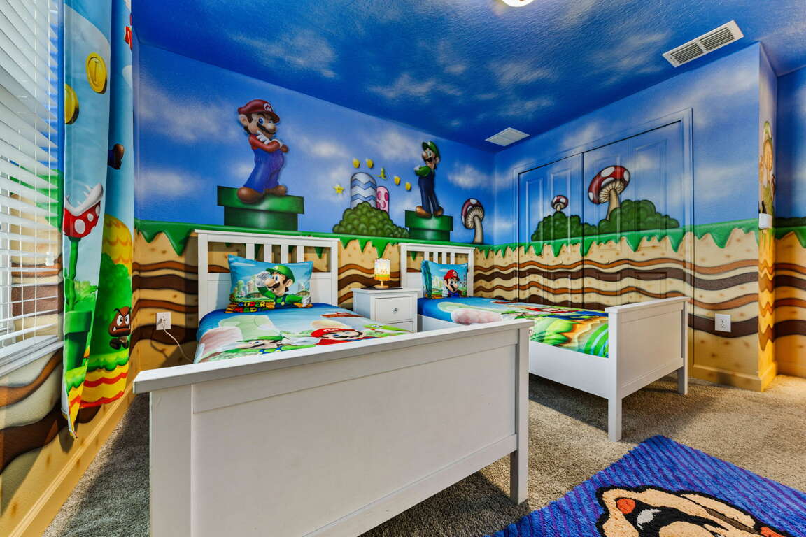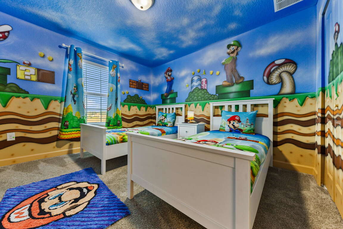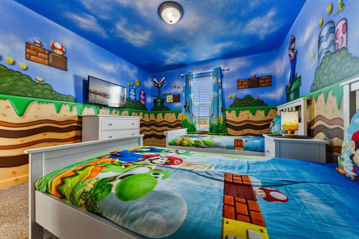 Upstairs, the home continues to impress with a spacious king primary suite, a colorful Mario-inspired twin bedroom that kids absolutely love, and an additional queen bedroom for flexible sleeping arrangements. The upstairs laundry area adds extra convenience, especially for longer stays and pool days.