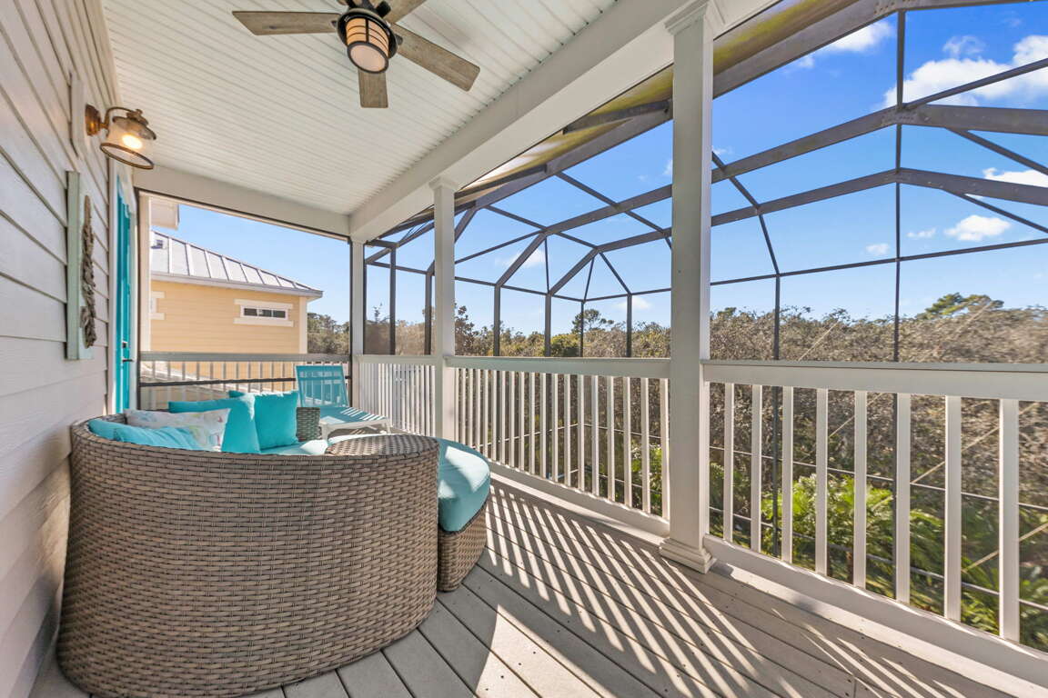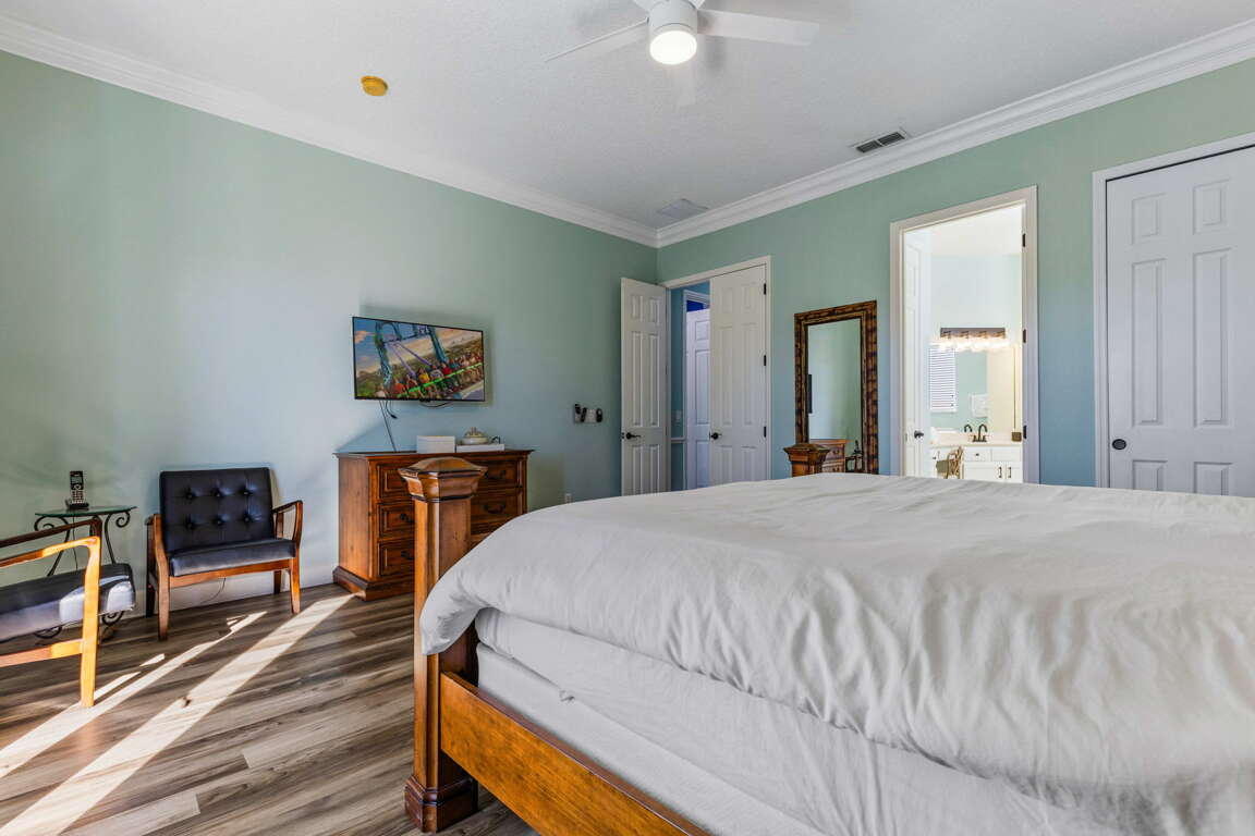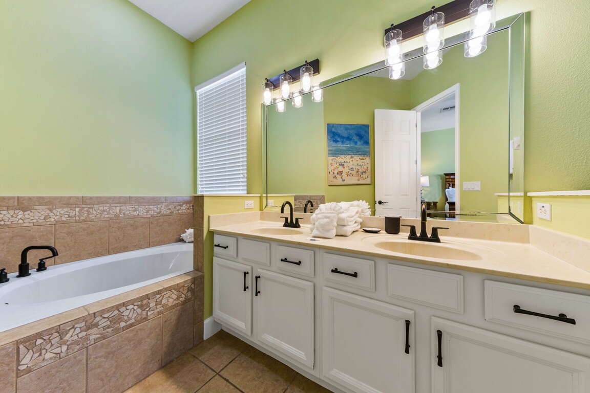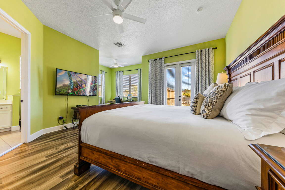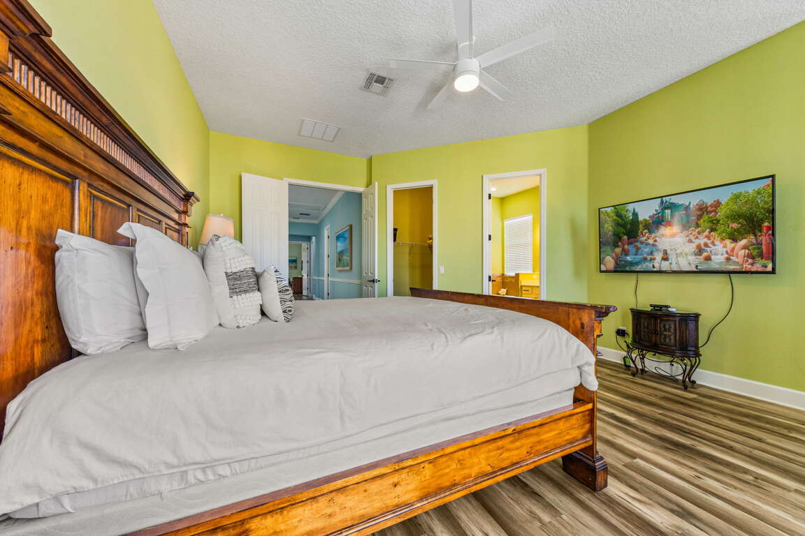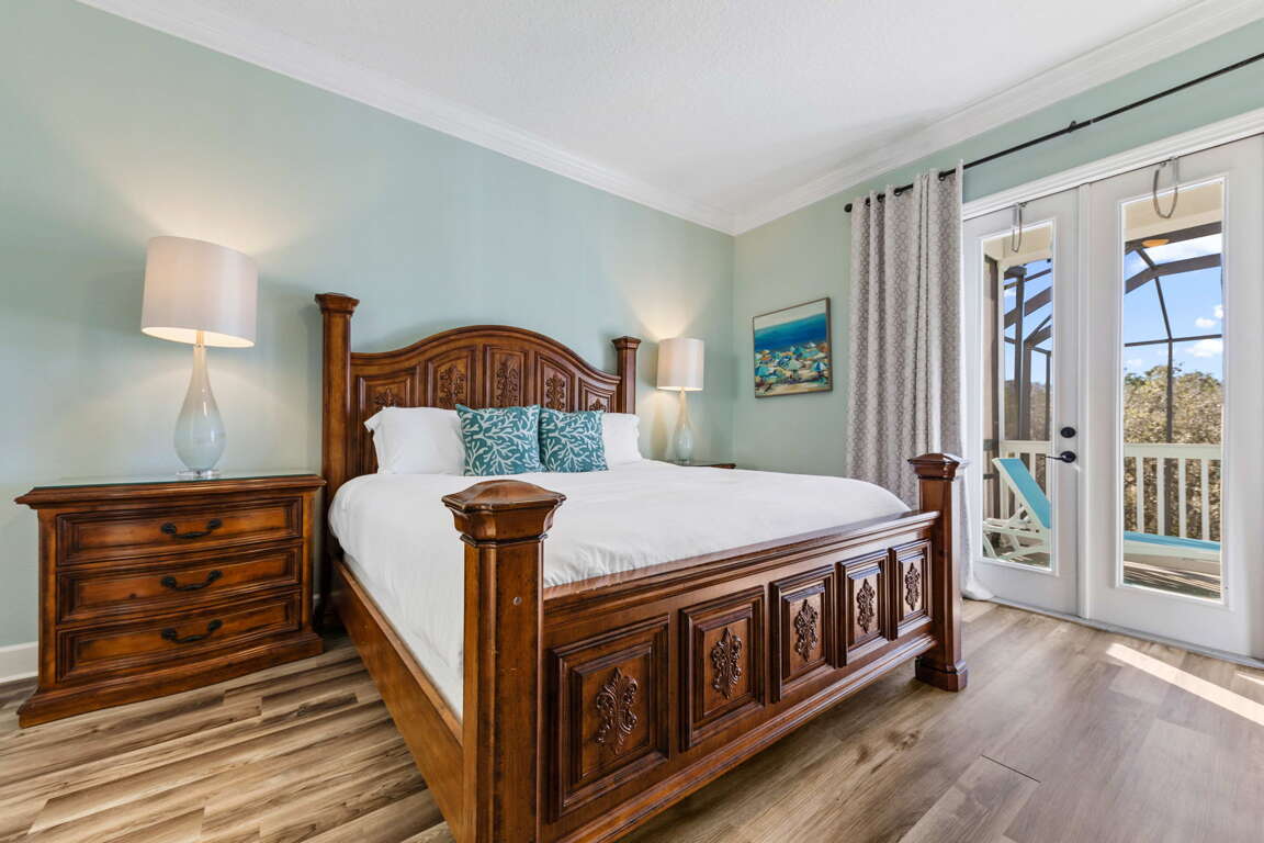 All upstairs bedrooms include their own dedicated bathrooms, offering comfort and privacy for every guest. The king master suite and the Small World room both feature direct access to the balcony, where you can enjoy peaceful views overlooking the pool area — perfect for morning coffee or winding down in the evening.