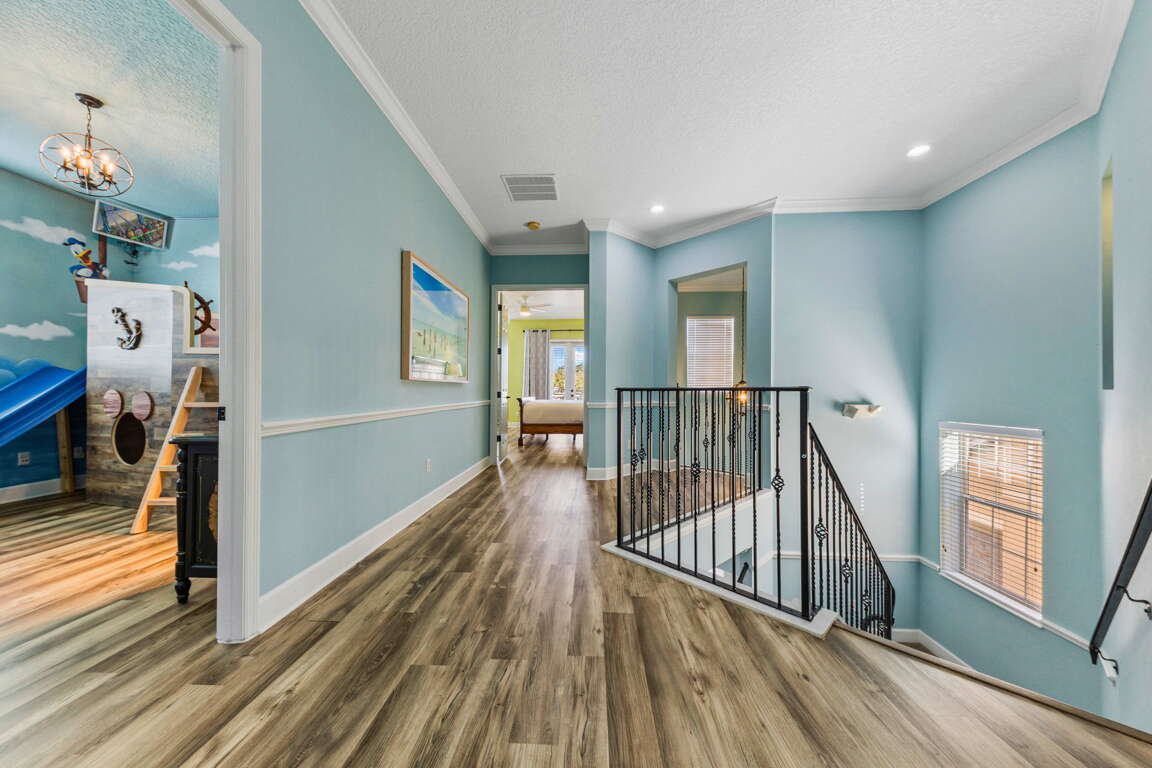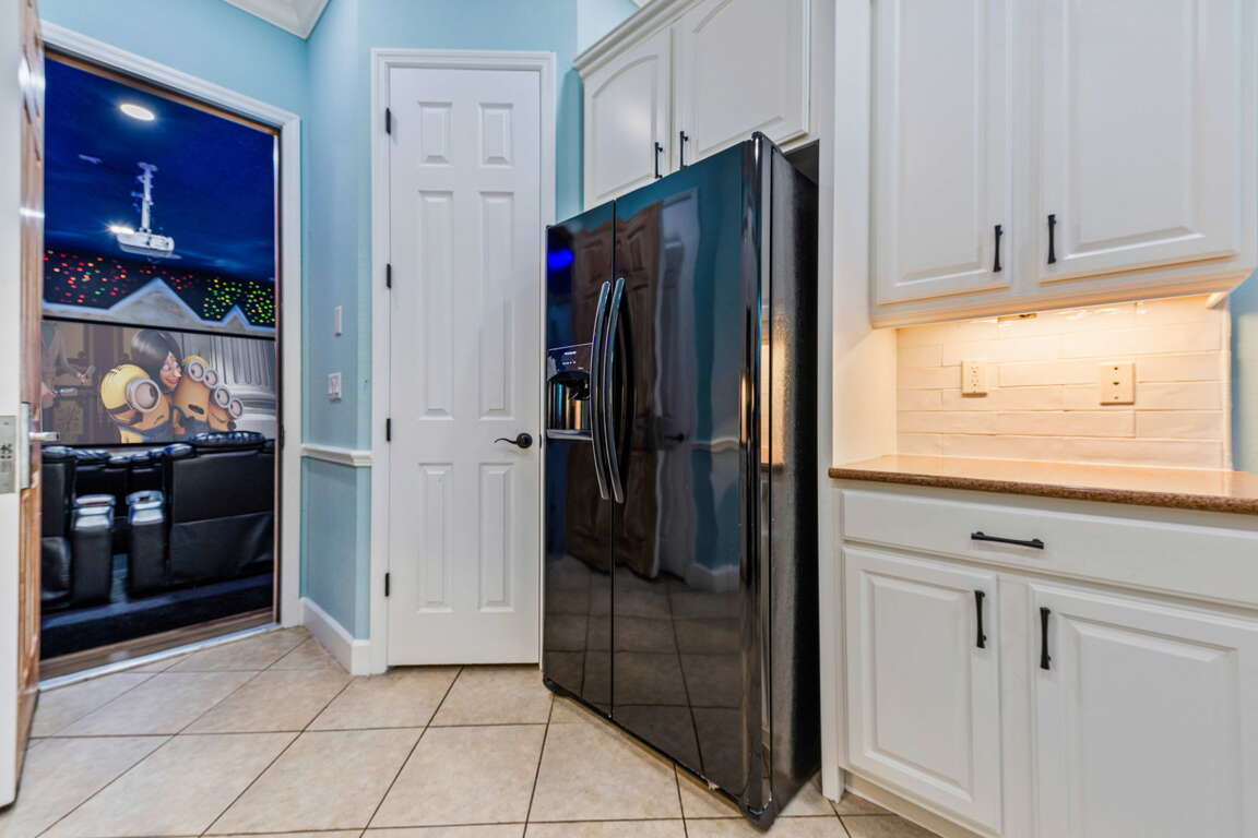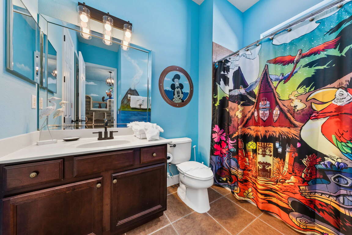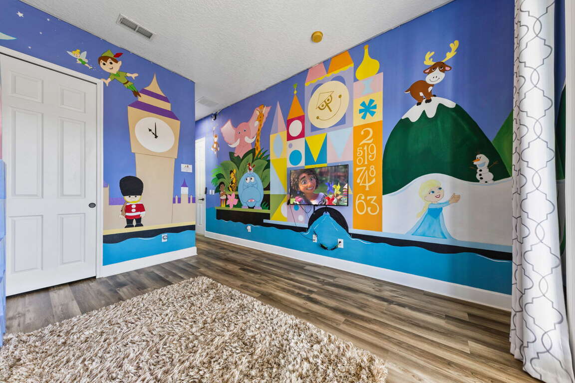 The custom kids’ bedrooms are where this home truly shines. The Mickey and Friends bunk room invites nonstop fun with a playful slide and themed details that make bedtime exciting. Nearby, the Small World castle bunk room feels like stepping into a storybook, complete with custom-built bunks designed to spark imagination and wonder. These aren’t just bedrooms — they’re experiences your kids will talk about long after the trip ends.