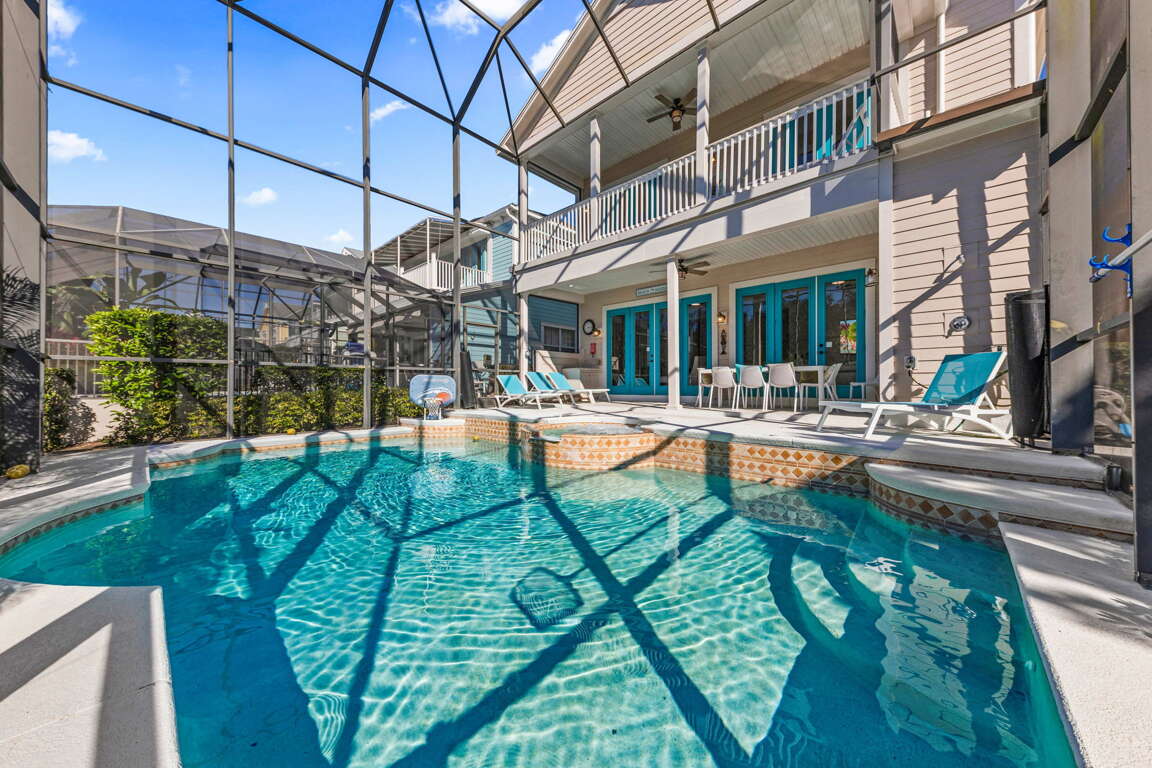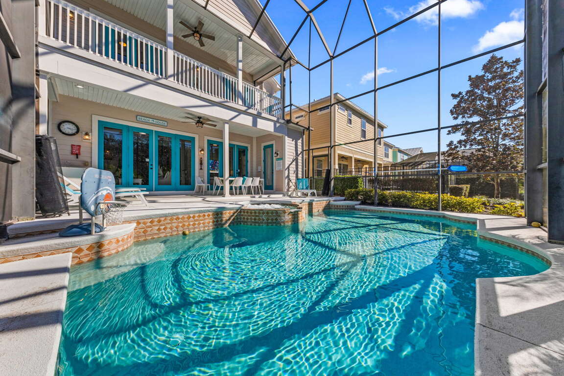 Kissimmee house vacation rental with a 130” theater, arcade game room, themed bunk rooms with slides, and a screened private pool with spillover spa.