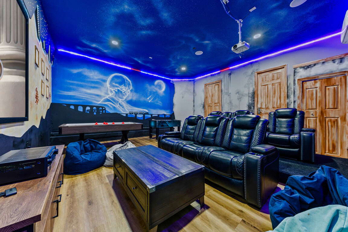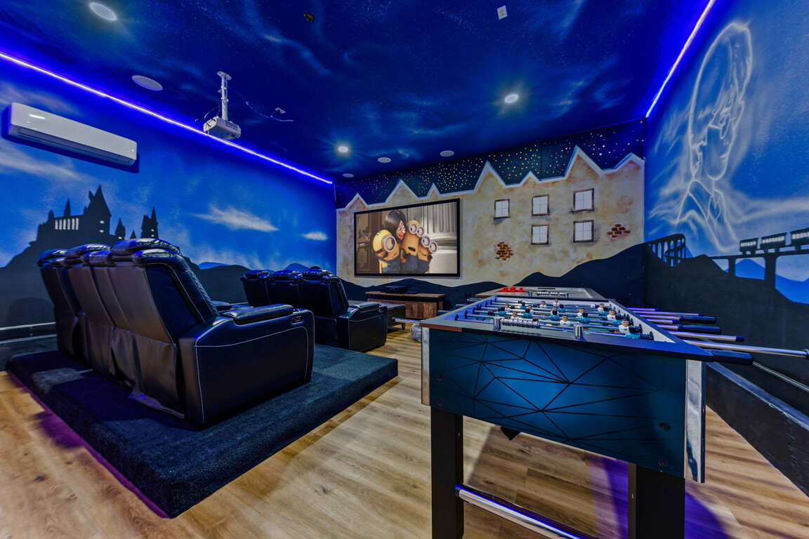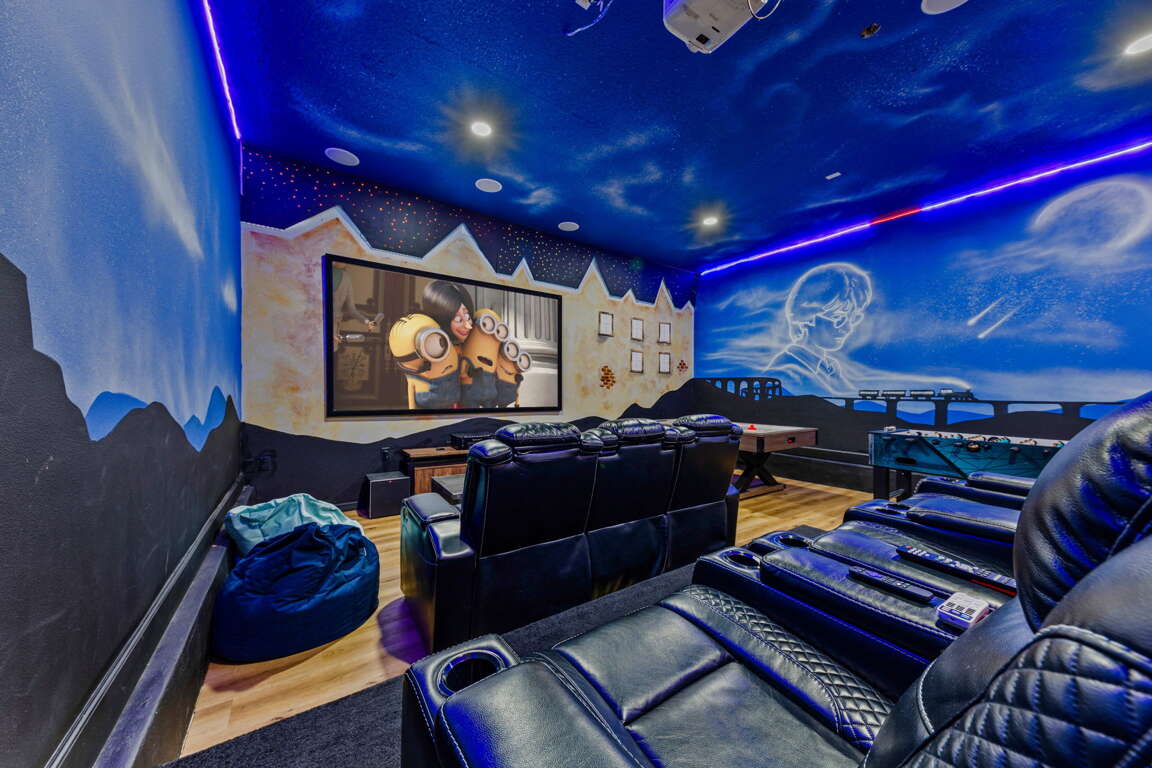Epic Reunion Playhouse is a family-focused vacation home featuring a private movie theater with 130” screen, arcade-style game room, custom themed bunk rooms with slides, and a large screened-in pool with spillover spa. All upstairs bedrooms include private baths, with balcony access overlooking the pool. Located near Reunion’s Seven Eagles Cove and just minutes from Island H2O Water Park. Welcome to Epic Reunion Playhouse, a thoughtfully designed vacation home where family time, imagination, and resort-style relaxation come together in a truly unforgettable way. Whether you’re planning full days at the parks or slow mornings by the pool, this home is built to make every moment feel easy, fun, and a little bit magical. https://youtu.be/nNcNbUYtJzQ