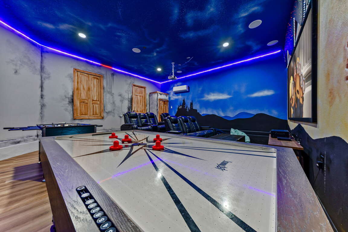 Upstairs, the entertainment space sets the tone for epic nights in. The private game room and movie theater features a massive 130” screen that transforms movie nights, sporting events, and gaming sessions into a cinematic experience. Between the air hockey table, arcade game, and foosball, there’s always something happening — and plenty of room for everyone to gather, cheer, or simply relax.