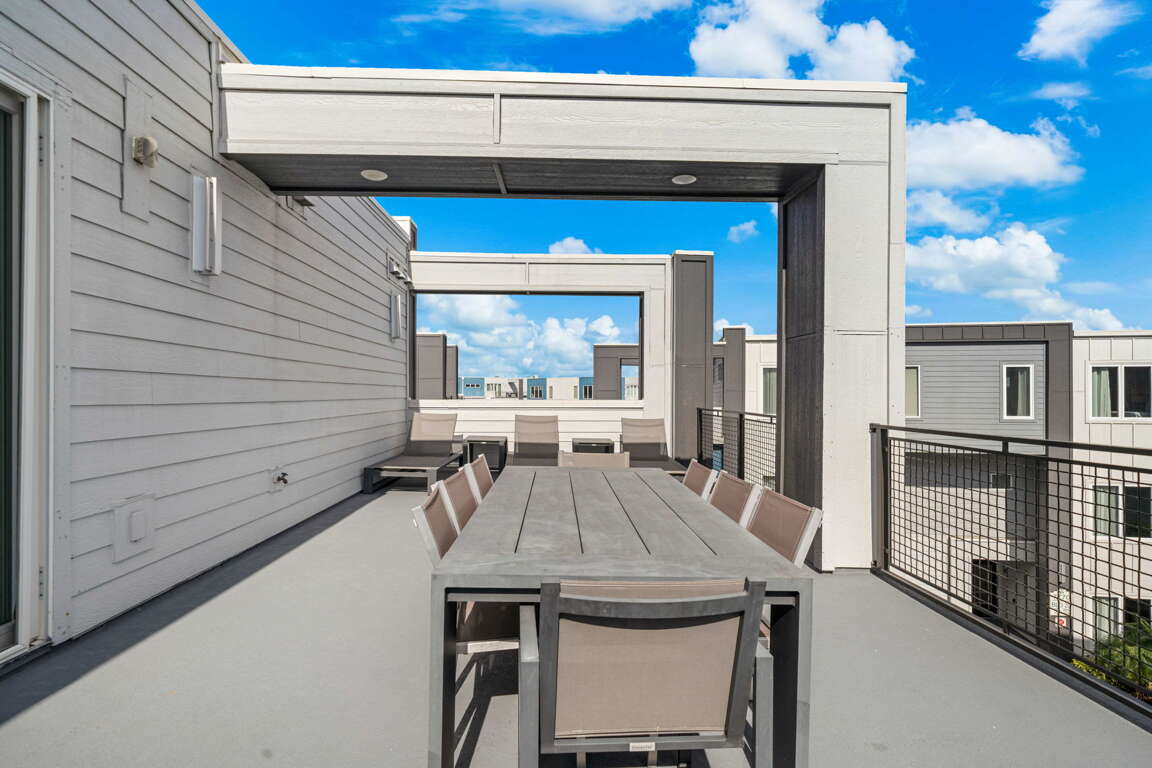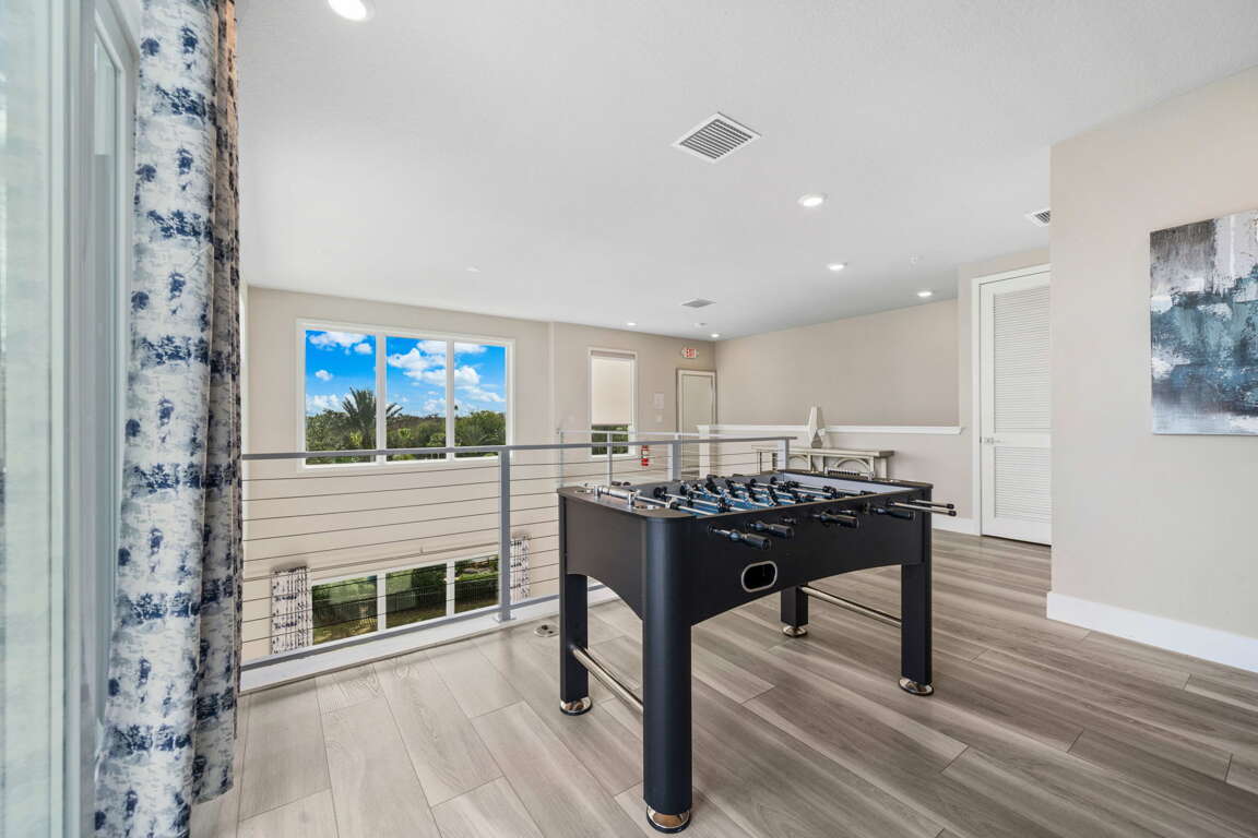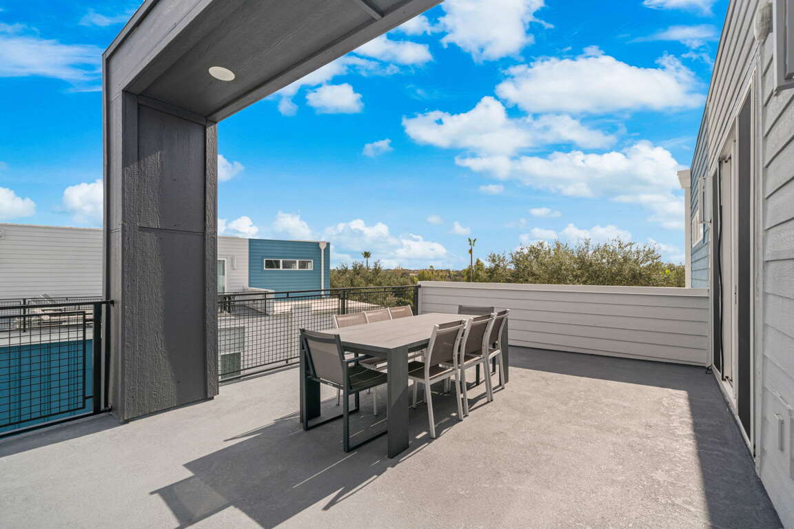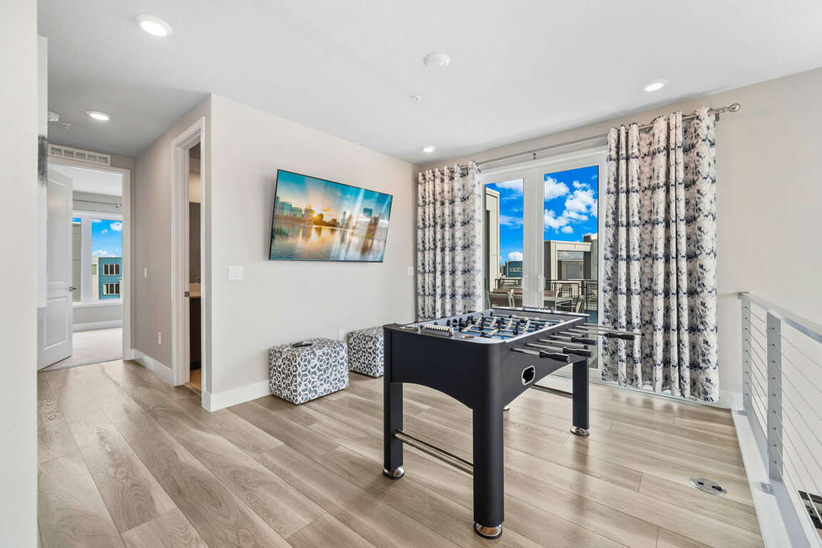 Upstairs, the loft provides a second gathering space with foosball, a 60” wall-mounted TV, and direct access to the rooftop balcony. This elevated outdoor space is a standout feature, complete with a dining table for eight and lounge seating—perfect for morning coffee, afternoon lounging, or evening meals under the Florida sky. A full bathroom with tub/shower combo is located just off the loft.