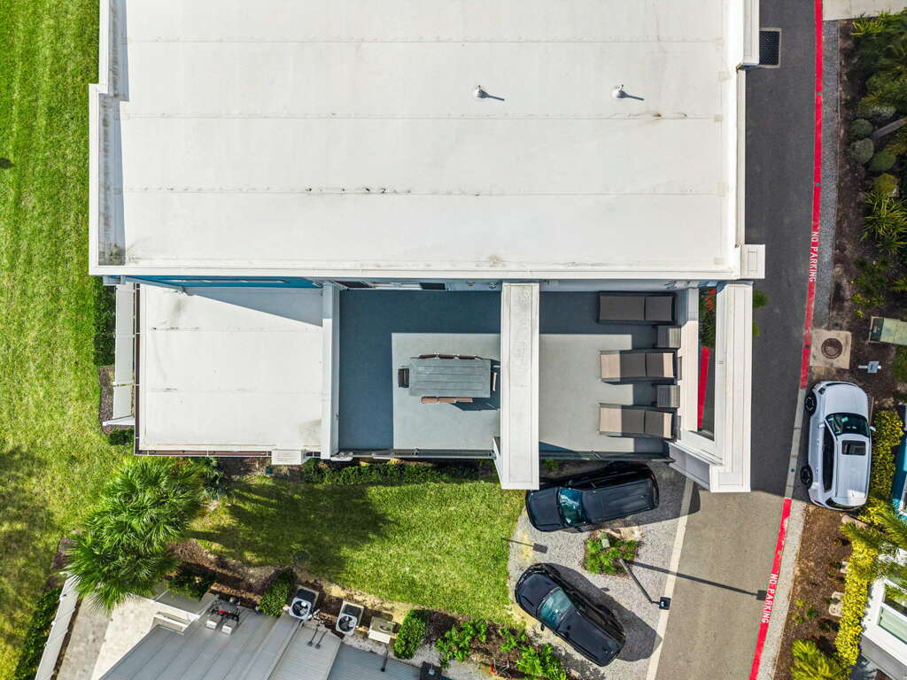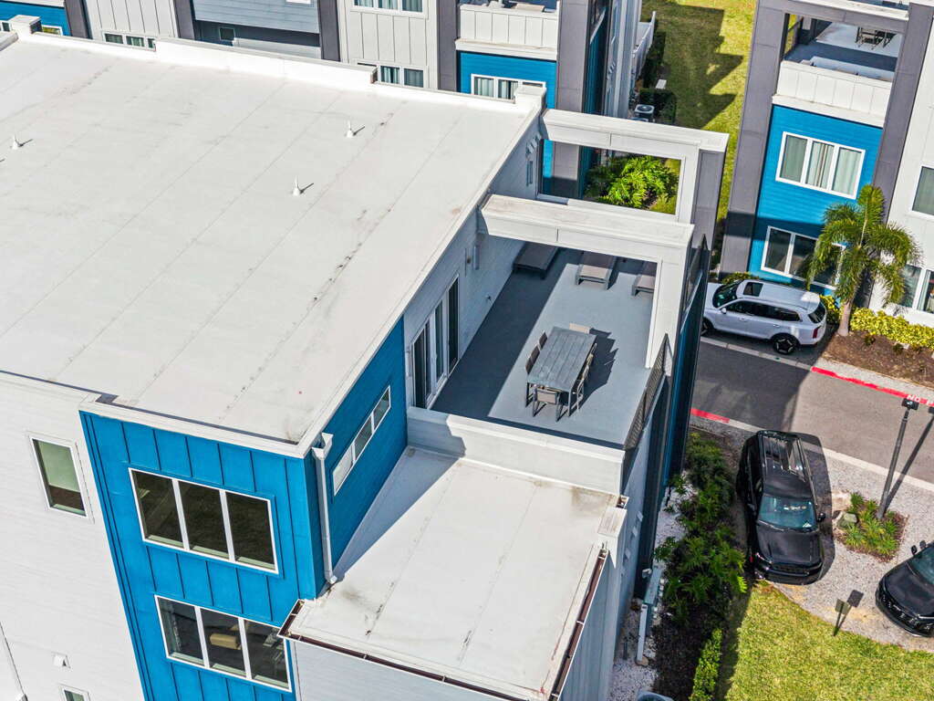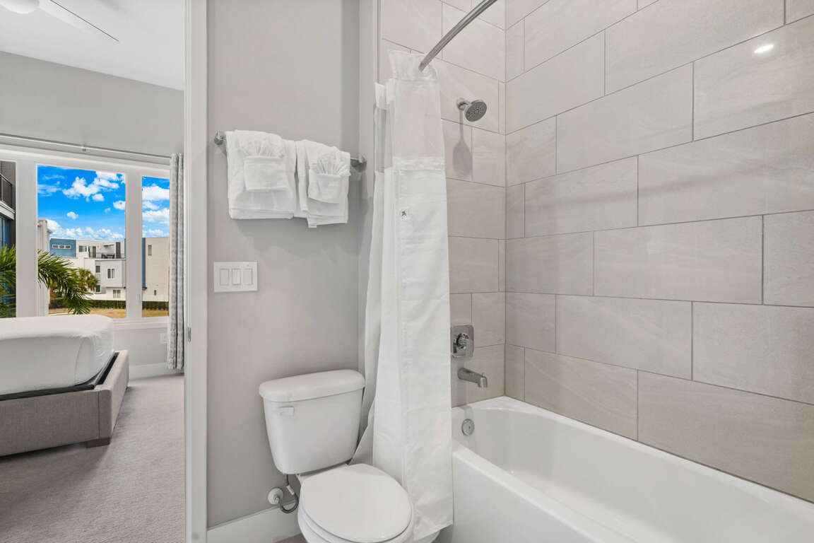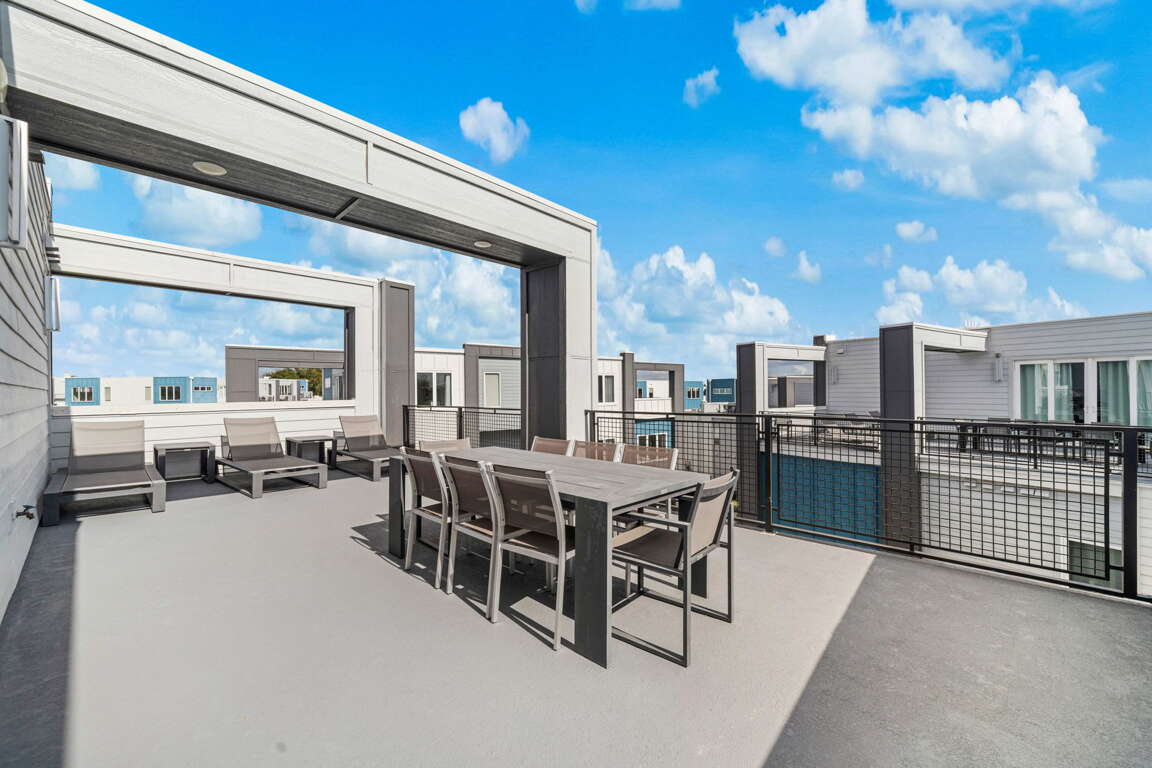 Upstairs, the loft provides a second gathering space with foosball, a 60” wall-mounted TV, and direct access to the rooftop balcony. This elevated outdoor space is a standout feature, complete with a dining table for eight and lounge seating—perfect for morning coffee, afternoon lounging, or evening meals under the Florida sky. A full bathroom with tub/shower combo is located just off the loft.