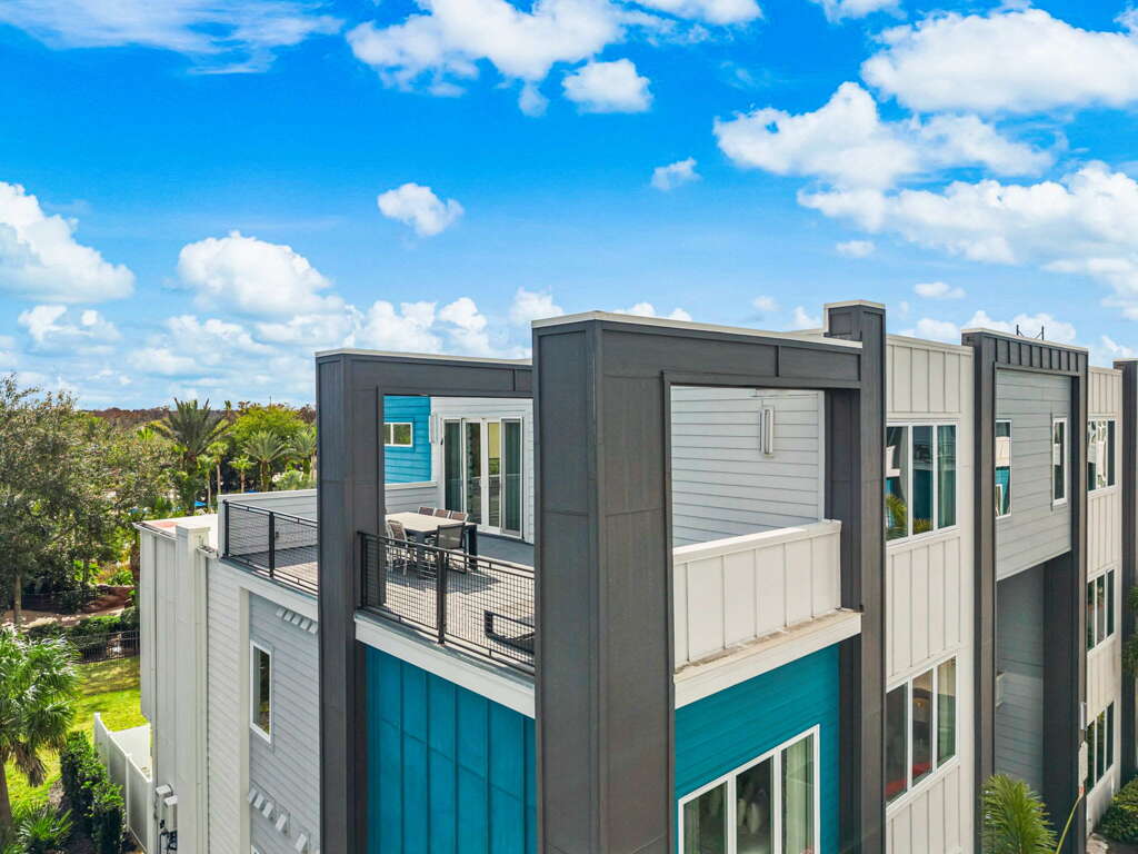 Five-bedroom townhome vacation rental in Kissimmee with elevator access, rooftop dining balcony, loft foosball lounge, and access to Reunion Resort pools.