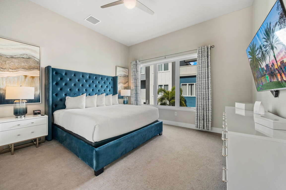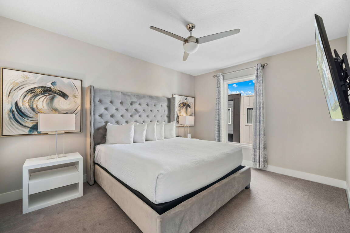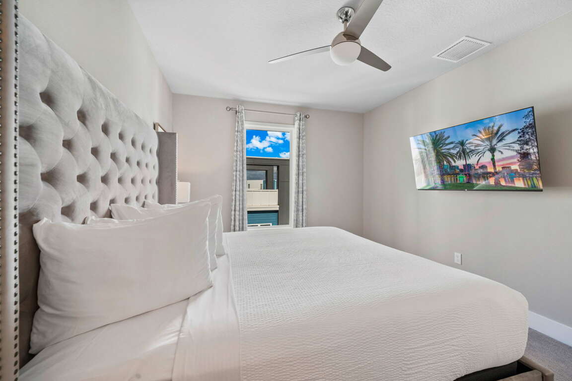 Two additional bedrooms complete the upper level: a queen bedroom with wall-mounted smart TV and LED ceiling fan, and a second king master suite featuring a private bathroom with double vanity, walk-in shower, and water closet—offering comfort and privacy for couples traveling together.