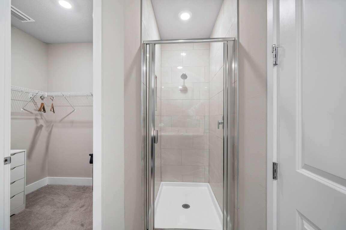 Three bedrooms are located on this level, making it ideal for multi-generational groups. Two queen bedrooms, each with wall-mounted smart TVs and LED ceiling fans, share a full bathroom with a double vanity and tub/shower combo. The primary king suite on this floor offers a private ensuite with double vanity, walk-in shower, and a closet with a laptop safe for added peace of mind.