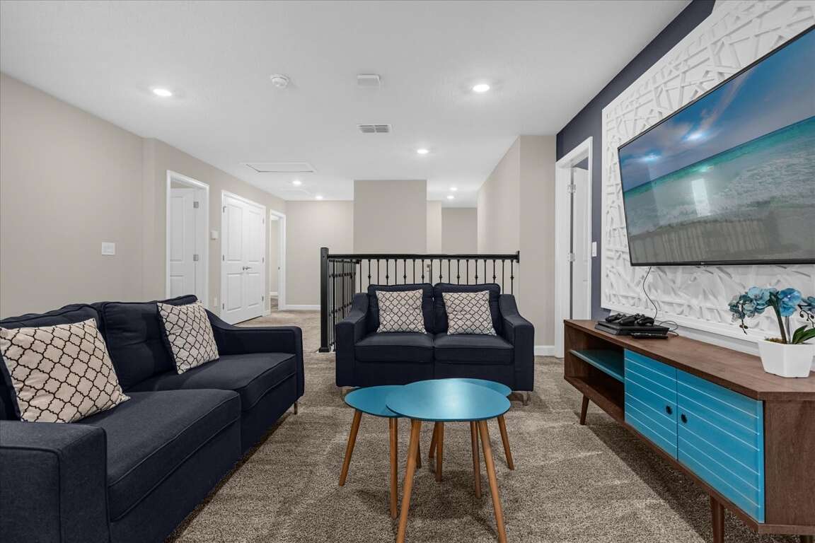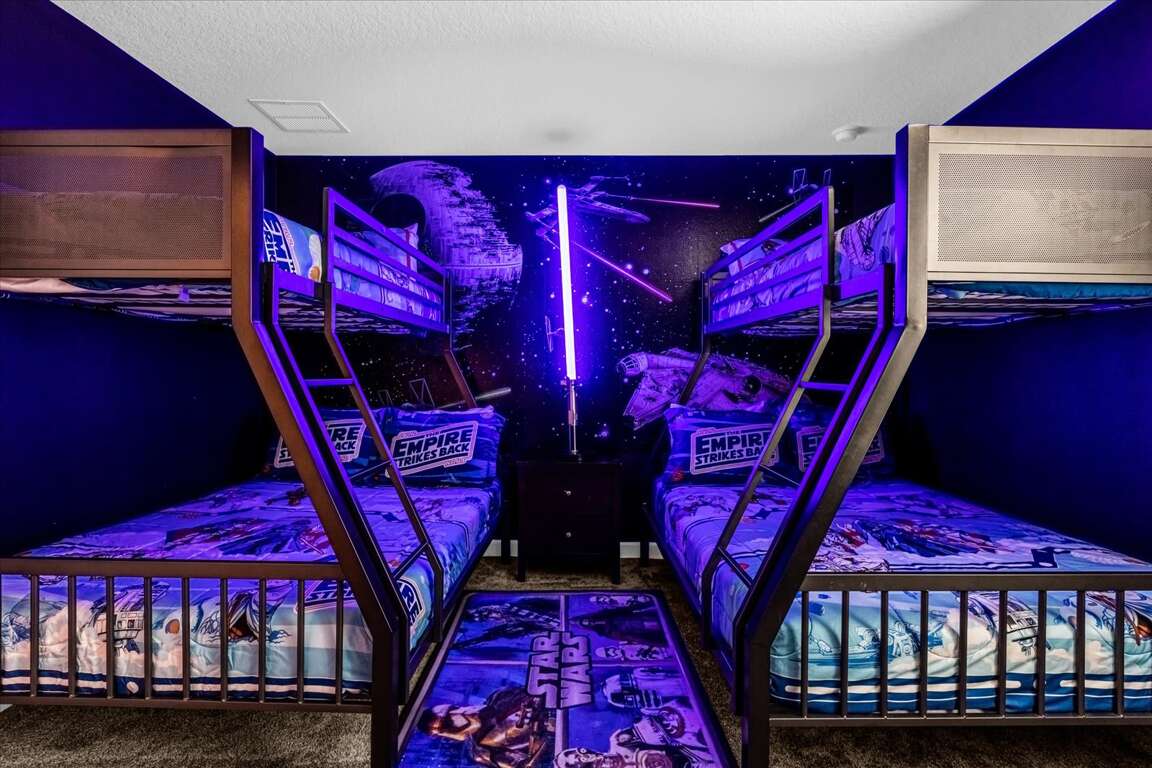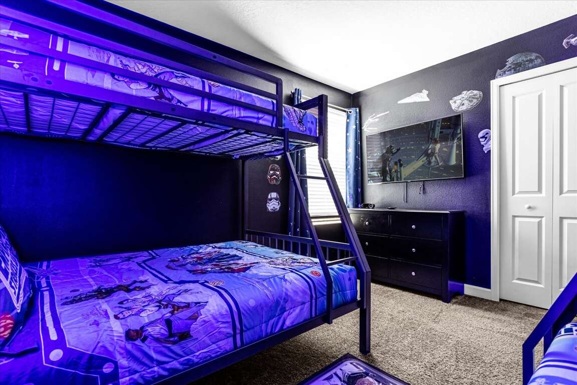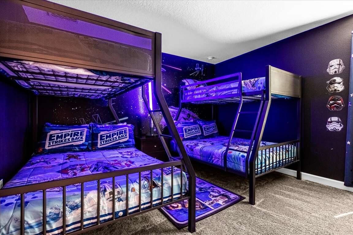 This thoughtfully designed home features five king bedrooms, ideal for couples and adults seeking comfort and space. Younger guests will love the twin-over-twin princess bedroom, while the space-themed bunk room with two bunk beds (twin over full) creates an exciting sleep and play zone for kids and teens.