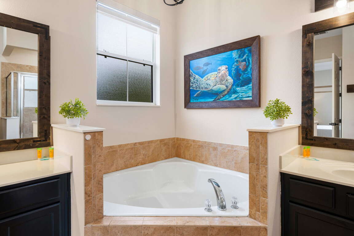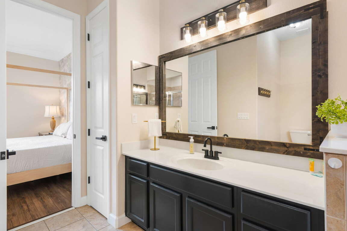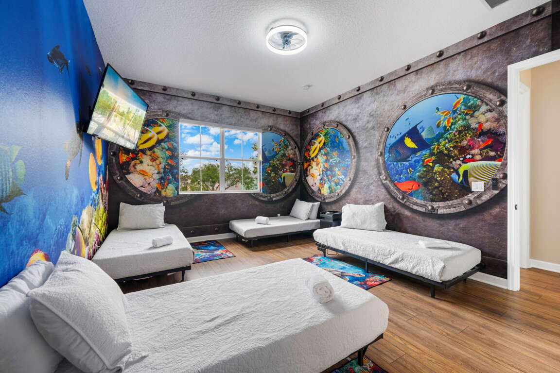 Upstairs, the home continues to impress with a layout designed for both comfort and fun. The front king bedroom shares a Jack and Jill bathroom with the newly transformed “Under the Sea” bedroom, featuring four twin beds in an immersive, kid-friendly setting that’s sure to be a highlight of the stay. At the rear of the home, a second king master suite provides a quiet retreat with its own private bathroom, ideal for couples or extended family.