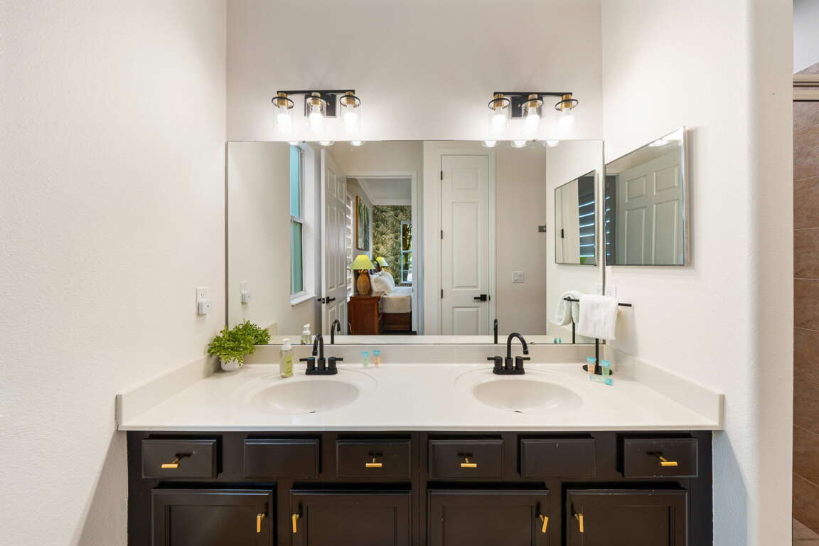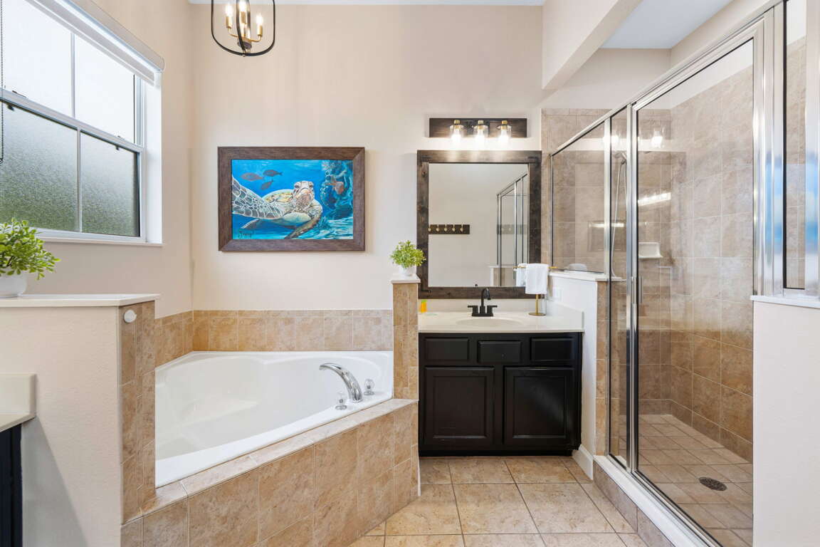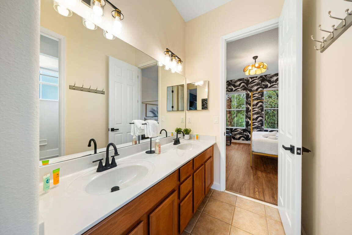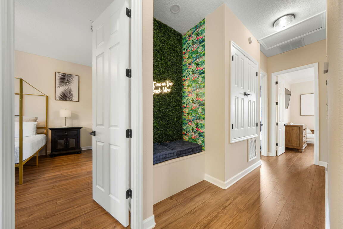 Upstairs, the home continues to impress with a layout designed for both comfort and fun. The front king bedroom shares a Jack and Jill bathroom with the newly transformed “Under the Sea” bedroom, featuring four twin beds in an immersive, kid-friendly setting that’s sure to be a highlight of the stay. At the rear of the home, a second king master suite provides a quiet retreat with its own private bathroom, ideal for couples or extended family.