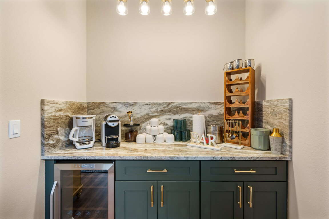 At the heart of the home, a custom-built coffee bar adds a boutique touch, giving you the perfect place to start your mornings or unwind in the evening. The downstairs king master suite offers privacy and convenience, while a nearby half bath serves the main living area.