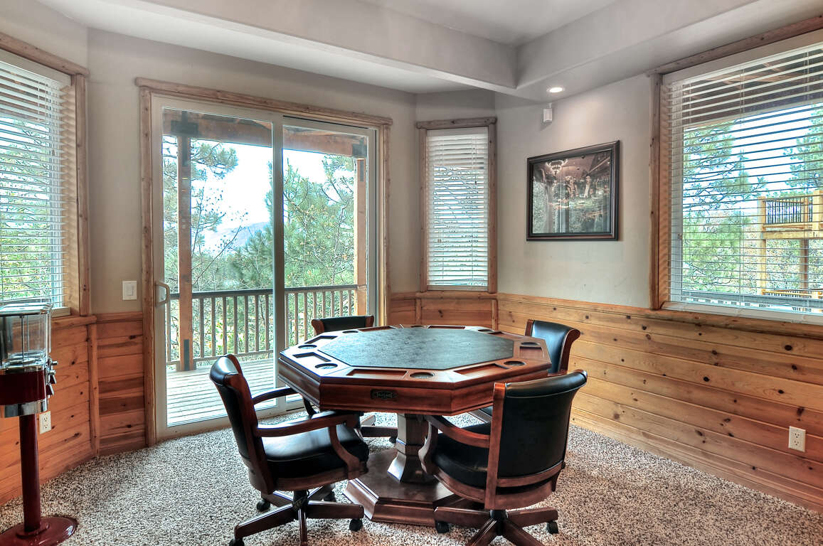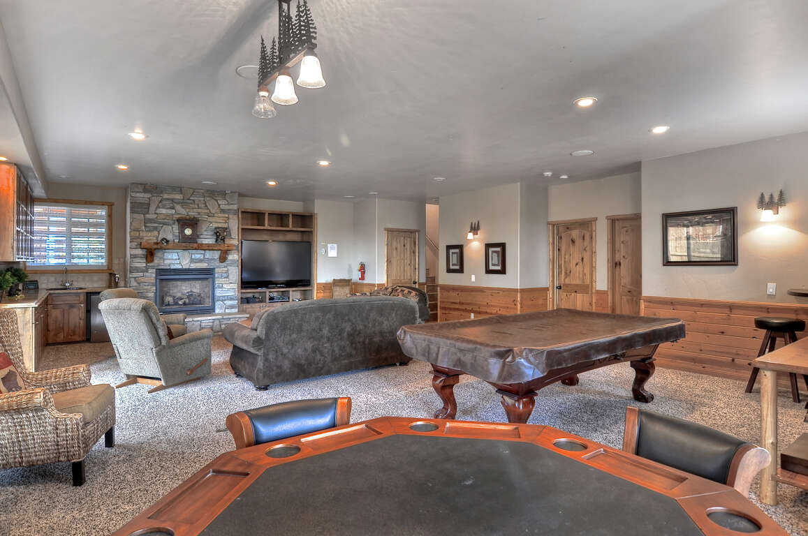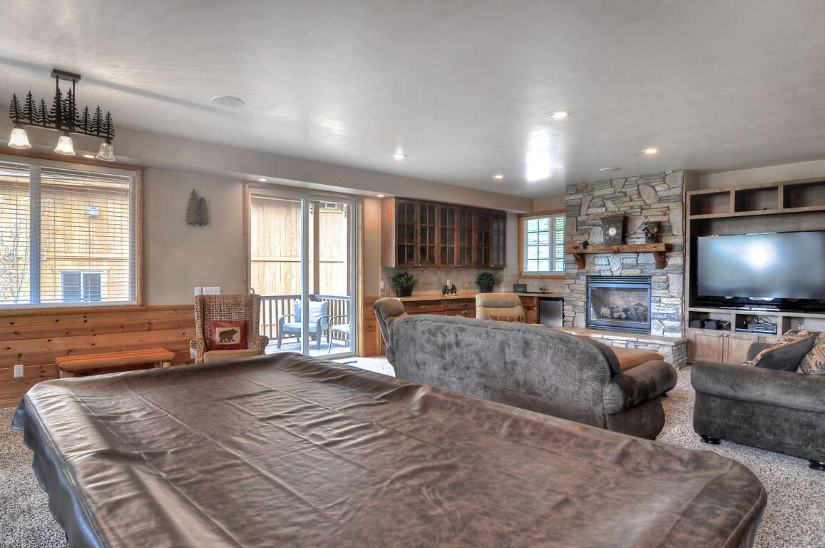 Family Room/Theater Room: Gas Fireplace, Big Screen TV, DVD, VHS, Queen sleeper sofa, Full size futon, 9' Pool Table (tournament Brunswick), view decks, and small kitchenette.