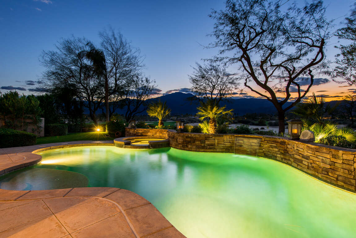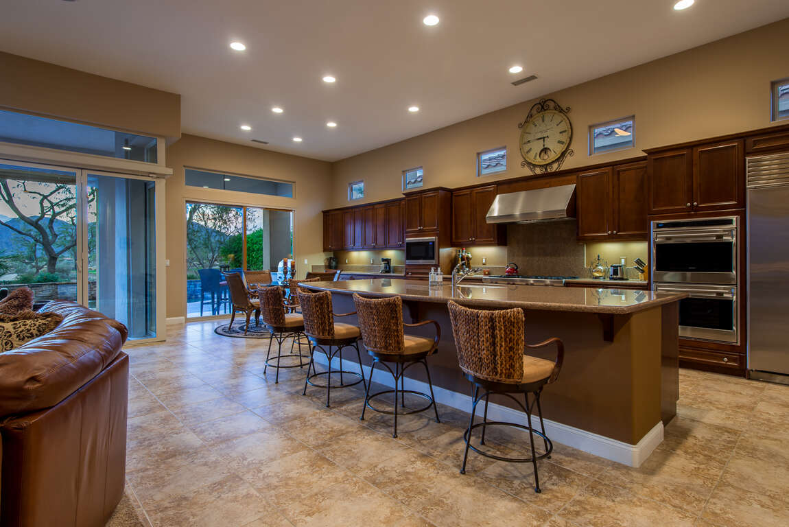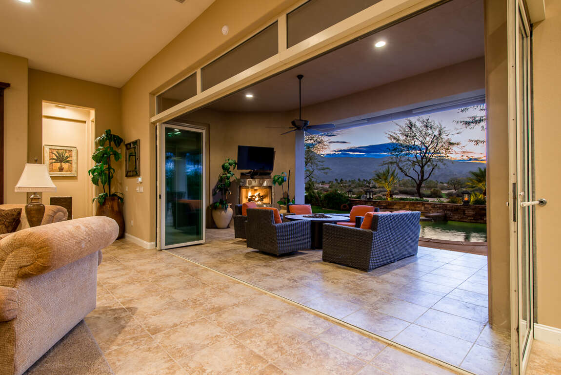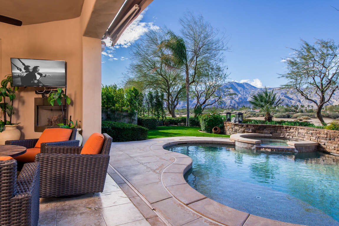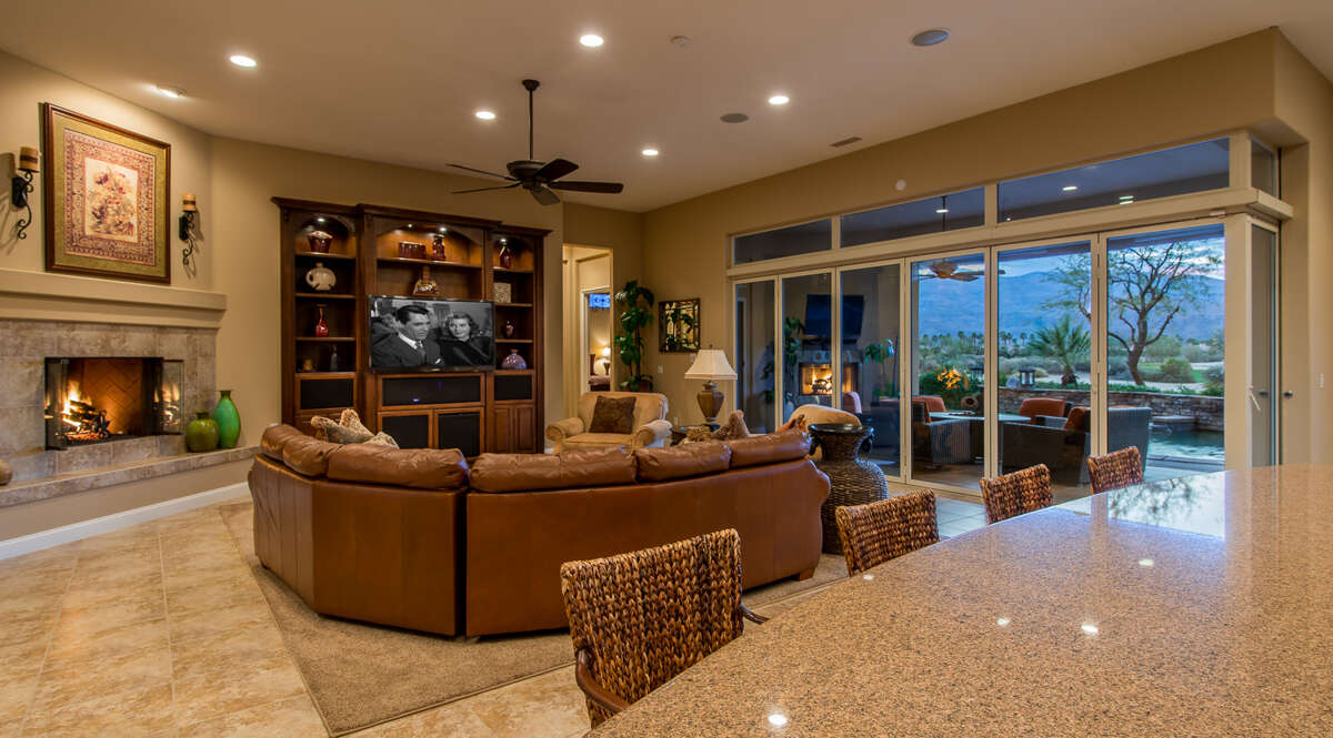The hideaway offers four bedrooms (including a well-appointed two room casita), four full bathrooms plus one half bathroom, and comfortably accommodates up to ten guests.Step inside the grand hallway framed by disappearing glass, and your eyes are immediately drawn to the beautiful mountain and golf course views. Normanโs Hideaway boasts an open floor plan, making the home perfect for entertaining or relaxing with family and friends. The custom fireplace is warm and inviting, and the expansive bank of windows gives the space great views of the gorgeous Santa Rosa Mountains.