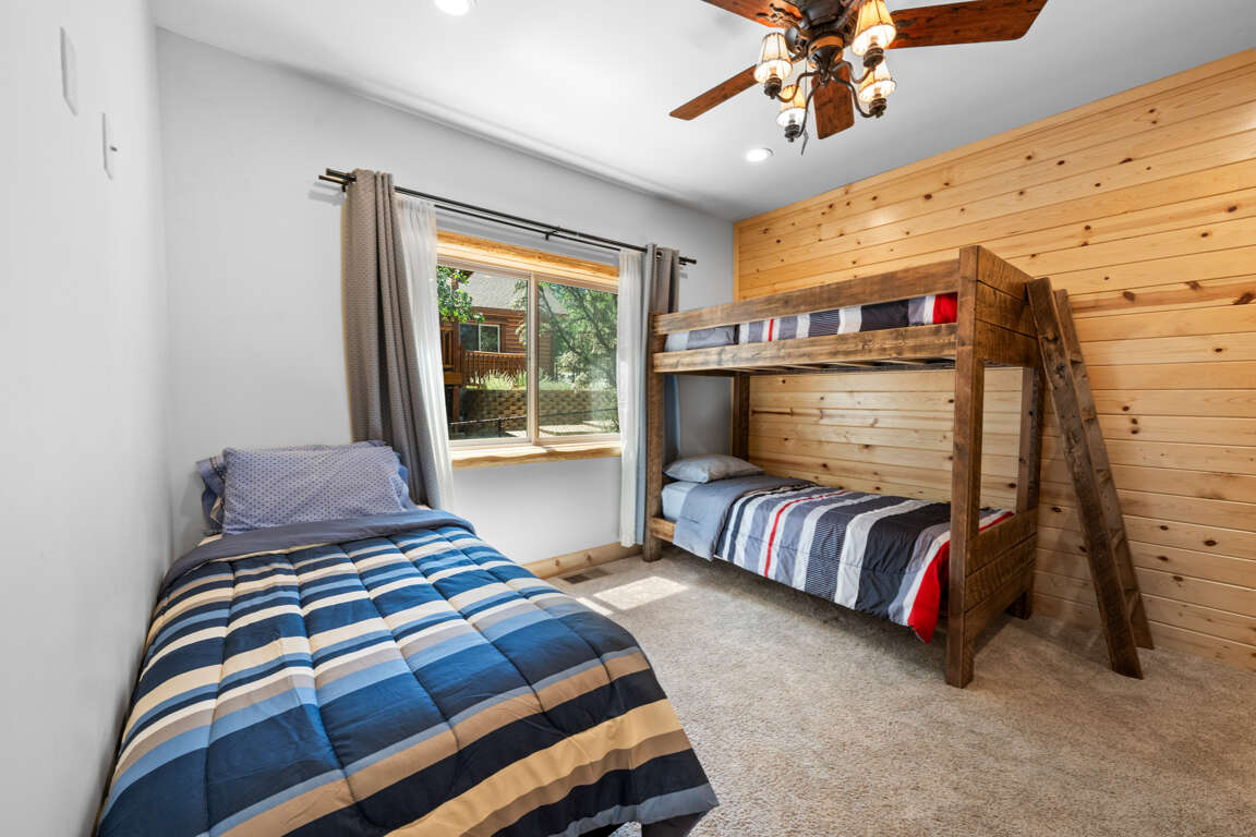 - Bedroom 3: Twin bed, Twin over Full bunk bed, walk in closet