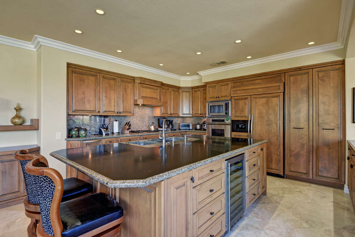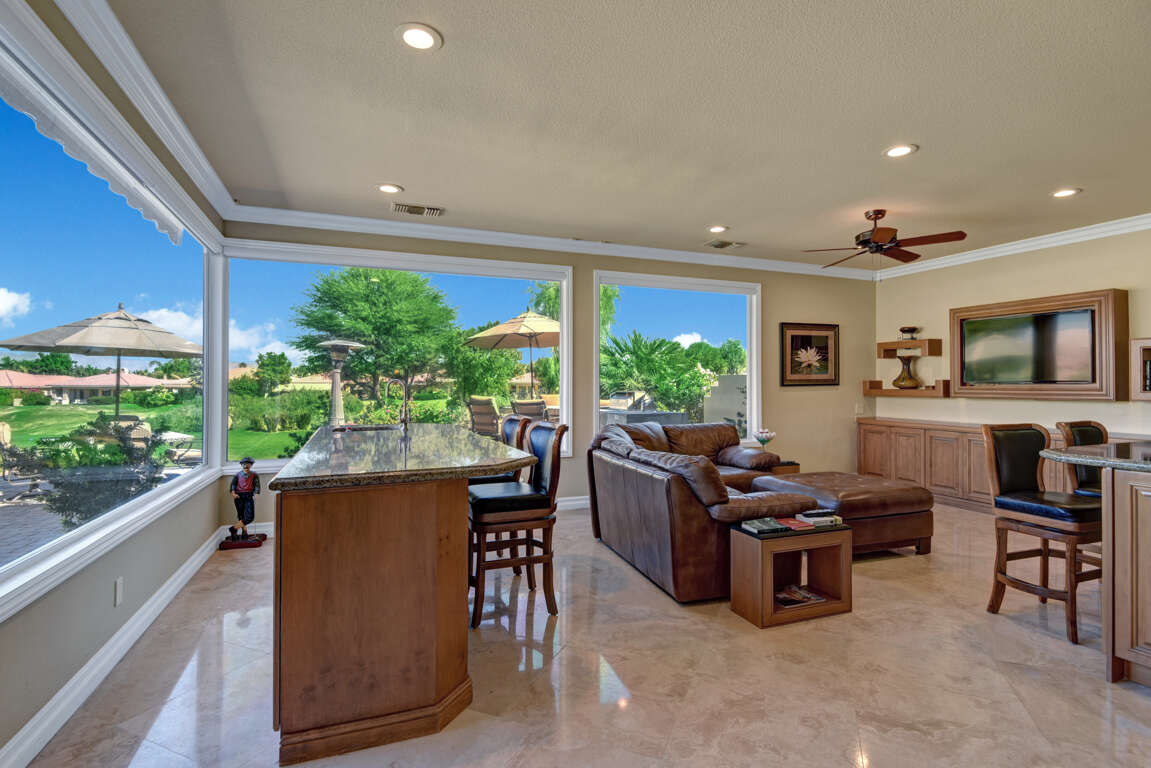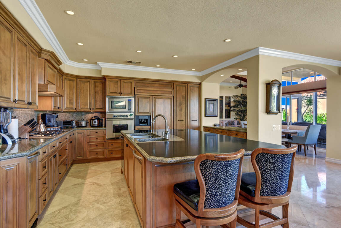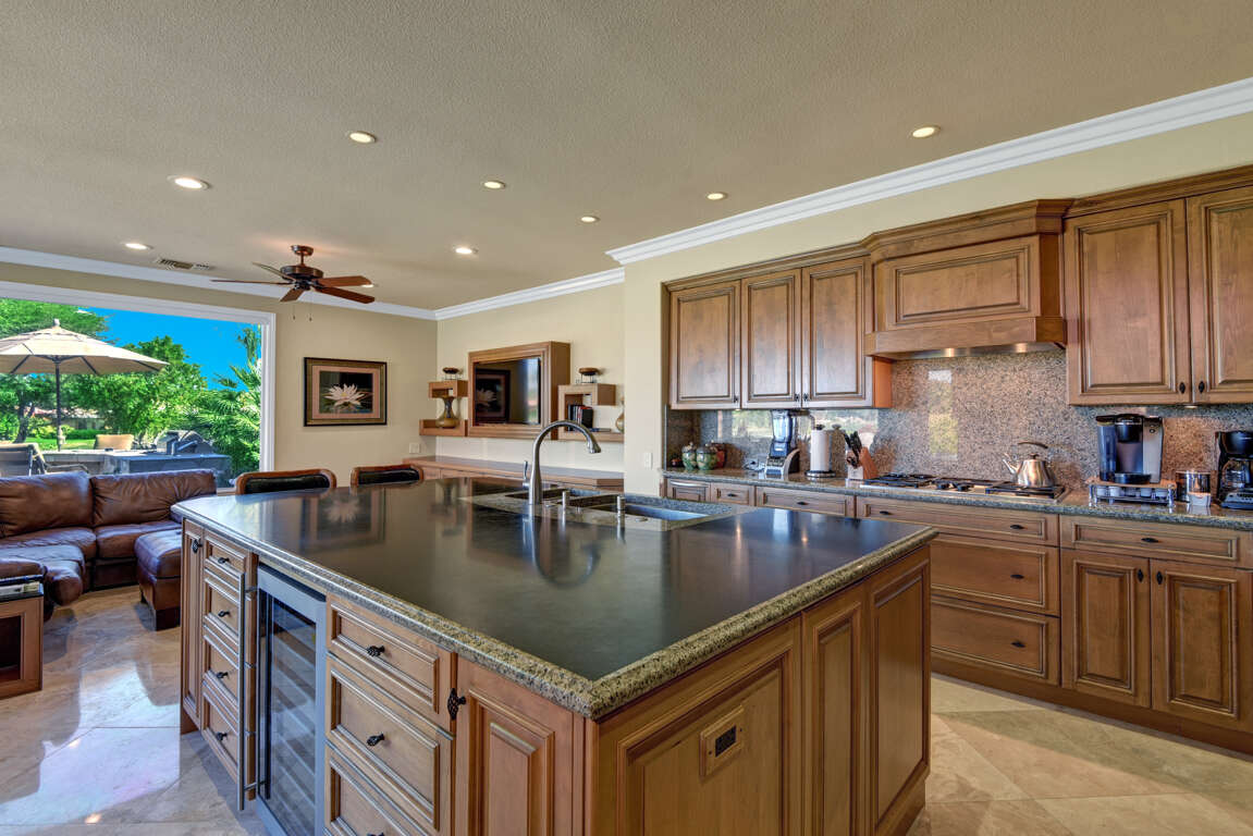 - Ample outdoor dining with seating for 8, along with a fully equipped barbeque center that includes a rotisserie, sink/disposal, beer fridge,