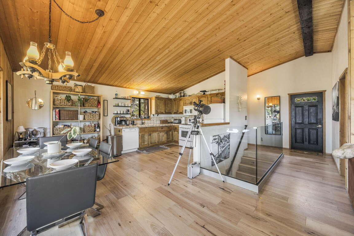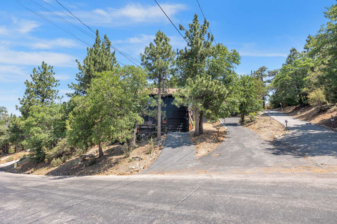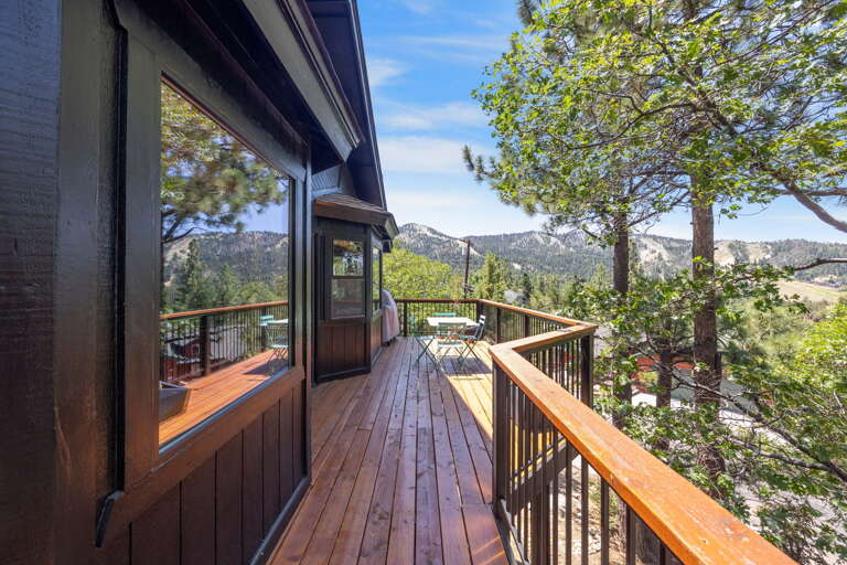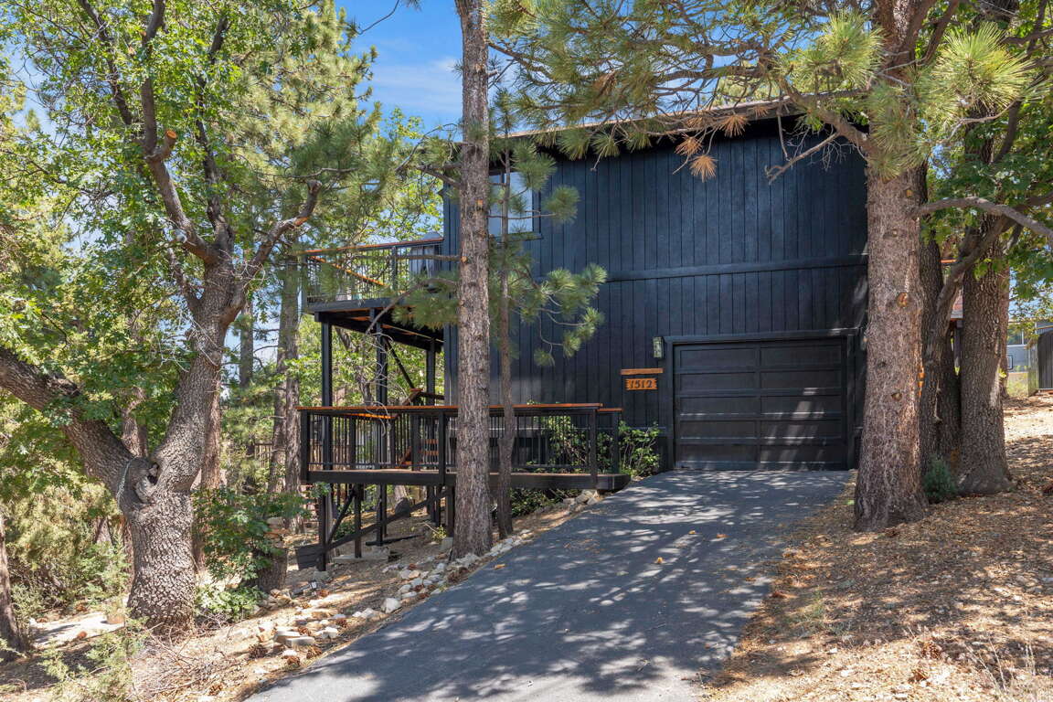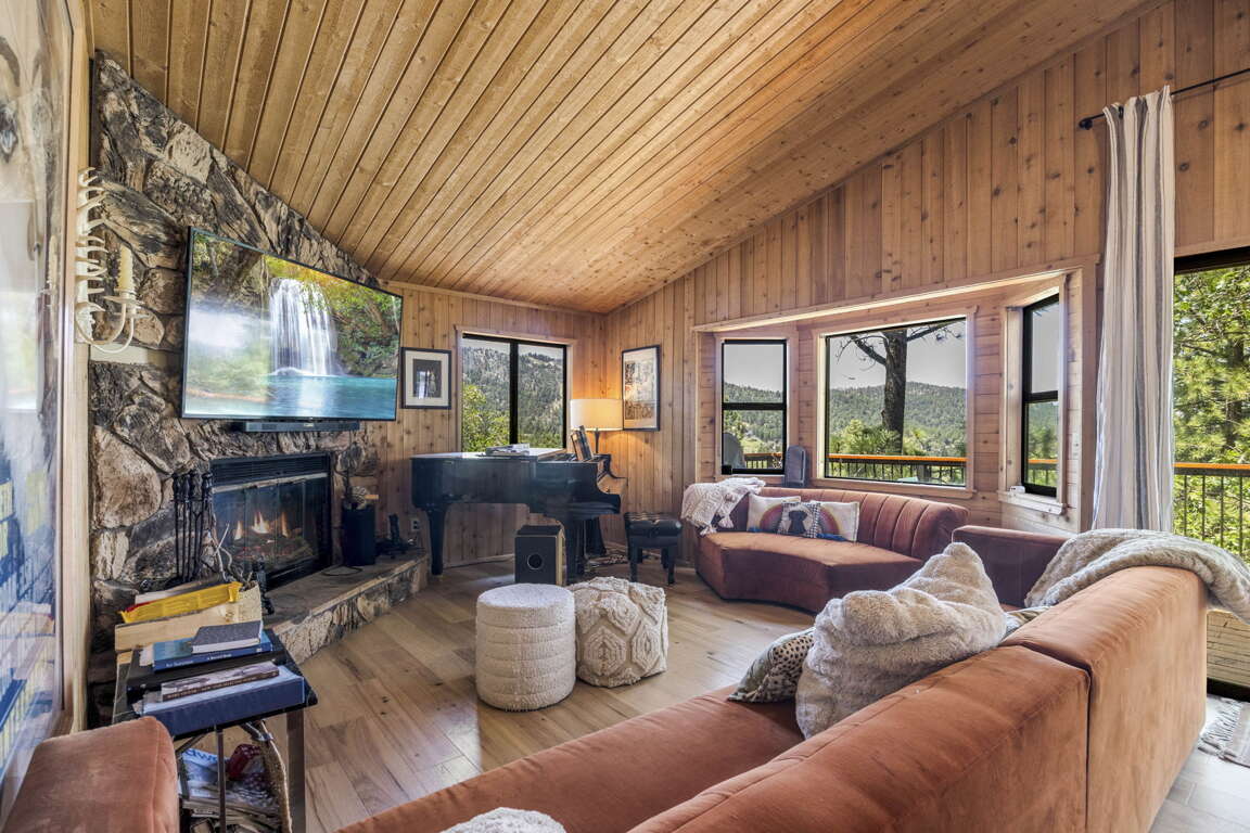 Beautiful Moonridge Cabin with awesome ski slope and Lake Views. This property offers easy access to Bear Mountain ski resort as well as the lake and many other attractions in Big Bear. Reverse floor plan with an open living area upstairs with the kitchen open to the living room and a cozy wood-burning fireplace, perfect for gathering with loved ones or curling up with a good book ~ Step outside onto the expansive deck off the living room and enjoy the fresh mountain air, where you can soak in the picturesque views while surrounded by the tranquility of oaks and pine trees ~ Warm tongue and groove accents throughout contribute to the authentic mountain cabin ambiance.