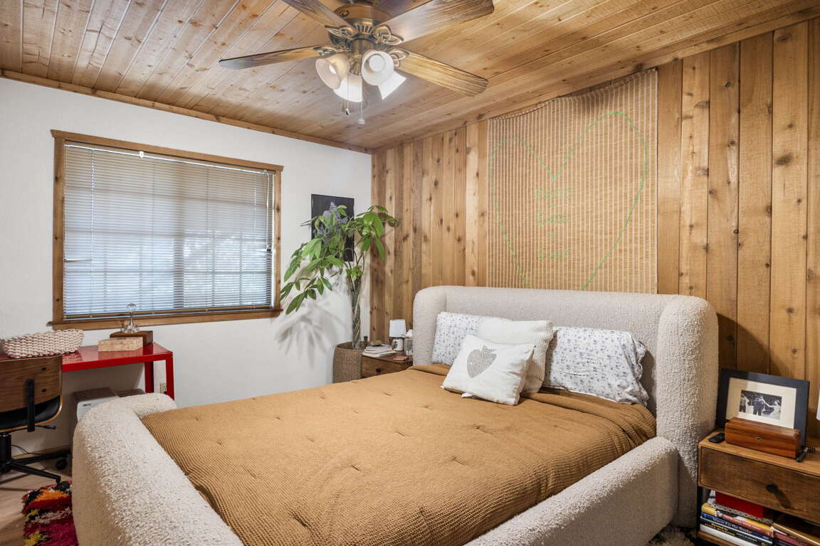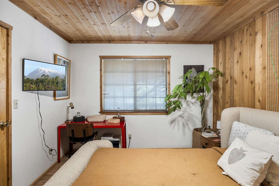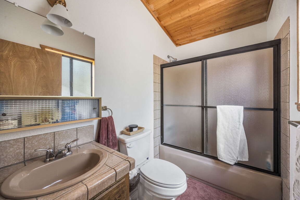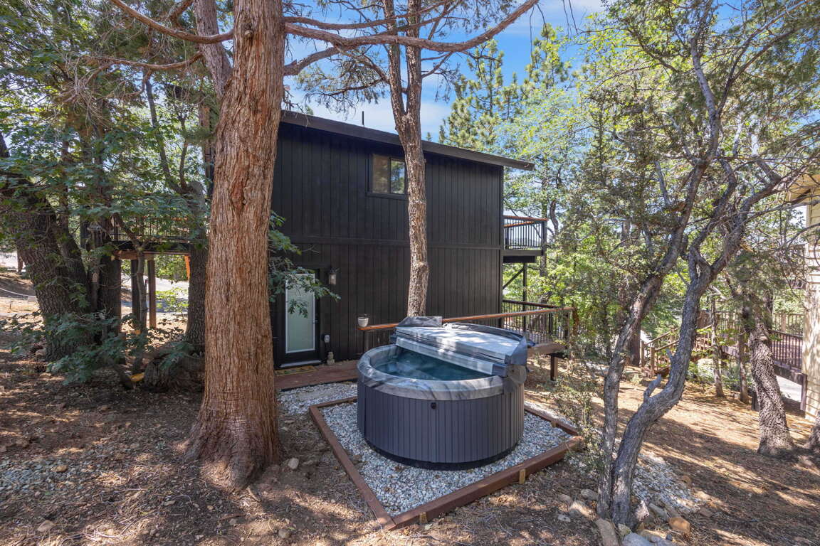 Beautiful Moonridge Cabin with awesome ski slope and Lake Views. This property offers easy access to Bear Mountain ski resort as well as the lake and many other attractions in Big Bear. Reverse floor plan with an open living area upstairs with the kitchen open to the living room and a cozy wood-burning fireplace, perfect for gathering with loved ones or curling up with a good book ~ Step outside onto the expansive deck off the living room and enjoy the fresh mountain air, where you can soak in the picturesque views while surrounded by the tranquility of oaks and pine trees ~ Warm tongue and groove accents throughout contribute to the authentic mountain cabin ambiance.