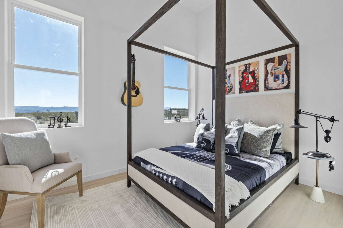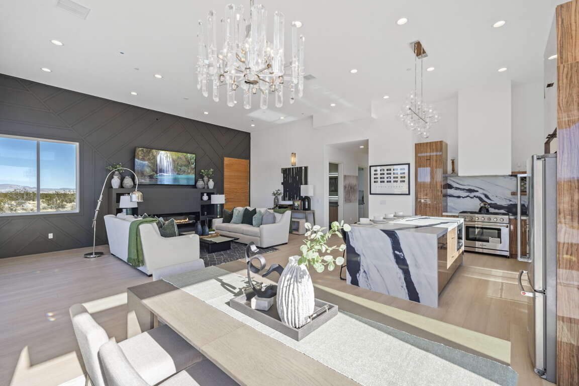 Step inside to soaring 14-foot ceilings and expansive walls of glass that frame jaw-dropping 360-degree views of rugged mountains, iconic Joshua trees, and endless sky. Sunlight pours in by day; at night, the pitch-black surroundings transform the property into a world-class private observatory, perfect for stargazing under some of the clearest, darkest skies on the planet.