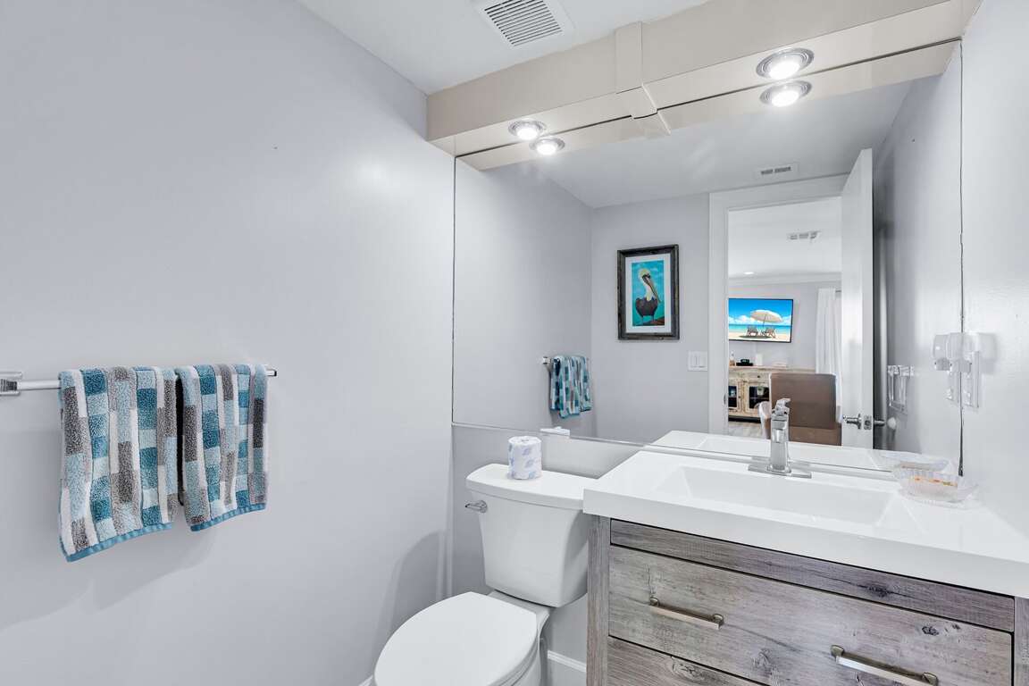 This vacation rental boasts a spacious 1,400 square feet condo unit, featuring a main living area, dining room, kitchen, and half-bathroom on the second floor. On the third level, guests will find a master bedroom with a king-size bed and bathroom, as well as a guest bedroom with two queen beds and an adjoining full bath. The newly renovated kitchen is equipped with new cabinets, quartz countertops, and stainless-steel appliances.