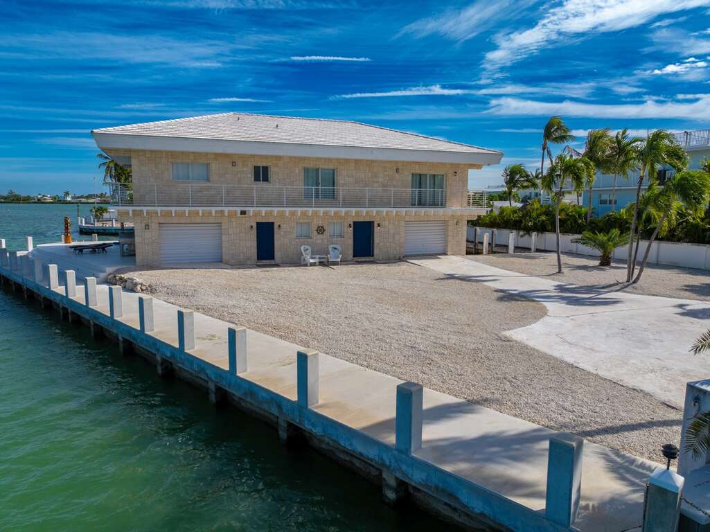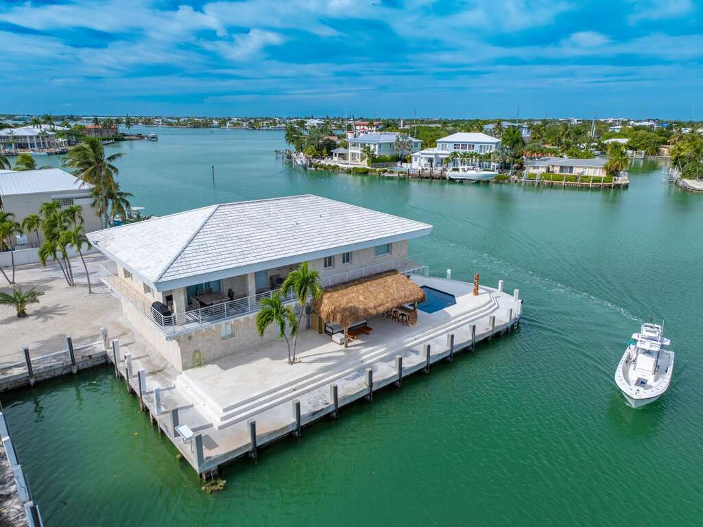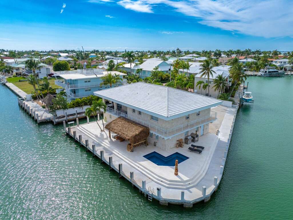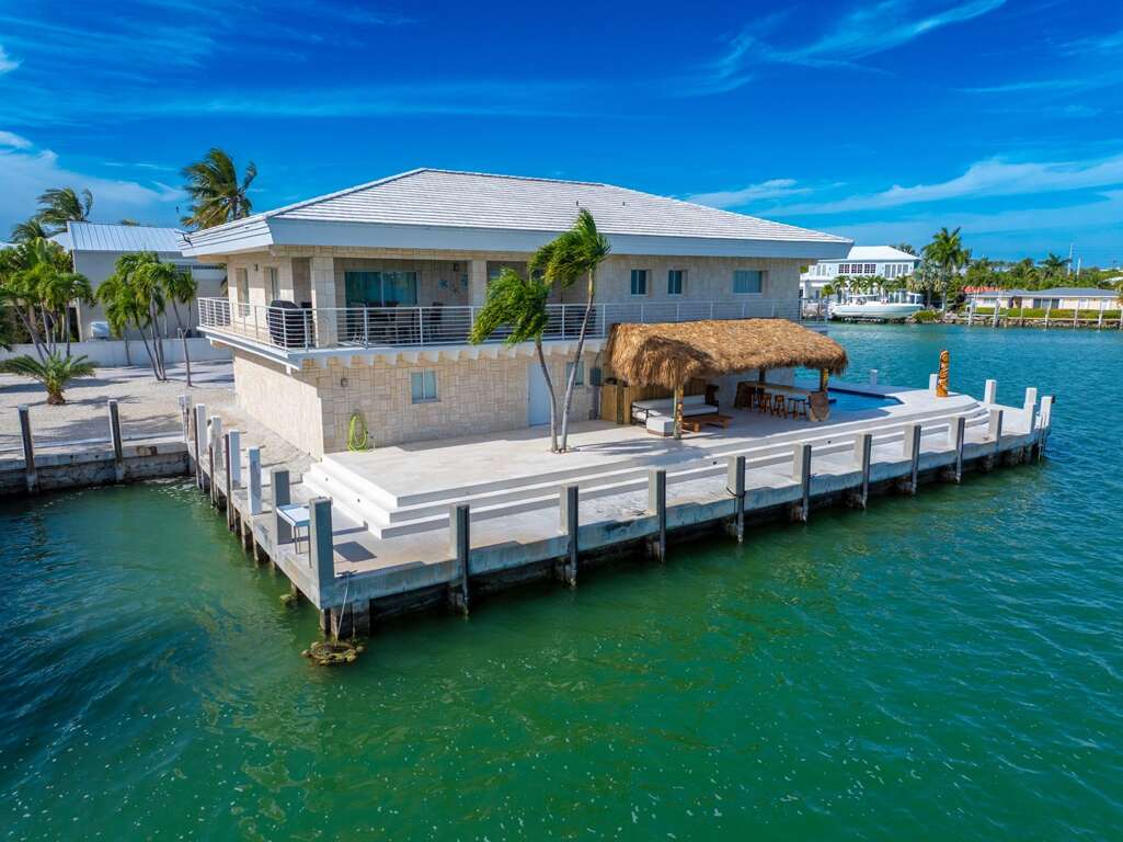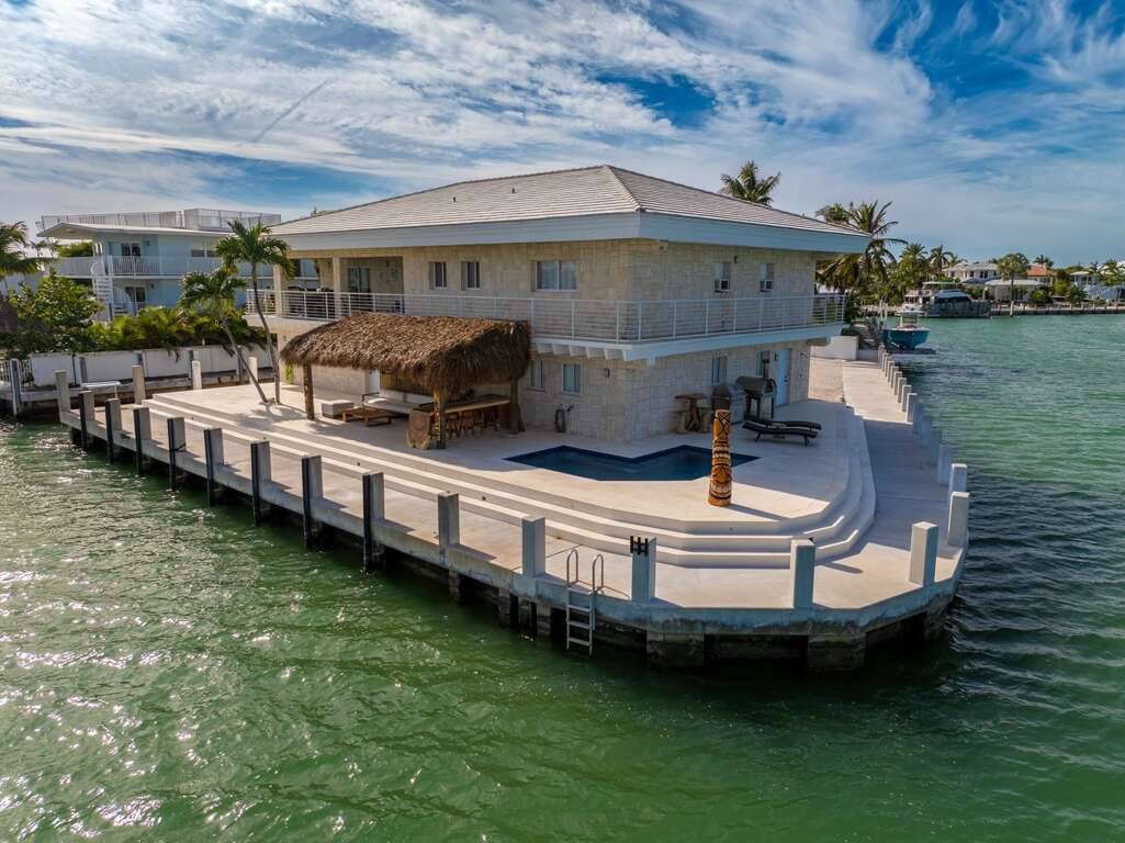 La Pirata sits on one of the most beautiful lots in sought after Key Colony Beach. Private gated point lot with brand new pool, and 354 feet of concrete dockage including a 50-foot protected boat slip. Endless light with panoramic 180-degree open-water views from Vaca Cut to Shelter Bay. 360-degree wrap-around balcony provides waterfront sunrise breakfast to sunset cocktails, as you watch the boat parade go by. New waterfront heated pool with seating for 12, along with a massive 22ft tiki and outdoor bar area!
