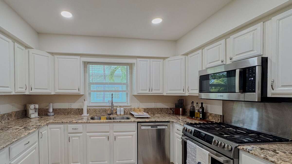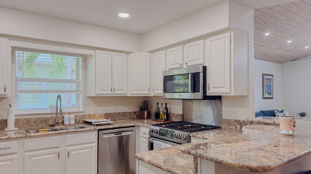 Step inside to find a bright, open-concept living area with plush seating, a large smart TV, and plenty of room to unwind. The fully equipped kitchen features modern appliances, granite countertops, and everything you need to prepare meals at home. Enjoy dining indoors or al fresco on the private patio.