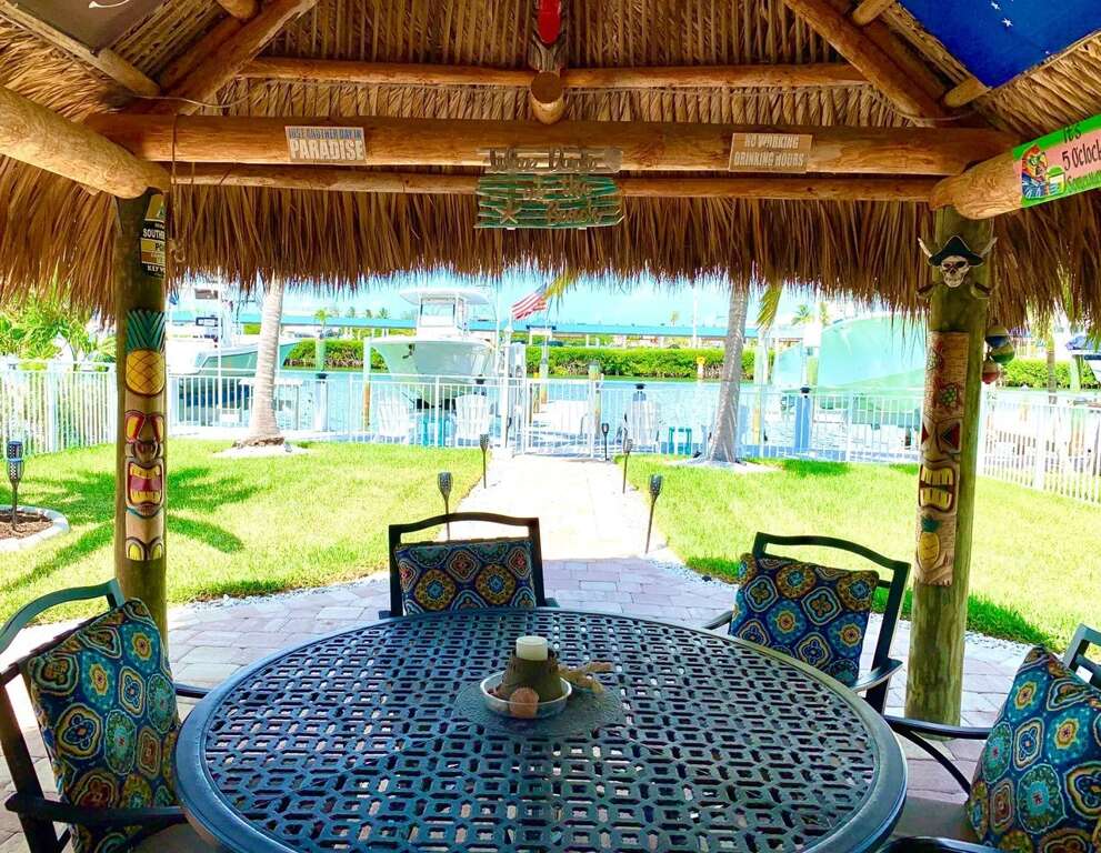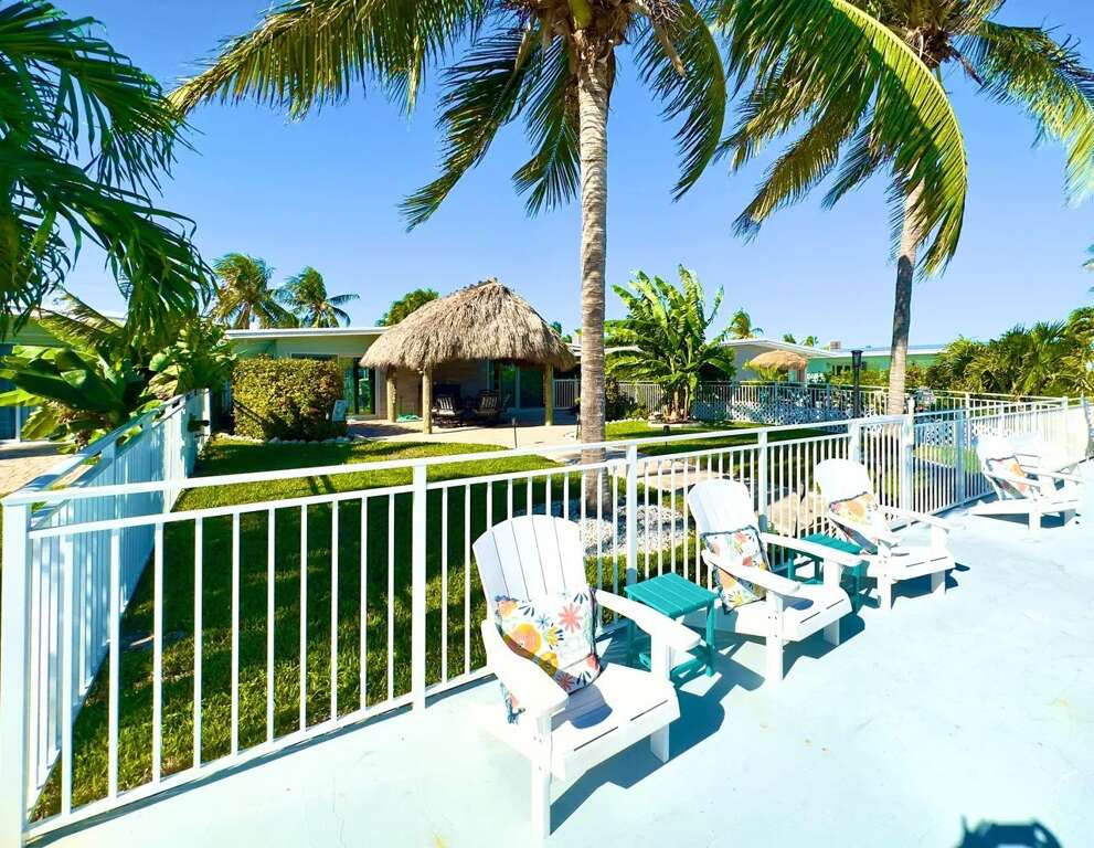 Private waterfront house in Key Colony Beach with a dock, fenced yard, and tiki hut, plus Cabana Beach Club pool access for a relaxed vacation rental.