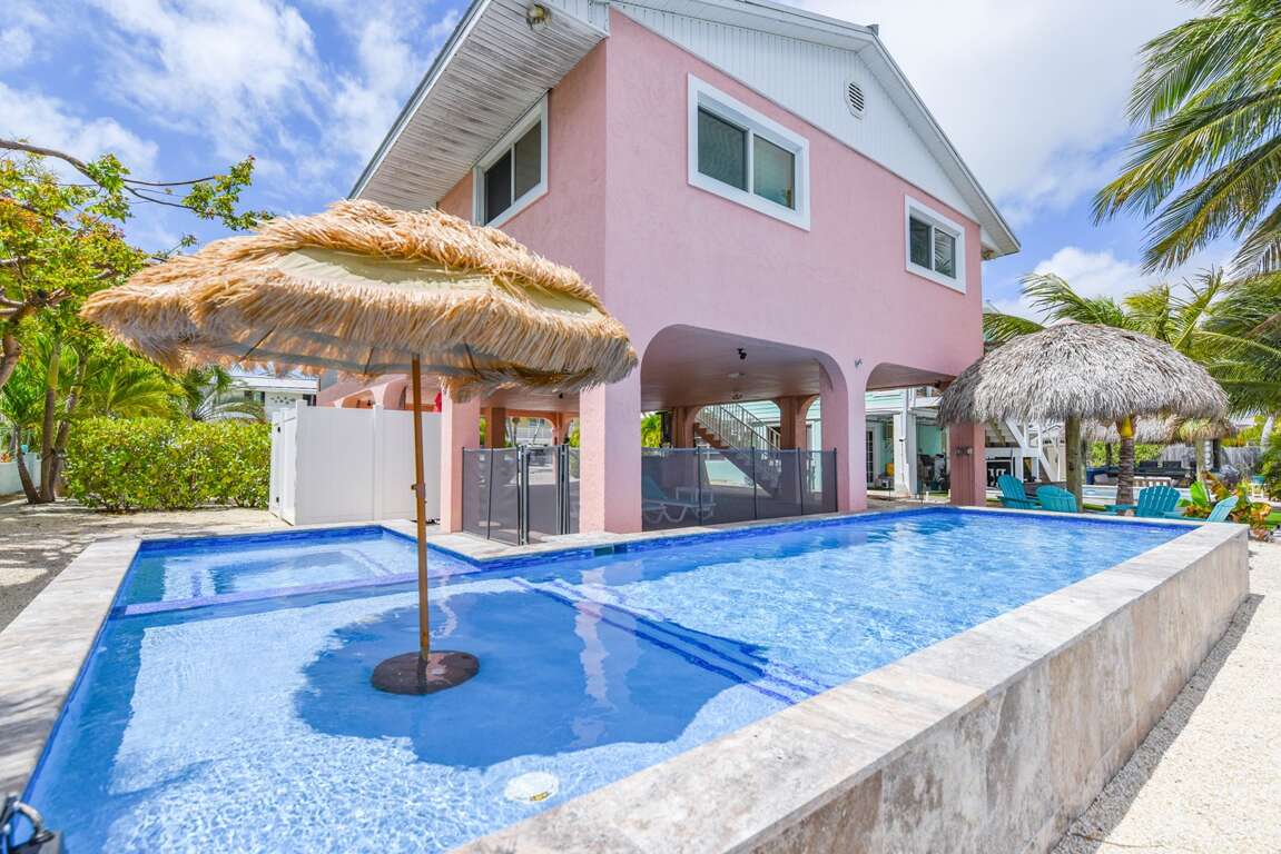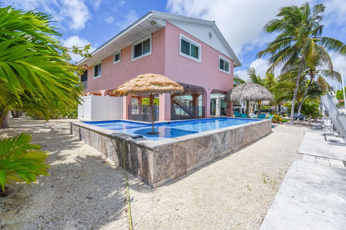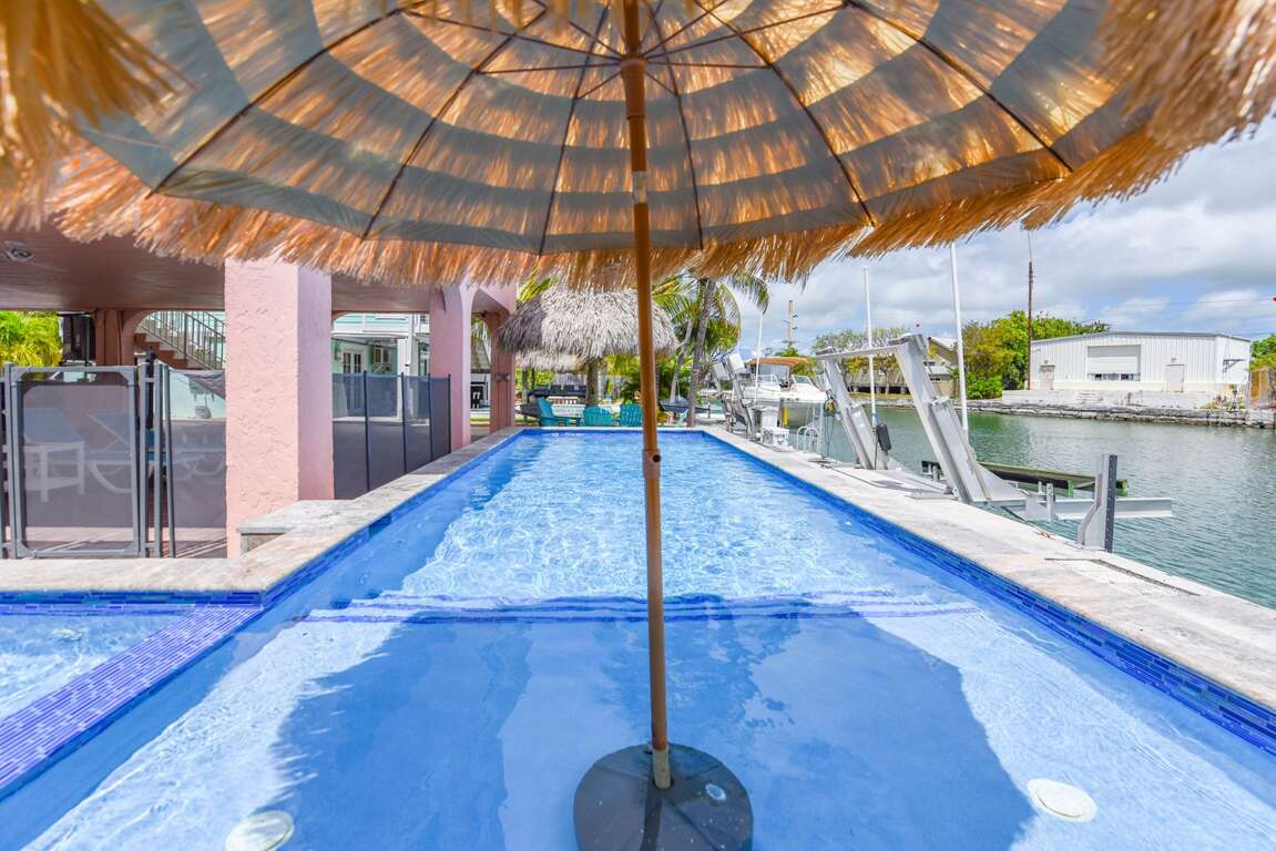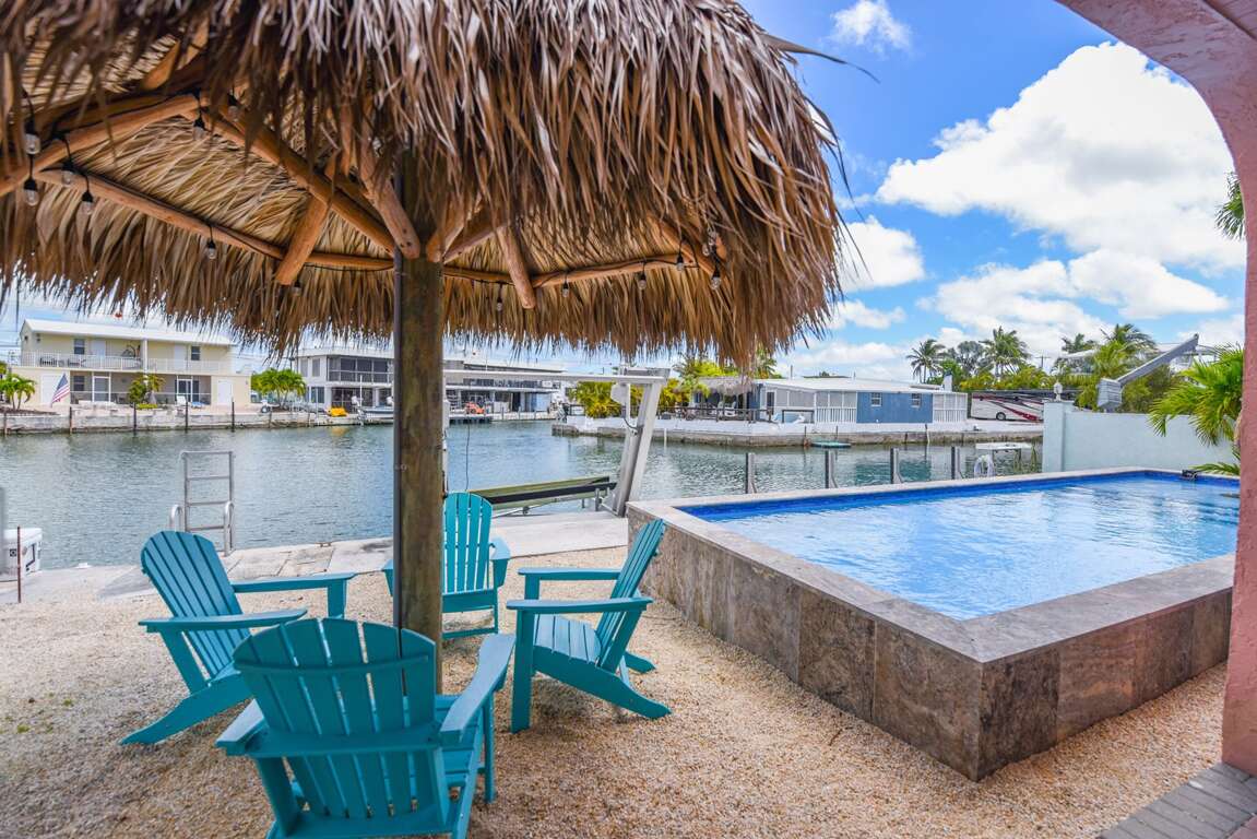 Step outside to your private oasis featuring a heated and chilled pool, allowing for year-round comfort, plus a tiki hut perfect for relaxing afternoons or evening cocktails under the Keys sky.