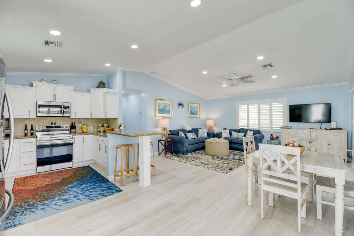 Inside, the home is fully stocked with linens and everything you need for a comfortable stay. Smart TVs in the living room and primary bedroom provide entertainment after a day of fishing, diving, or exploring the Lower Keys.