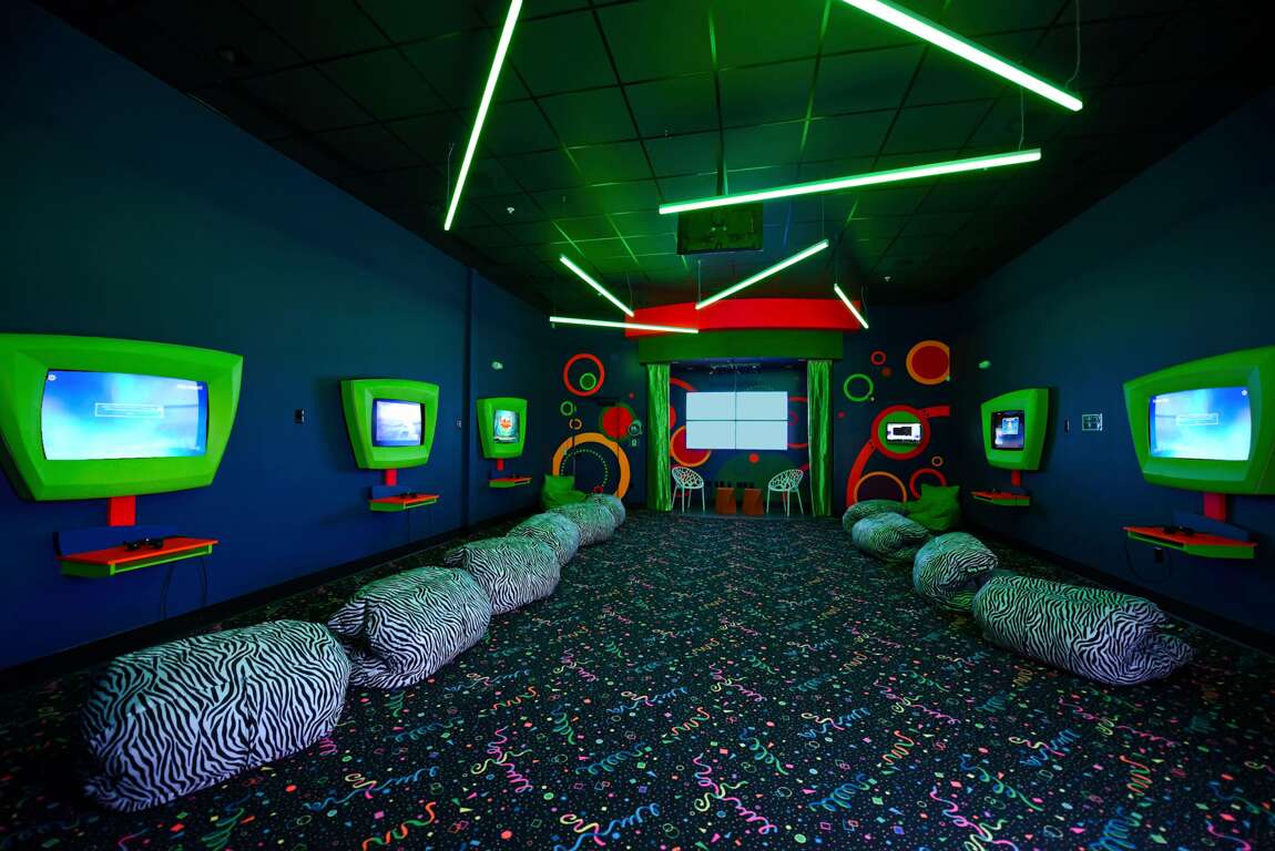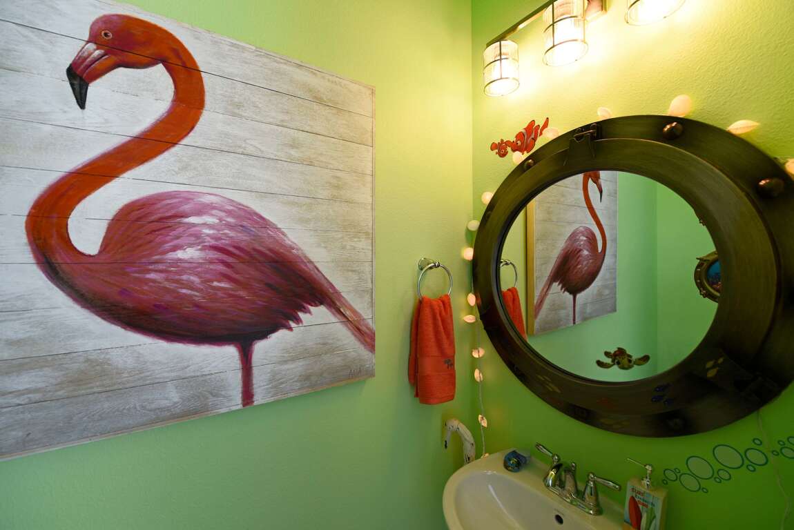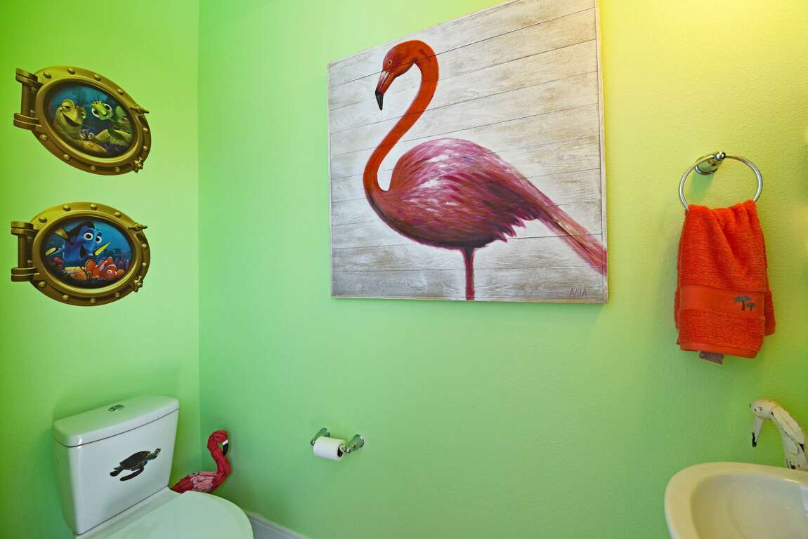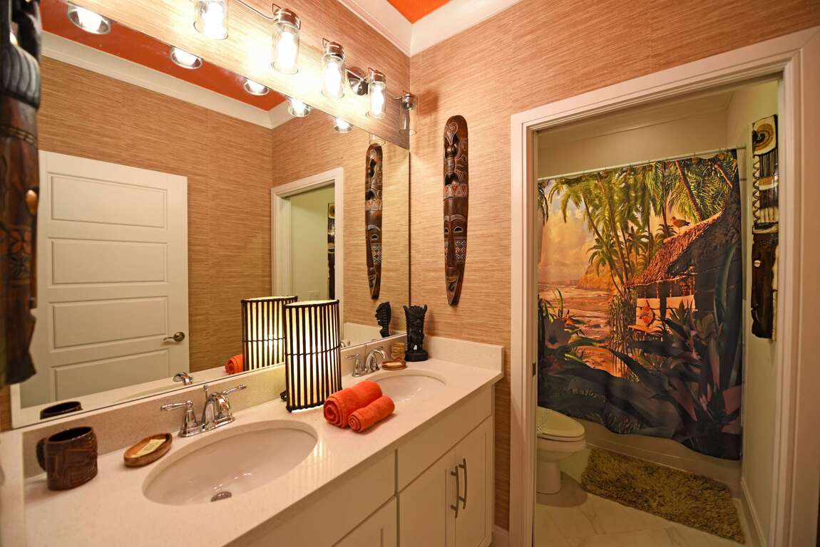 The villa’s relaxing master bedroom, featuring a coffered ceiling, creates a feeling of peace and serenity. Located on the main floor, it is just the place for you to escape. Let the whimsical, sepia-toned map in the Polynesian-inspired bedroom, lead the way as you drift off into your dreams. Located on the second floor, this bedroom is suitable for both kids and adults. The adventure doesn’t end there; the bathrooms are wallpapered and decorated to keep the magic alive throughout your stay.