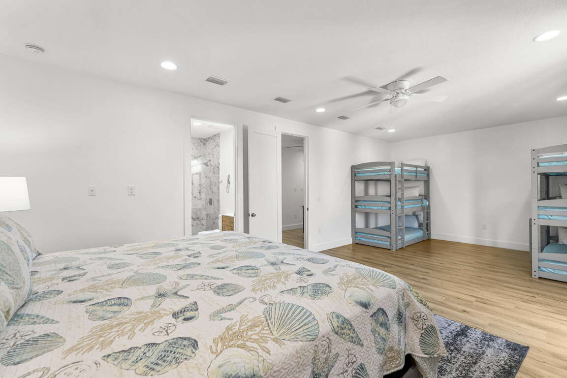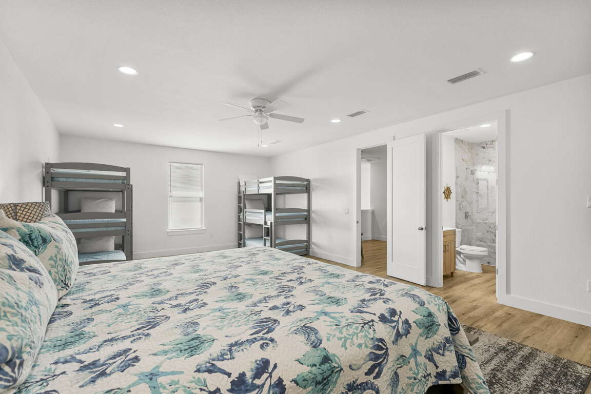 Bedroom with King Bed (Sleeps 2), Six Twin Bunkbeds (Sleeps 6), and Private Bath