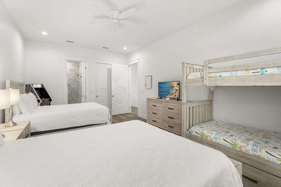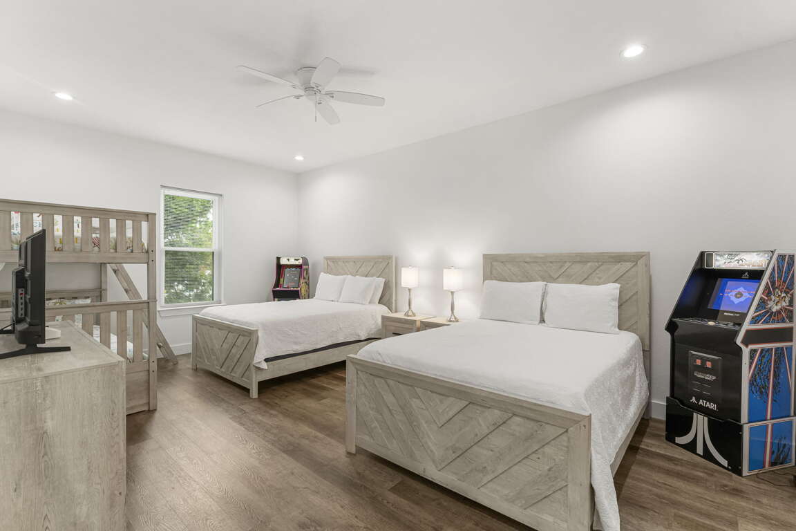 Guest Room with Two Queen Beds, Twin/Twin Bunk, Trundle, 2 Arcades, and Private Bathroom