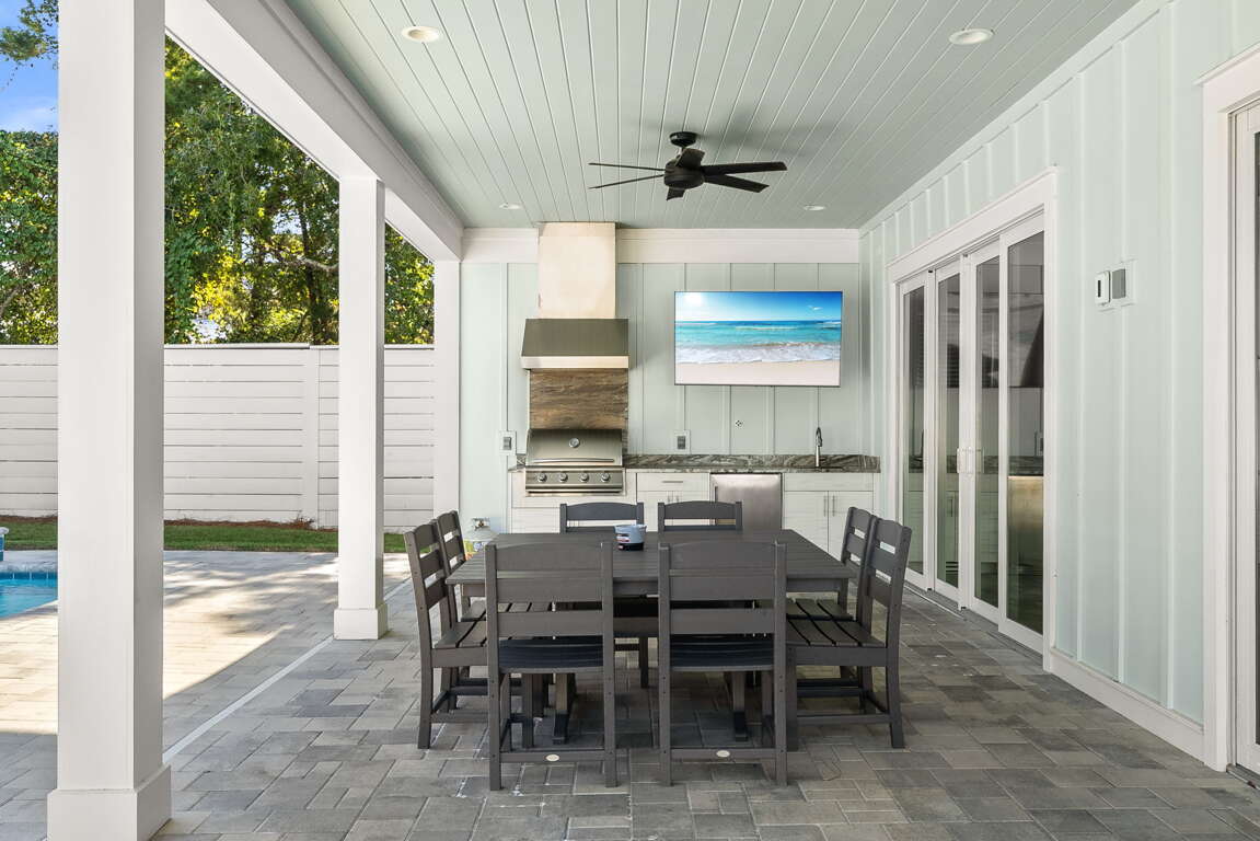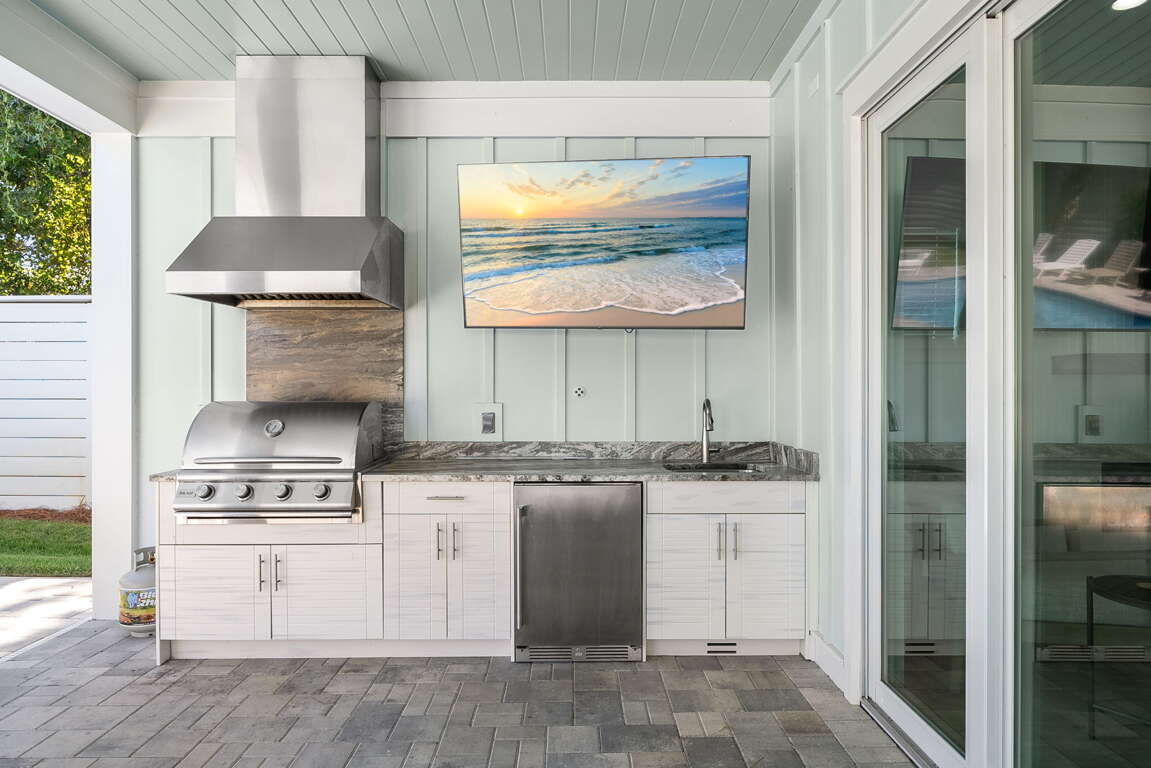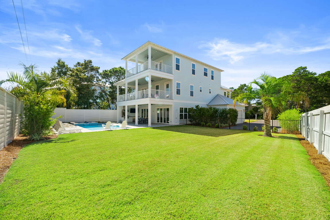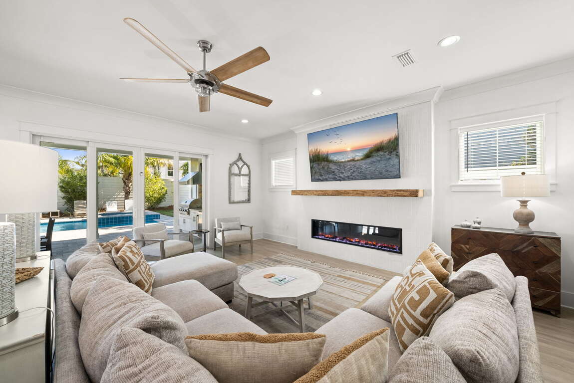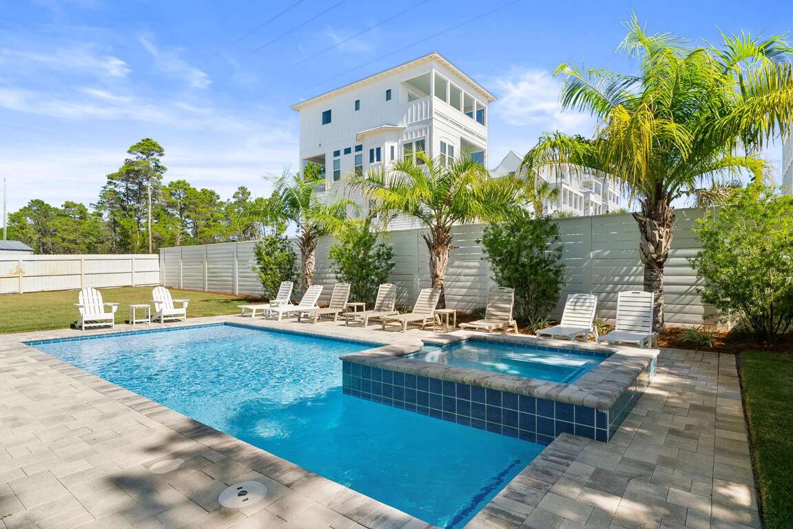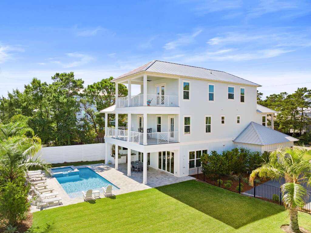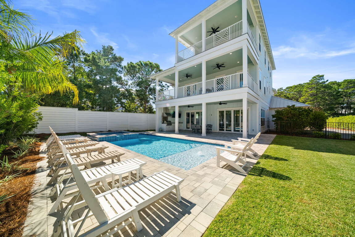 Modern 6-bedroom home in Santa Rosa Beach with a private pool and spa, outdoor kitchen, and low-speed vehicle—an easy-to-share vacation rental near Scenic 30A beaches, Gulf Place dining, and public access.