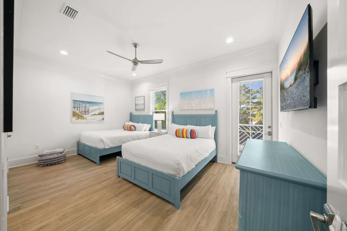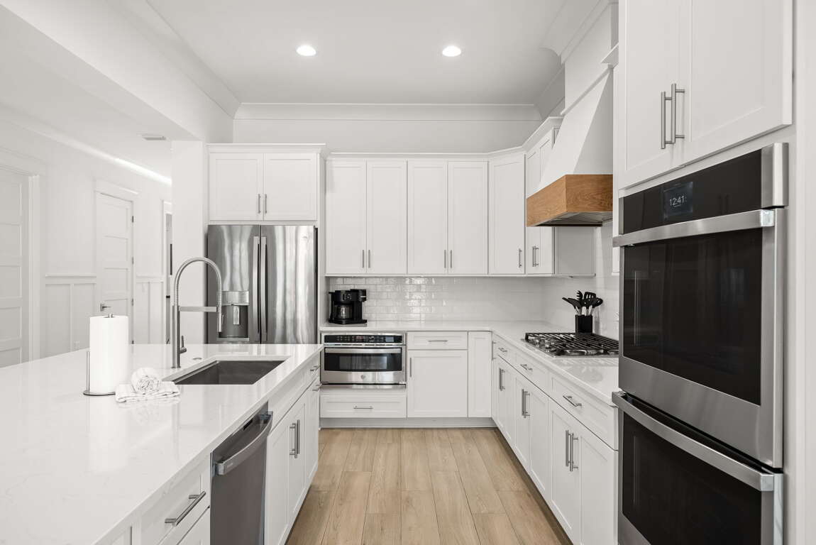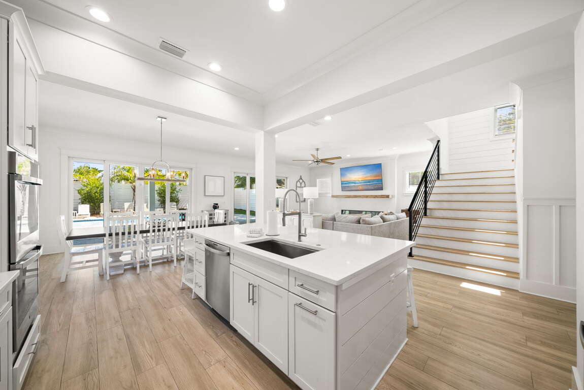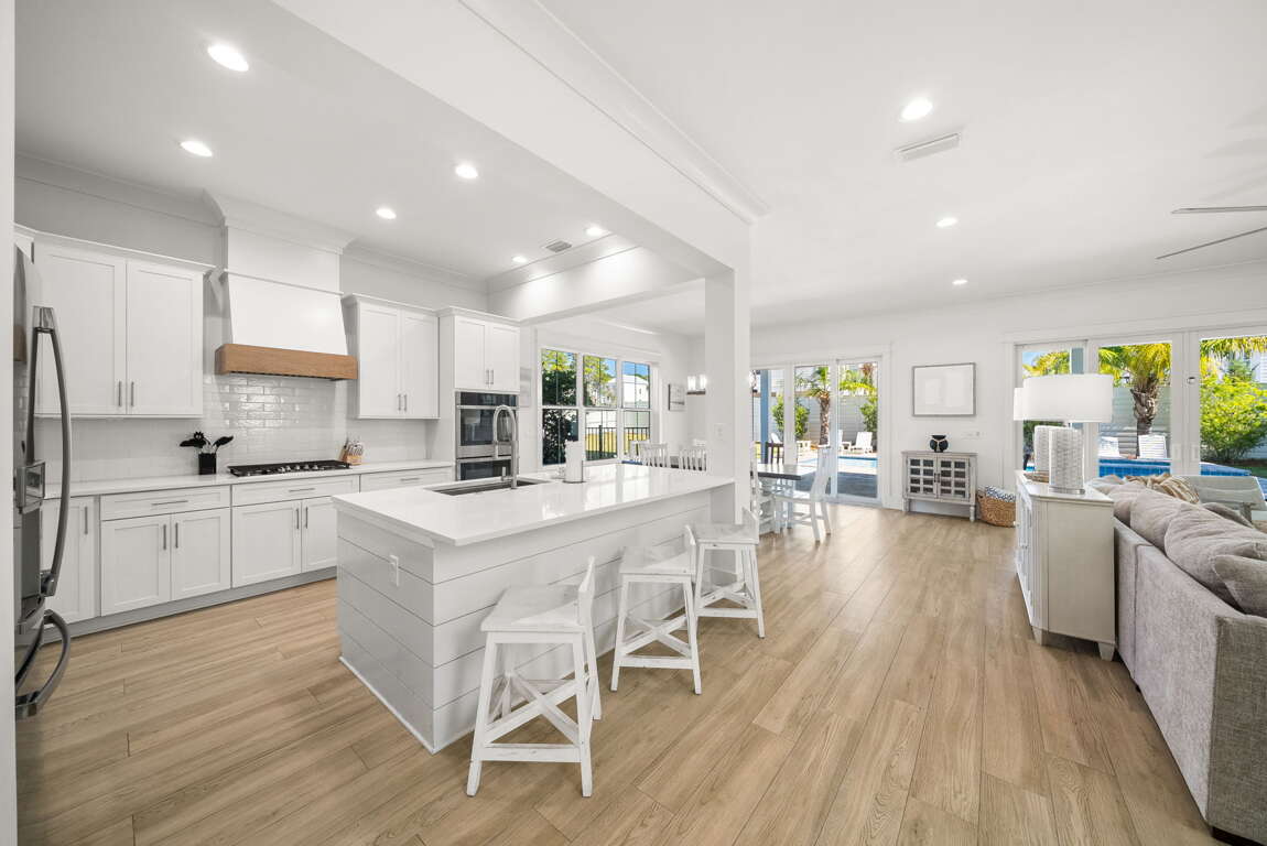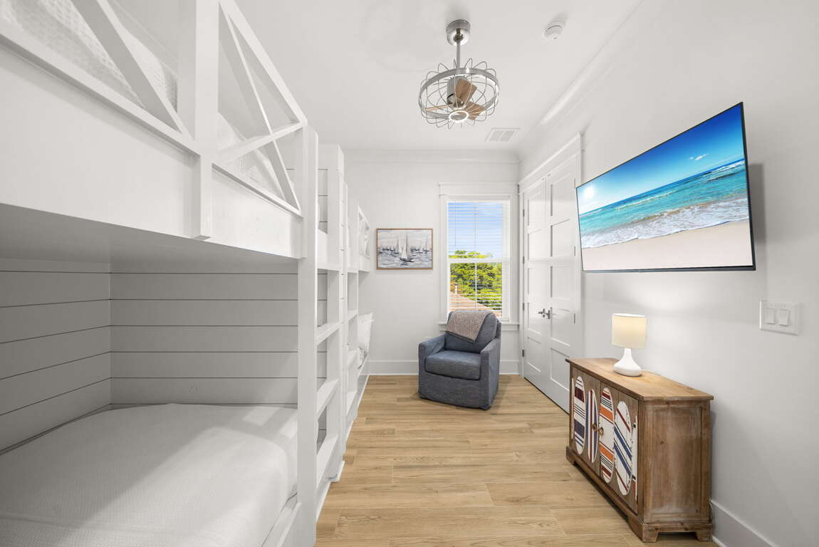 Inside, you’ll find a bright, open-concept living space with coastal décor, shiplap accents, and a modern fireplace. The chef’s kitchen features premium appliances, a large island, and everything you need to cook, dine, and gather. Each bedroom offers plush bedding and a private en-suite bath, including spacious king suites and a custom bunk room.