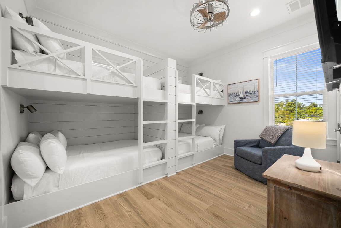 3rd Floor – Bunk room (two Queen-over-Queen bunks) with en-suite sleeps 8; King bedroom with en-suite (shower only) sleeps 2.