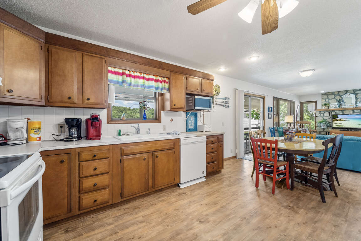 Located within the charming confines of Peaceful Waters House are a plethora of amenities and features designed to enhance your lakeside retreat experience. The living area boasts a cozy setup with a couch, loveseat, flat-screen TV, and DVD player, perfect for unwinding after a day of outdoor adventure. The modern kitchen is equipped with essential appliances like a refrigerator, ice maker, microwave, oven, and dishwasher, ensuring convenience during your stay. For added comfort, there are two full bathrooms and upper level bedrooms with queen beds, along with a downstairs bedroom featuring a twin and bunk bed setup. Outdoor entertainment awaits with a gas grill, fire pit, and a lovely outdoor dining area, allowing you to savor the picturesque surroundings while enjoying a meal with loved ones.