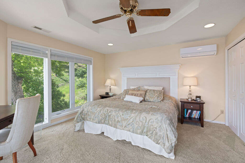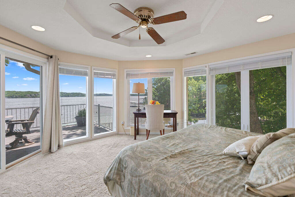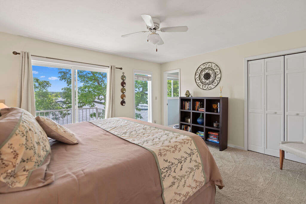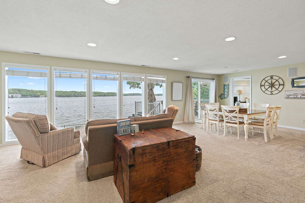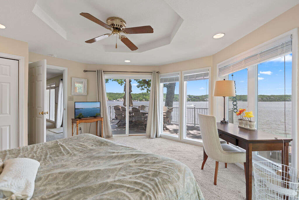 Welcome to your perfect Lake of the Ozarks getaway! The 4 bedroom, 3.5 bathroom house is located at the 25-mile marker and boasts incredible main channel views. The main level has a primary suite with a king bed with its own private bathroom, plus two more bedrooms, one with a king bed and the other one with a king bed plus 2 twins, that share a bath. Downstairs you'll find a spacious living area to gather in, a fully stocked and remodeled kitchen with stainless steel appliances (including 2 refrigerators), and a roomy dining area where everyone can enjoy time together. This level also has another bedroom with a king bed and a wall of windows for epic views, another full bath, a half bath, and laundry room for your convenience.