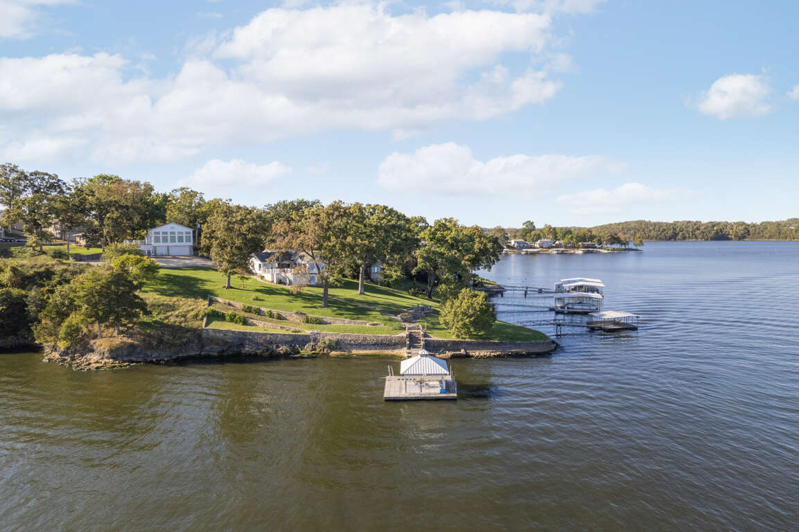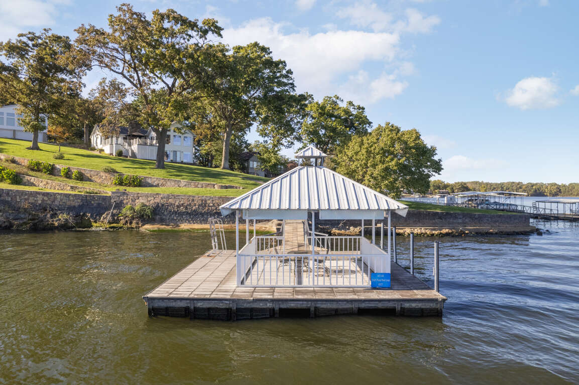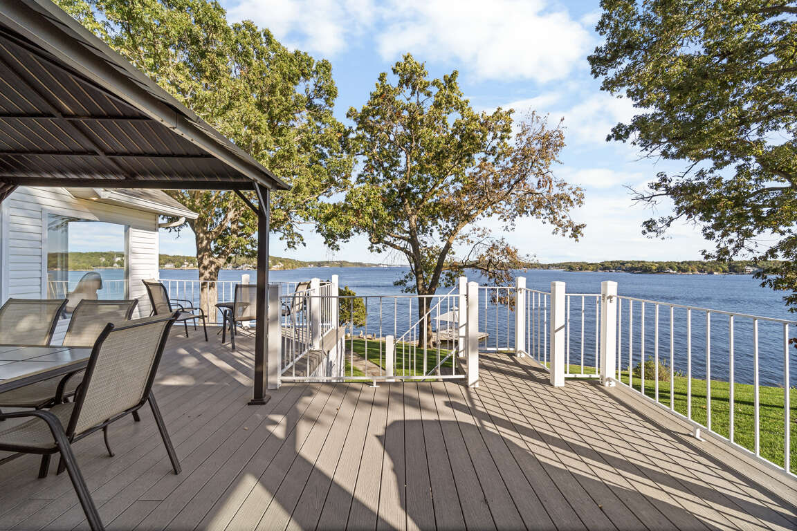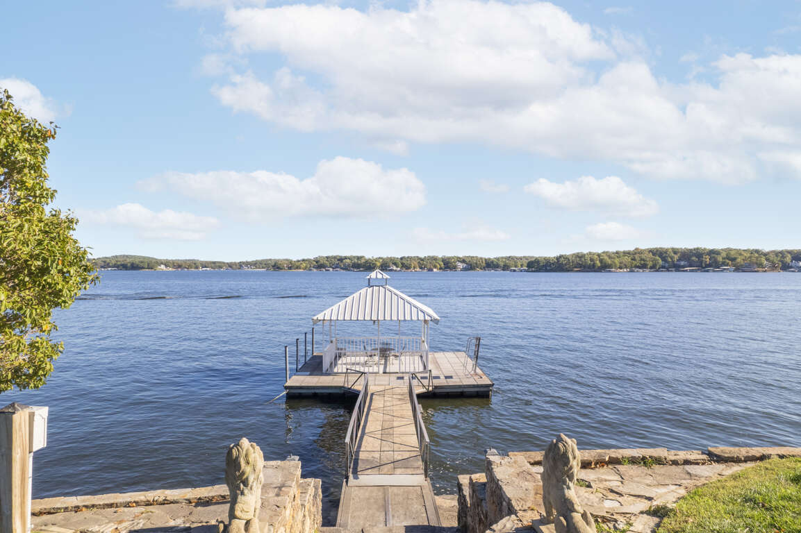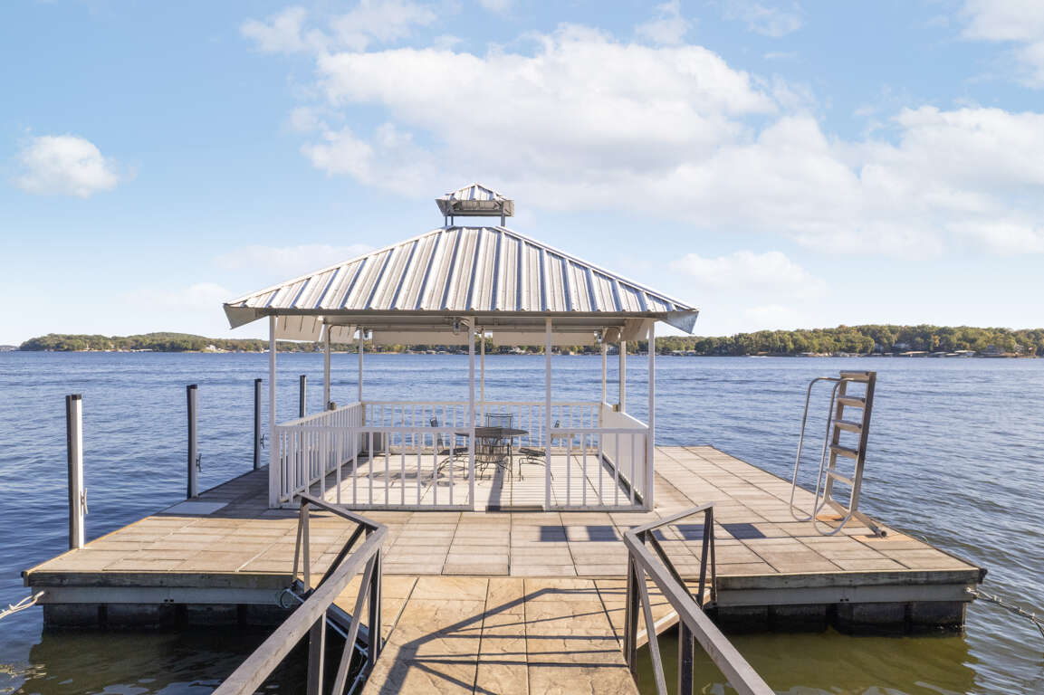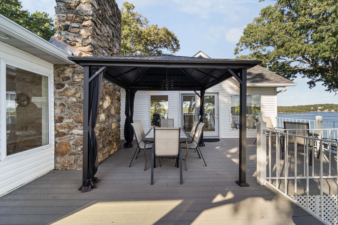Step outside to enjoy the stunning lake views from the large deck, complete with patio furniture, and a gas grill. Down by the water's edge, there's a large rock martini patio (shared with Casablanca guests) with shade trees, patio furniture, and room to relax and watch the boats pass by. Guests also have access to a shared covered gazebo dock with a swim ladder, sun area, and additional seating. The water off the dock is deep, making it perfect for swimming and fishing. While this home does not include a private boat slip, slips are available to rent at nearby Mystic Marina. This quiet-side retreat offers breathtaking panoramic views of the lake, excellent fishing, and unforgettable sunrises. Located just 25-30 minutes from the Bagnell Dam, Lake Ozark and Osage Beach via the community bridge, it's close enough to the action while still providing the peace and relaxation of a private escape.
