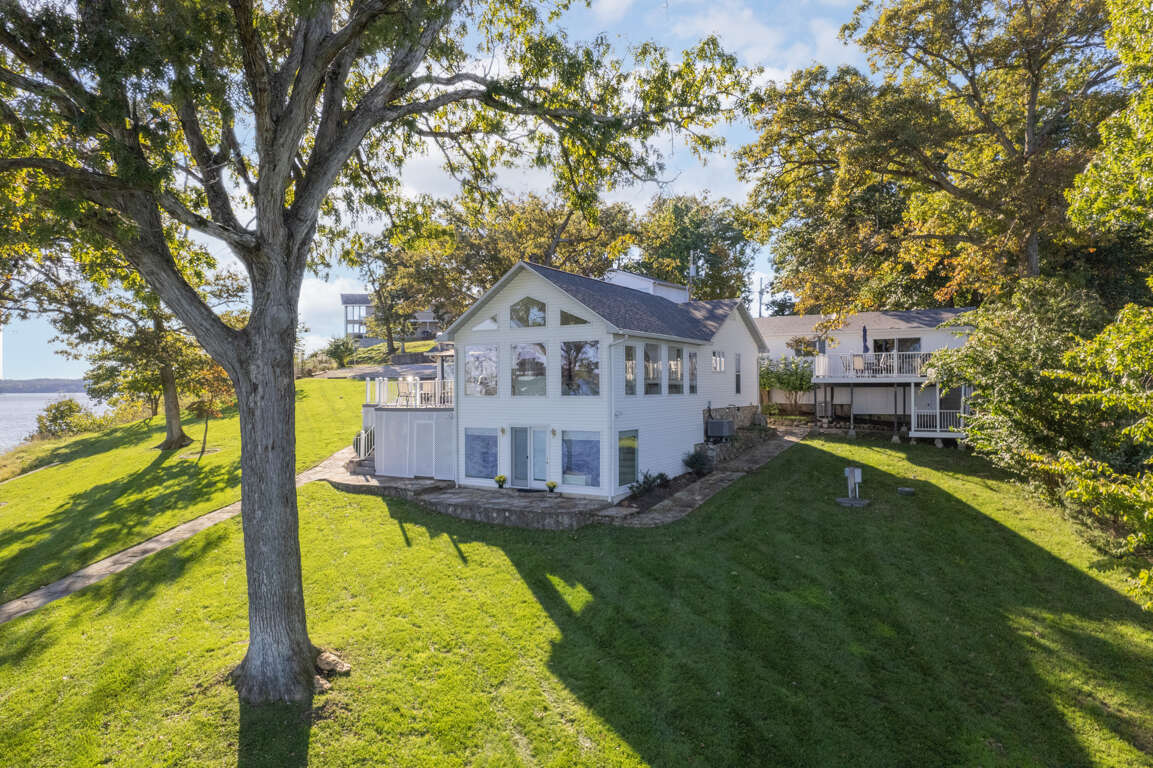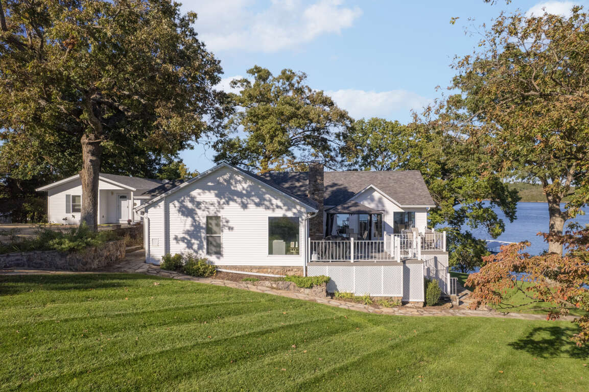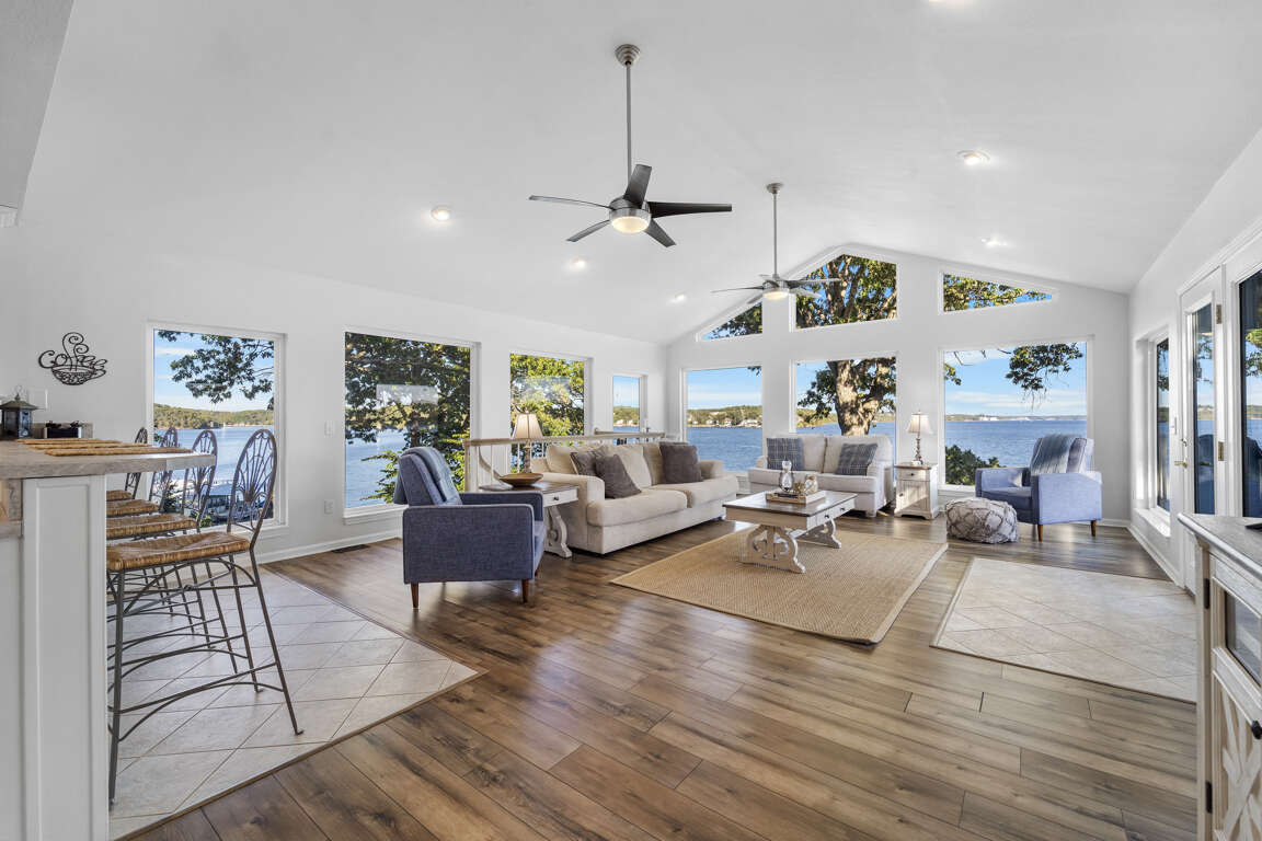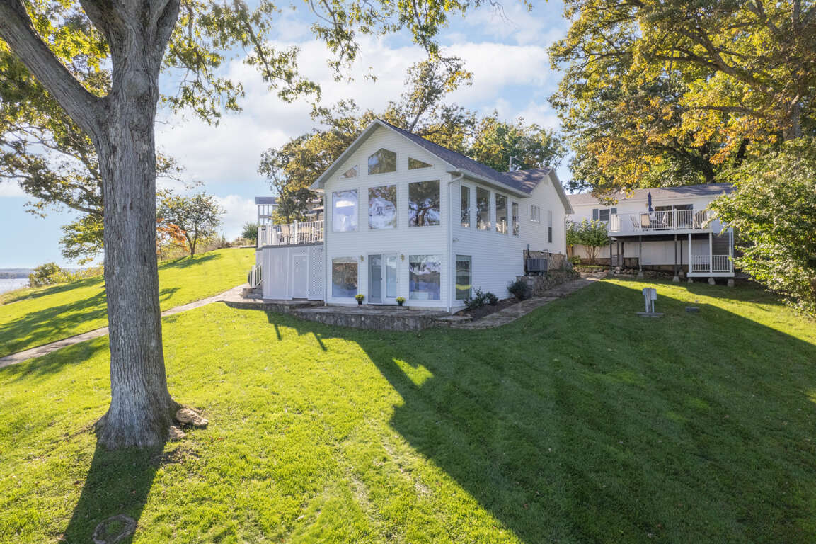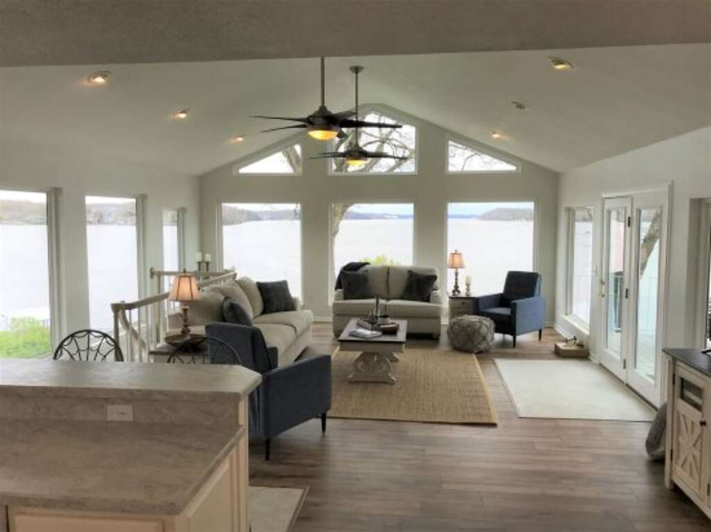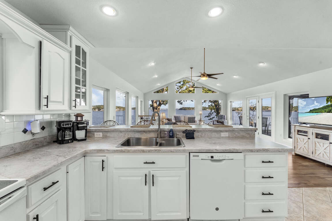Step outside to enjoy the stunning lake views from the large deck, complete with patio furniture, and a gas grill. Down by the water's edge, there's a large rock martini patio (shared with Casablanca guests) with shade trees, patio furniture, and room to relax and watch the boats pass by. Guests also have access to a shared covered gazebo dock with a swim ladder, sun area, and additional seating. The water off the dock is deep, making it perfect for swimming and fishing. While this home does not include a private boat slip, slips are available to rent at nearby Mystic Marina. This quiet-side retreat offers breathtaking panoramic views of the lake, excellent fishing, and unforgettable sunrises. Located just 25-30 minutes from the Bagnell Dam, Lake Ozark and Osage Beach via the community bridge, it's close enough to the action while still providing the peace and relaxation of a private escape.