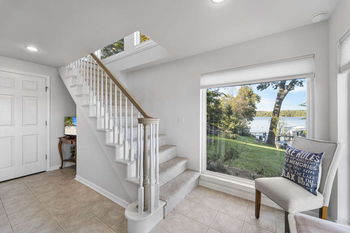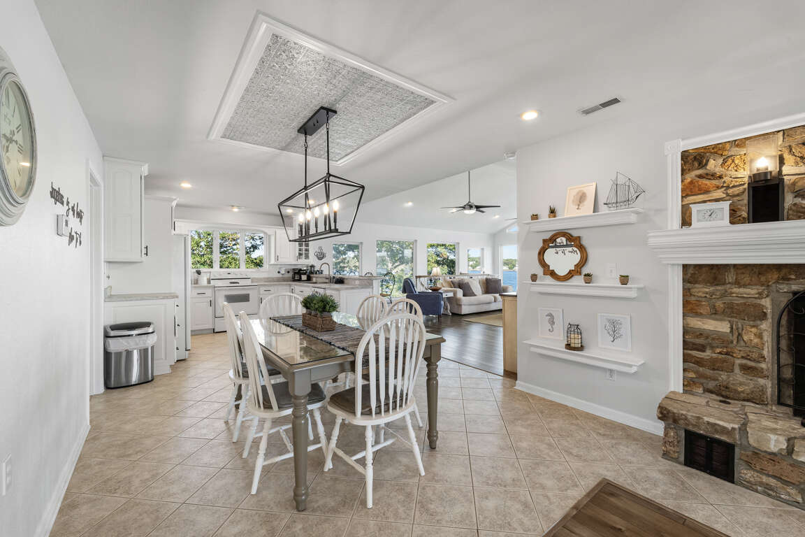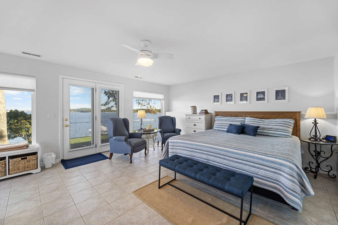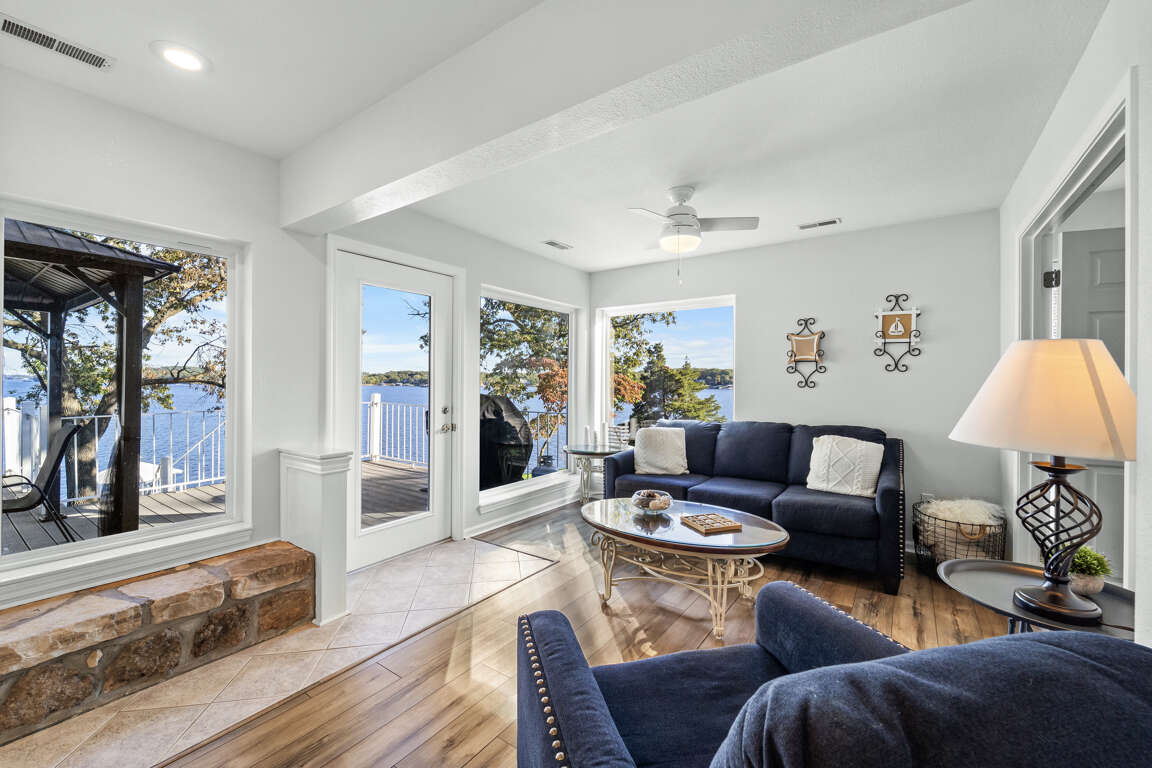 The main level features a welcoming living room with a gas log fireplace, a wall of windows showcasing the lake, and queen sofa sleeper. This open space flows into the fully equipped kitchen and breakfast bar, making it perfect for gathering. You'll also find a dining area and a second, smaller living room with a lake view. Two bedrooms with queen beds and a full bath complete this floor. The lower level is home to the spacious primary suite with a king-size bed and a full bath with shower and jetted tub, and direct access to an outdoor rock patio.
