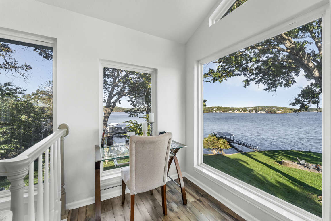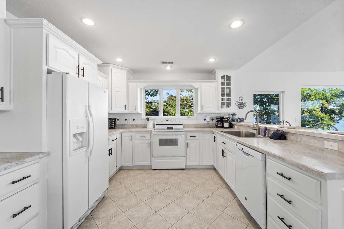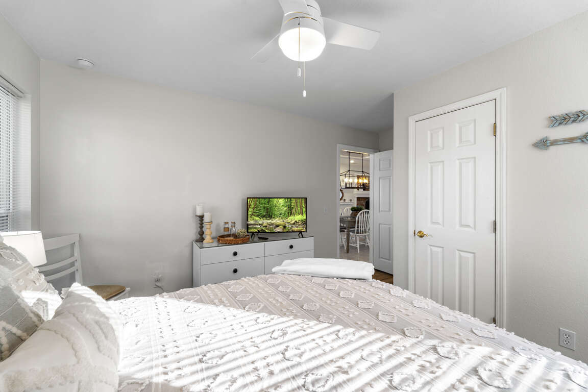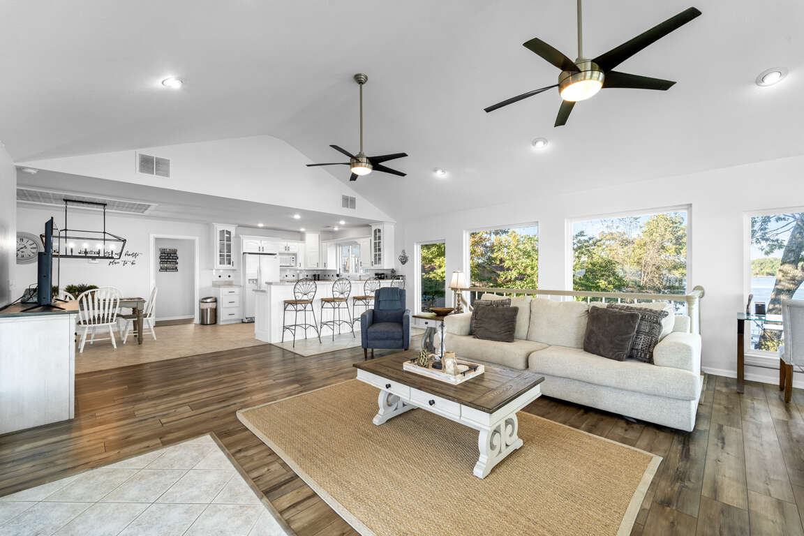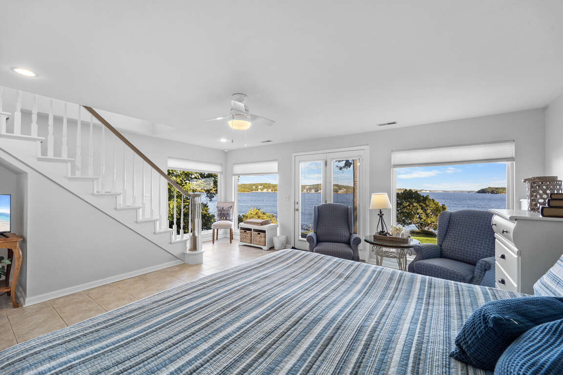The main level features a welcoming living room with a gas log fireplace, a wall of windows showcasing the lake, and queen sofa sleeper. This open space flows into the fully equipped kitchen and breakfast bar, making it perfect for gathering. You'll also find a dining area and a second, smaller living room with a lake view. Two bedrooms with queen beds and a full bath complete this floor. The lower level is home to the spacious primary suite with a king-size bed and a full bath with shower and jetted tub, and direct access to an outdoor rock patio.