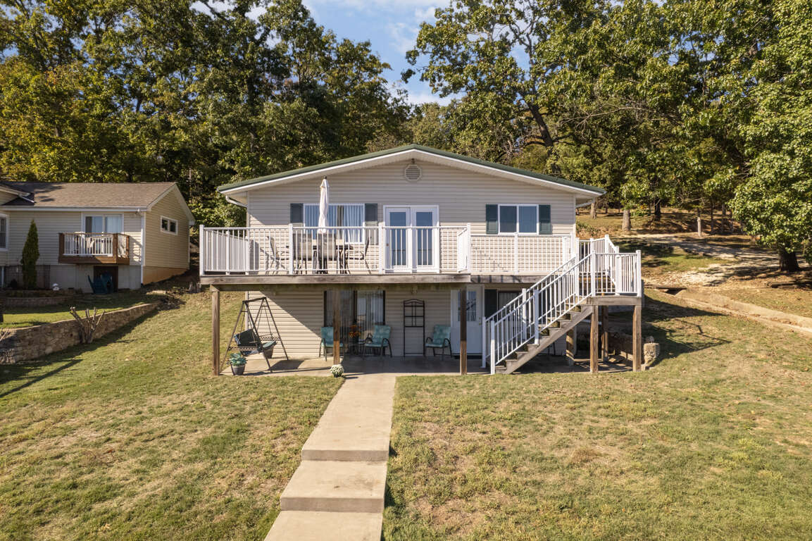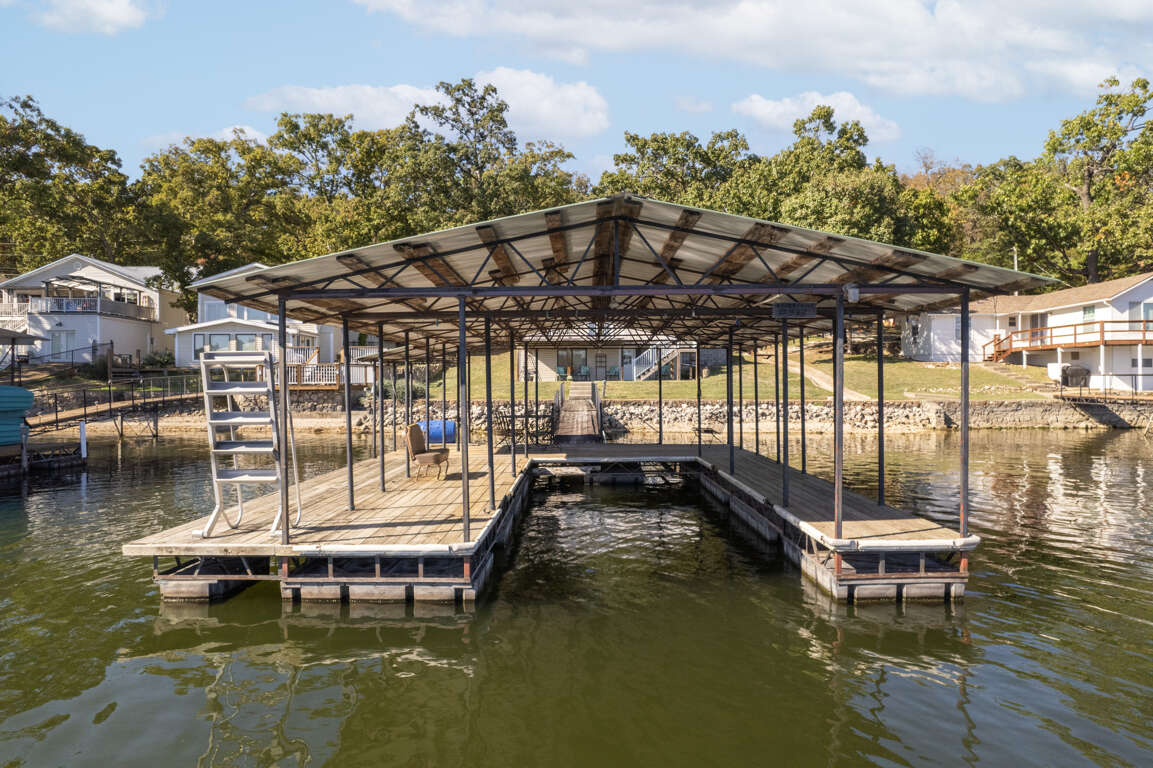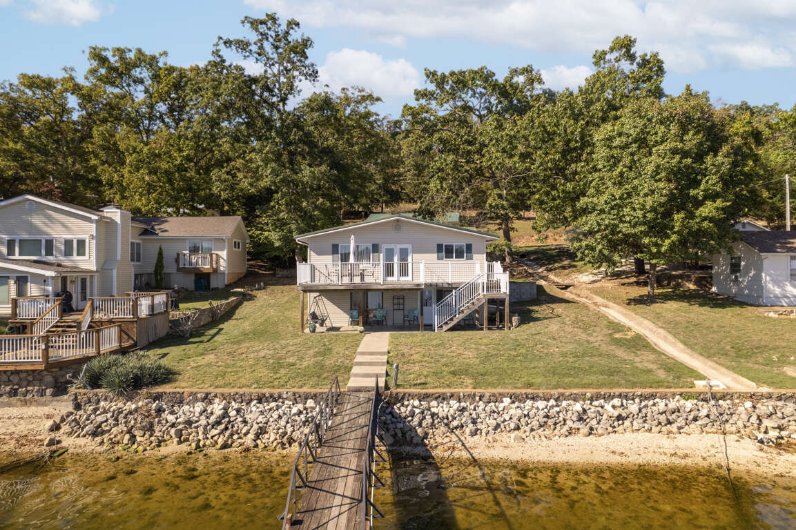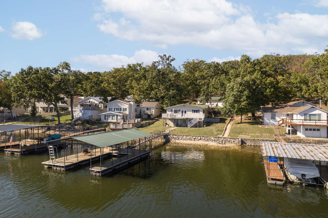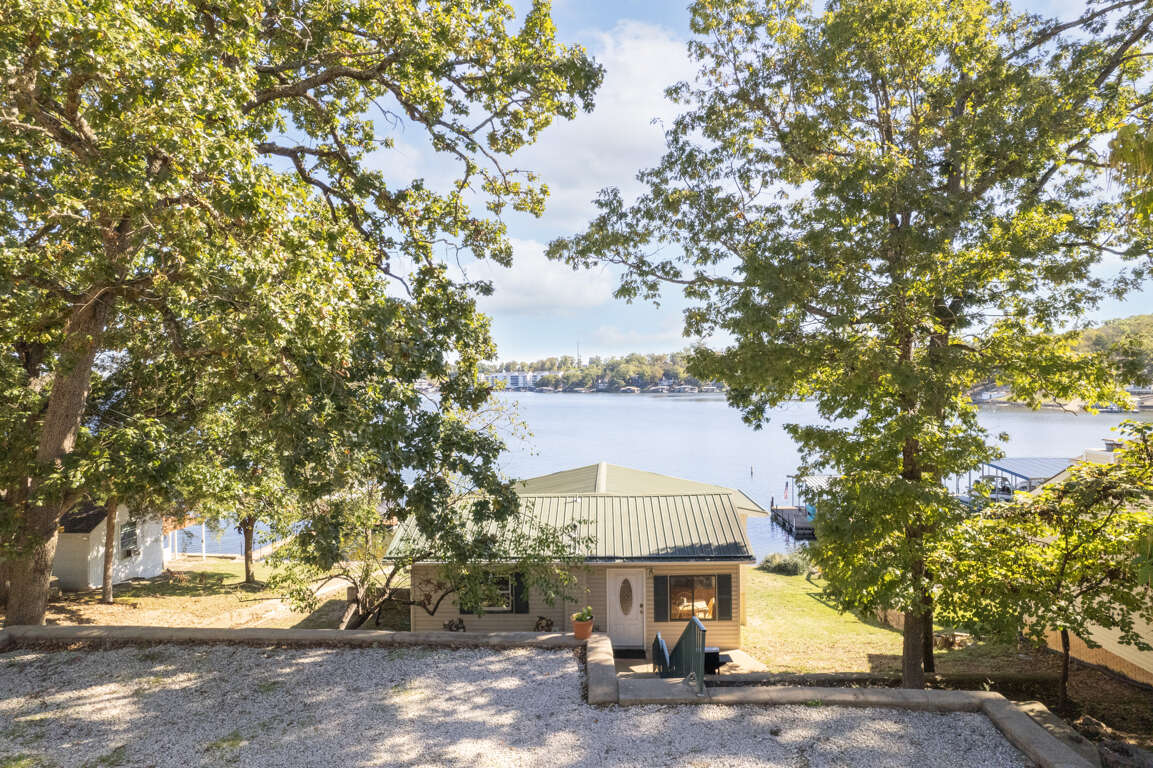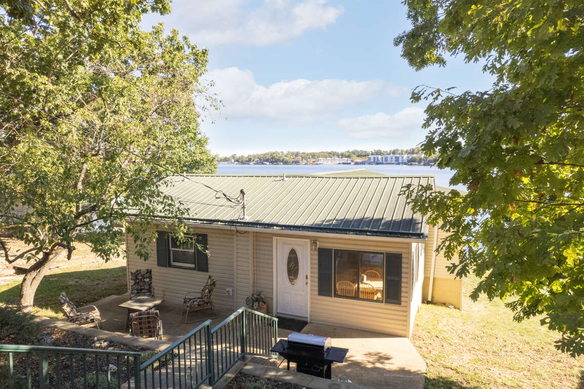 Escape to this cozy lakefront cabin, tucked in a peaceful cove, just 1 mile off the Gravois Arm. With parking for up to four vehicles, a spacious grassy yard, shade trees, a terraced garden, and a private dock, it's the perfect spot to relax and unwind. Inside, the open layout features a living room with a full size sleeper sofa and flat-screen TV, a dining area, fully equipped kitchen, laundry room, and a full bathroom with a walk-in shower. The cabin has two bedrooms, each with a queen bed, and comfortably sleeps six. Guests can also enjoy two patios - ideal for morning coffee or evening grilling - plus a covered dock area for shade and fishing.