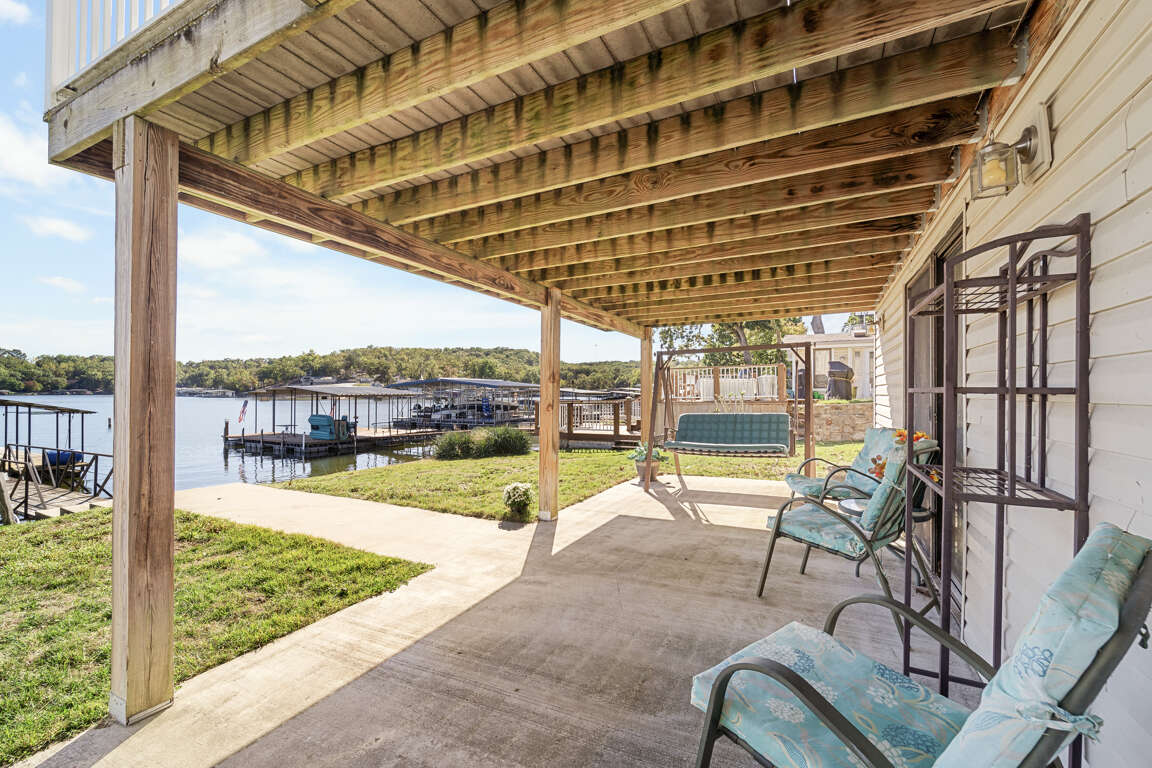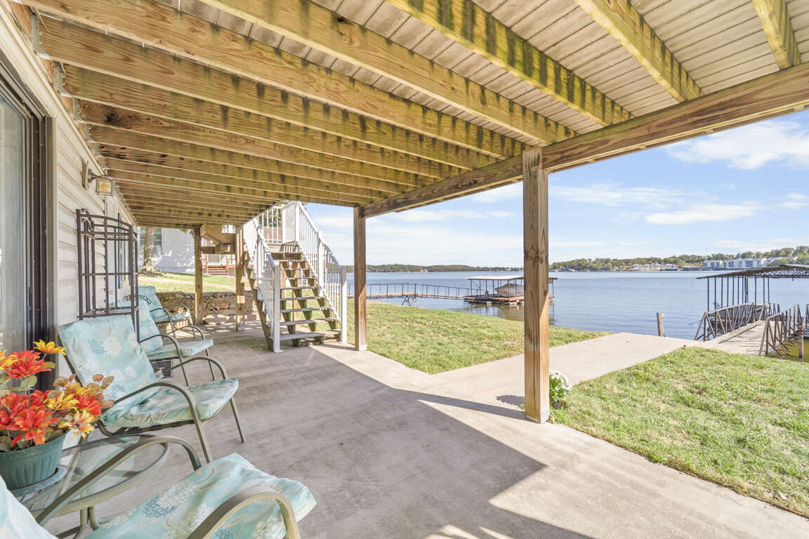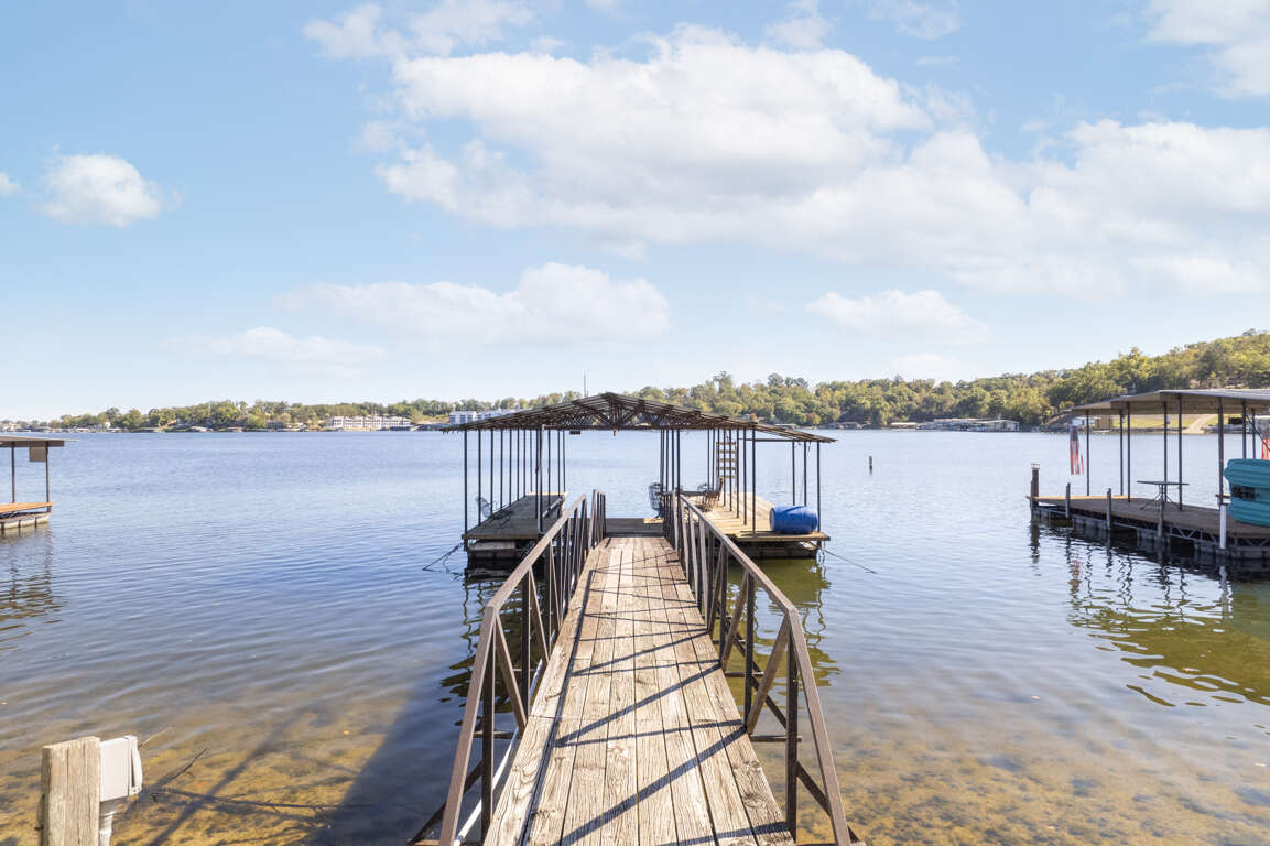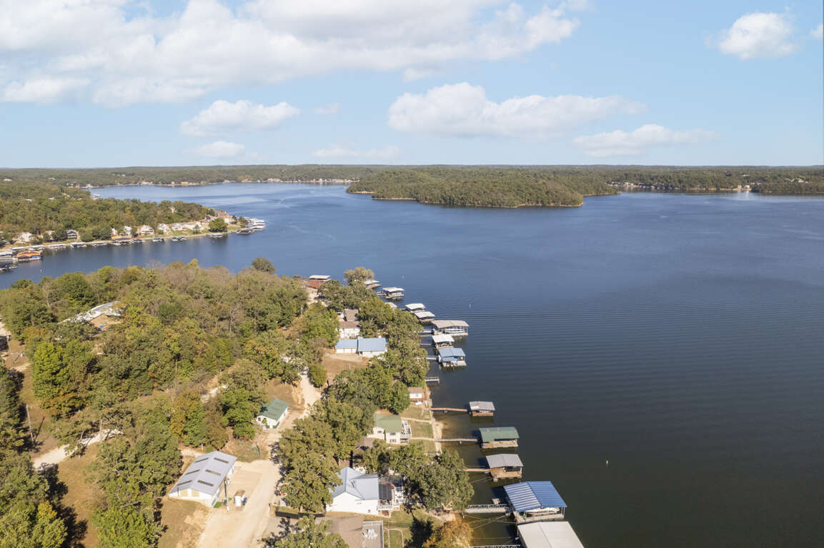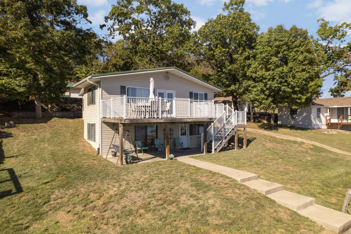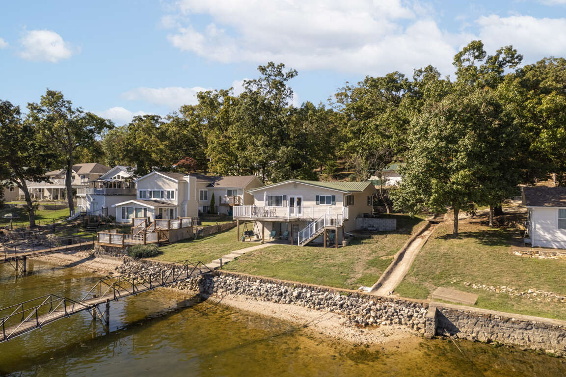 Escape to this cozy lakefront cabin, tucked in a peaceful cove, just 1 mile off the Gravois Arm. With parking for up to four vehicles, a spacious grassy yard, shade trees, a terraced garden, and a private dock, it's the perfect spot to relax and unwind. Inside, the open layout features a living room with a full size sleeper sofa and flat-screen TV, a dining area, fully equipped kitchen, laundry room, and a full bathroom with a walk-in shower. The cabin has two bedrooms, each with a queen bed, and comfortably sleeps six. Guests can also enjoy two patios - ideal for morning coffee or evening grilling - plus a covered dock area for shade and fishing.