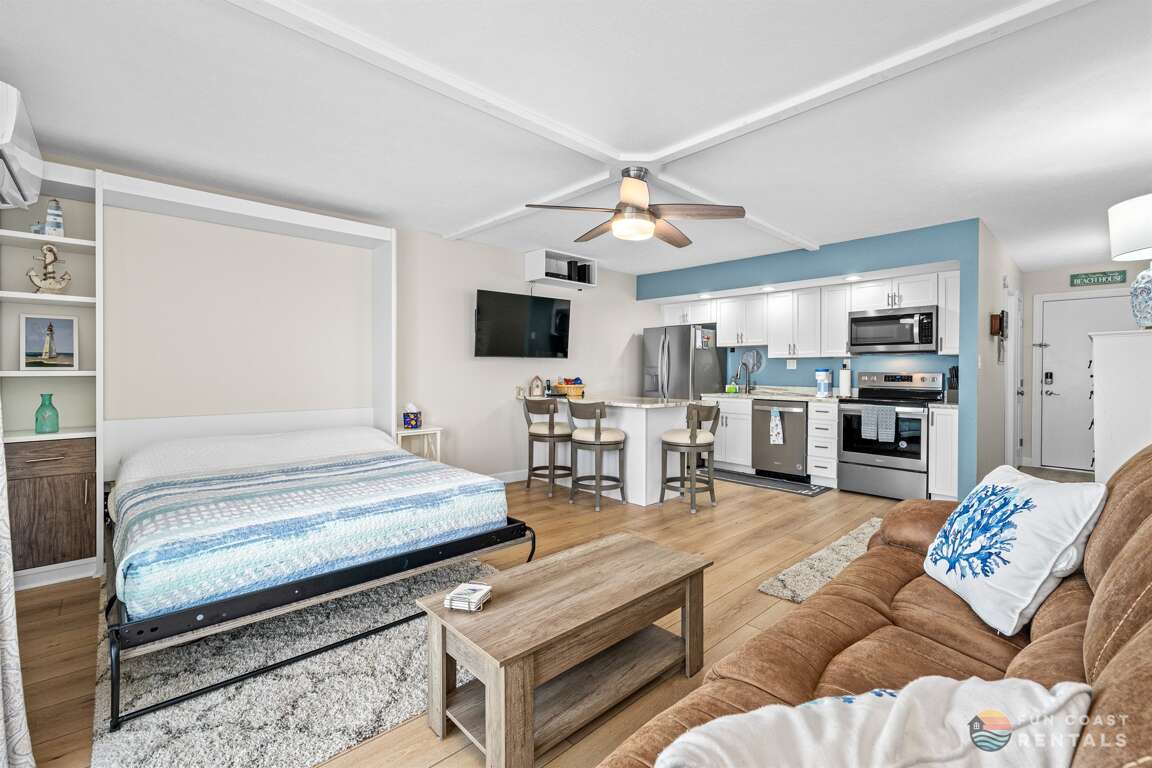 Start each morning enjoying beautiful Atlantic Ocean sunrises with a cup of your favorite coffee or tea from the 4th floor east-facing balcony! Soak up some sun at the newly-renovated on-property pool or have yourself a relaxing beach day immediately across the street in the golden sands of NSB–next to the 27th Ave Beachfront Park. Recreate your favorite meals seaside in the updated, fully-equipped stainless steel kitchen. Your pied-à -terre in one of Florida's best kept secrets awaits!