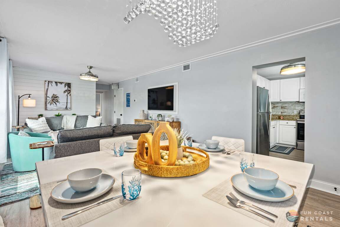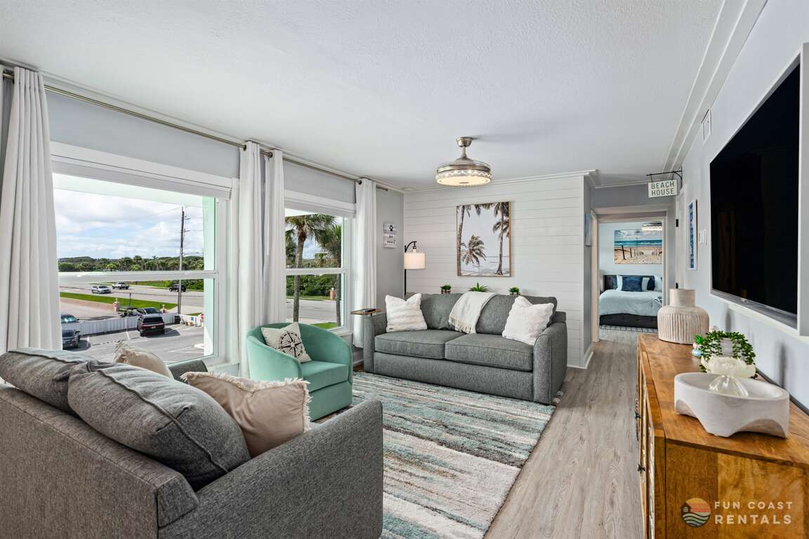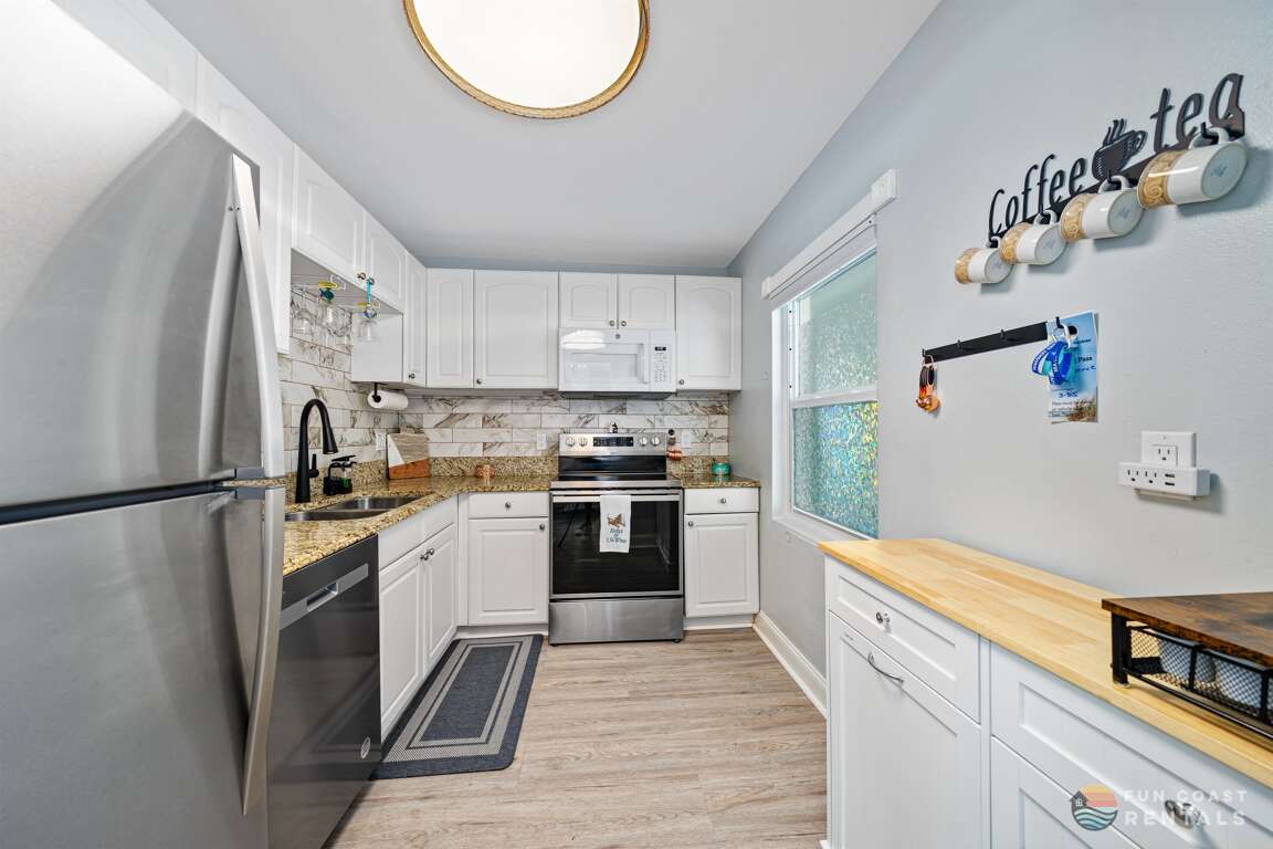 Welcome to Ocean Sol! This absolutely STUNNING 1 bedroom, 1 bathroom modern ultra-chic 3rd floor condo is an absolute GEM ideally located just a 30 second stroll from beach for the ultimate stay in NSB! Enjoy your morning coffee listening to the sound of the waves, recreate your favorite meals seaside in the fully-equipped stainless steel kitchen, relax in the spacious living area or relax at one of TWO on-site pools, shuffleboard courts, and clubhouse!