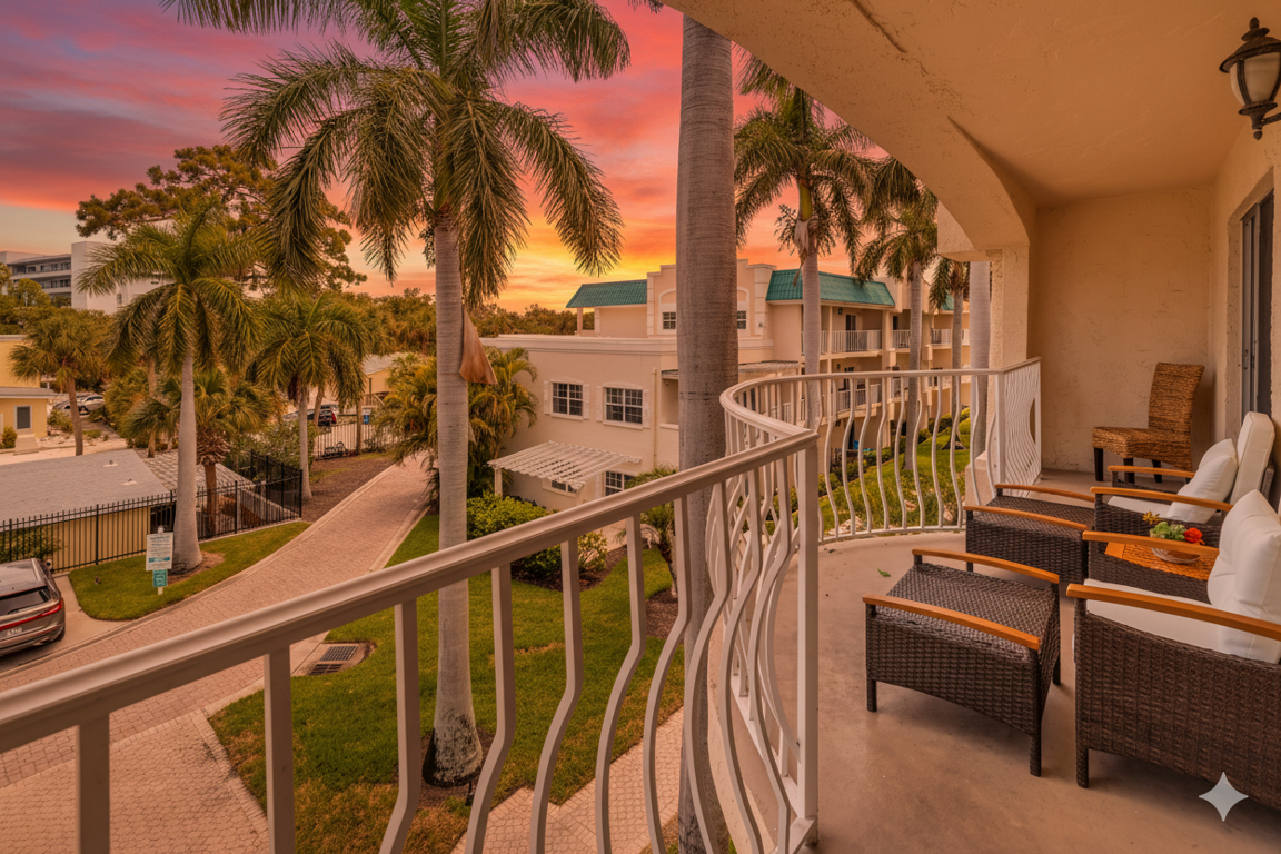 β The Balcony – royal palm views from balcony connecting bedrooms and living area<br />
