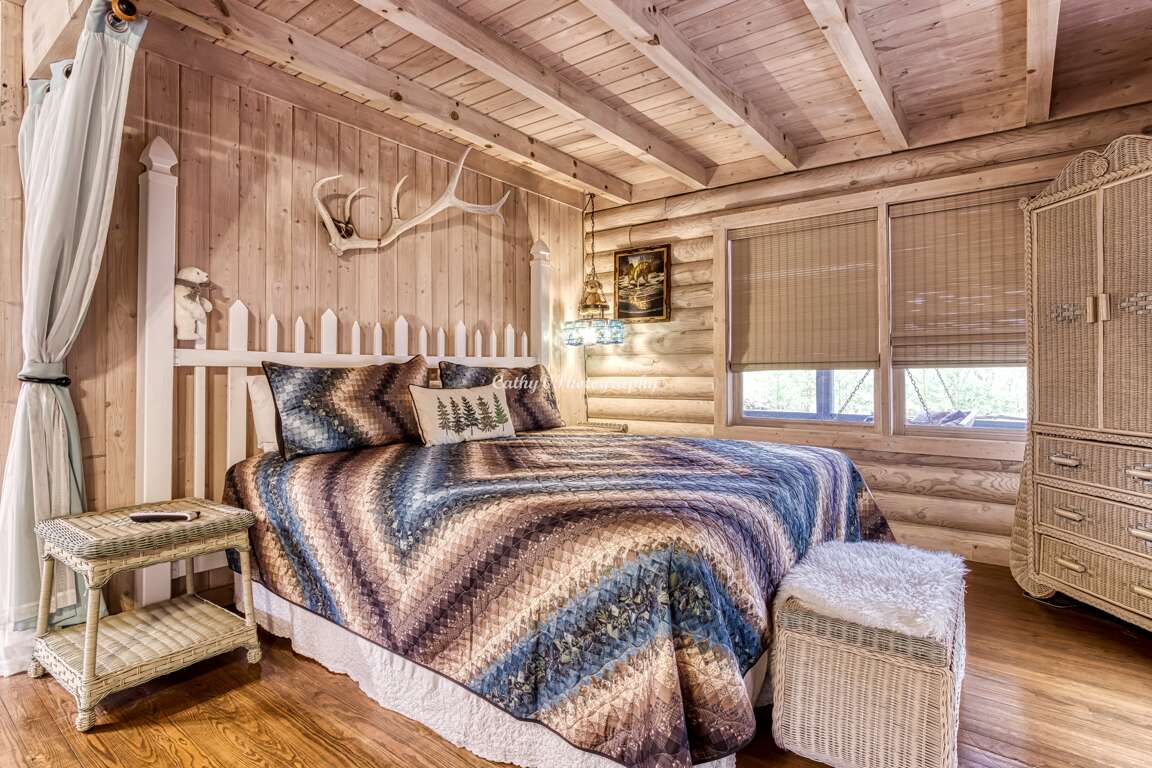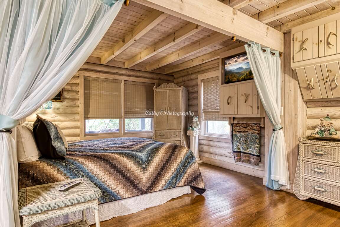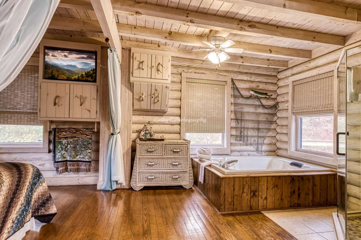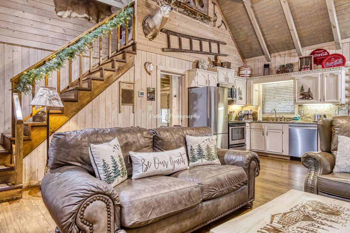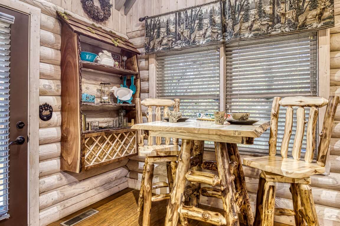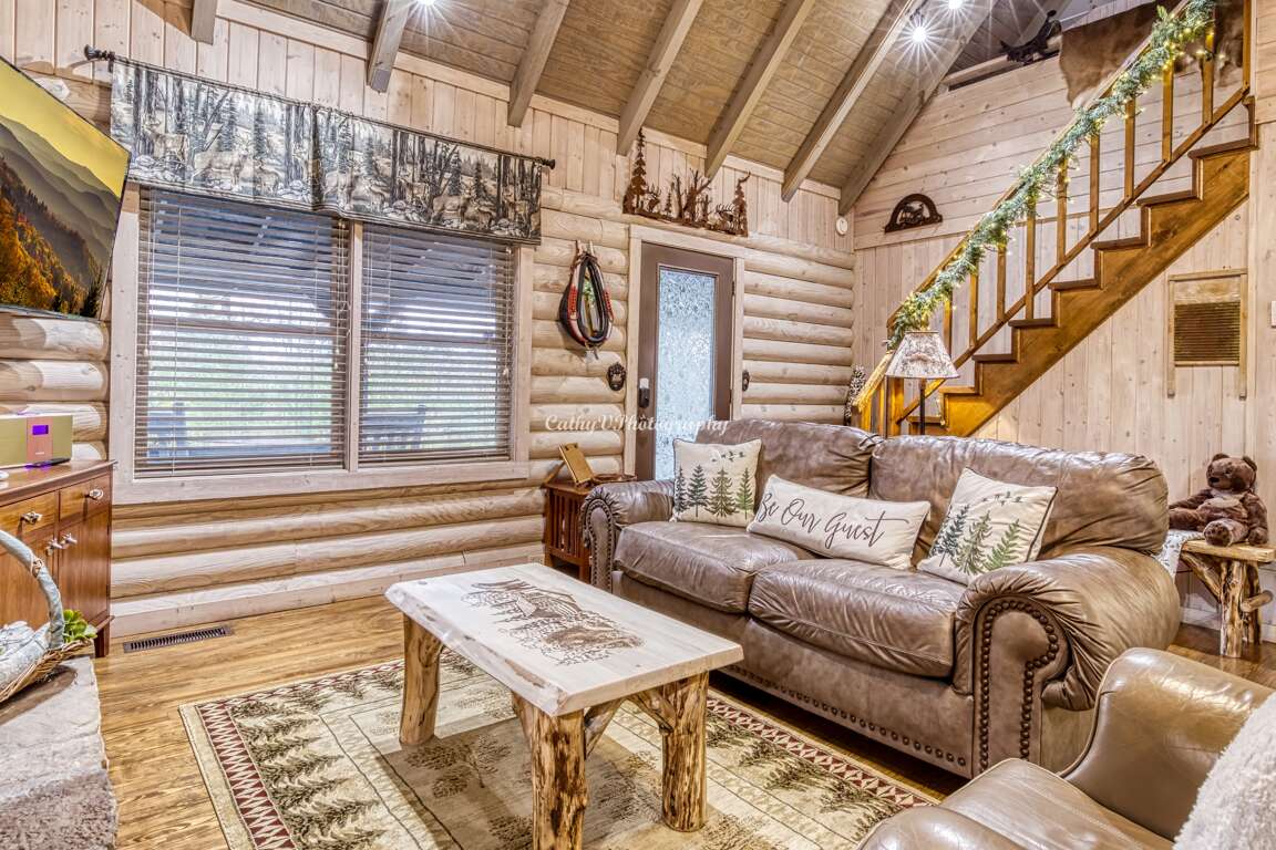 Upon entering your Smoky Mountain Getaway, an atmosphere of round logs, soaring ceilings, a flagstone gas fireplace with stunning decor surrounds you.